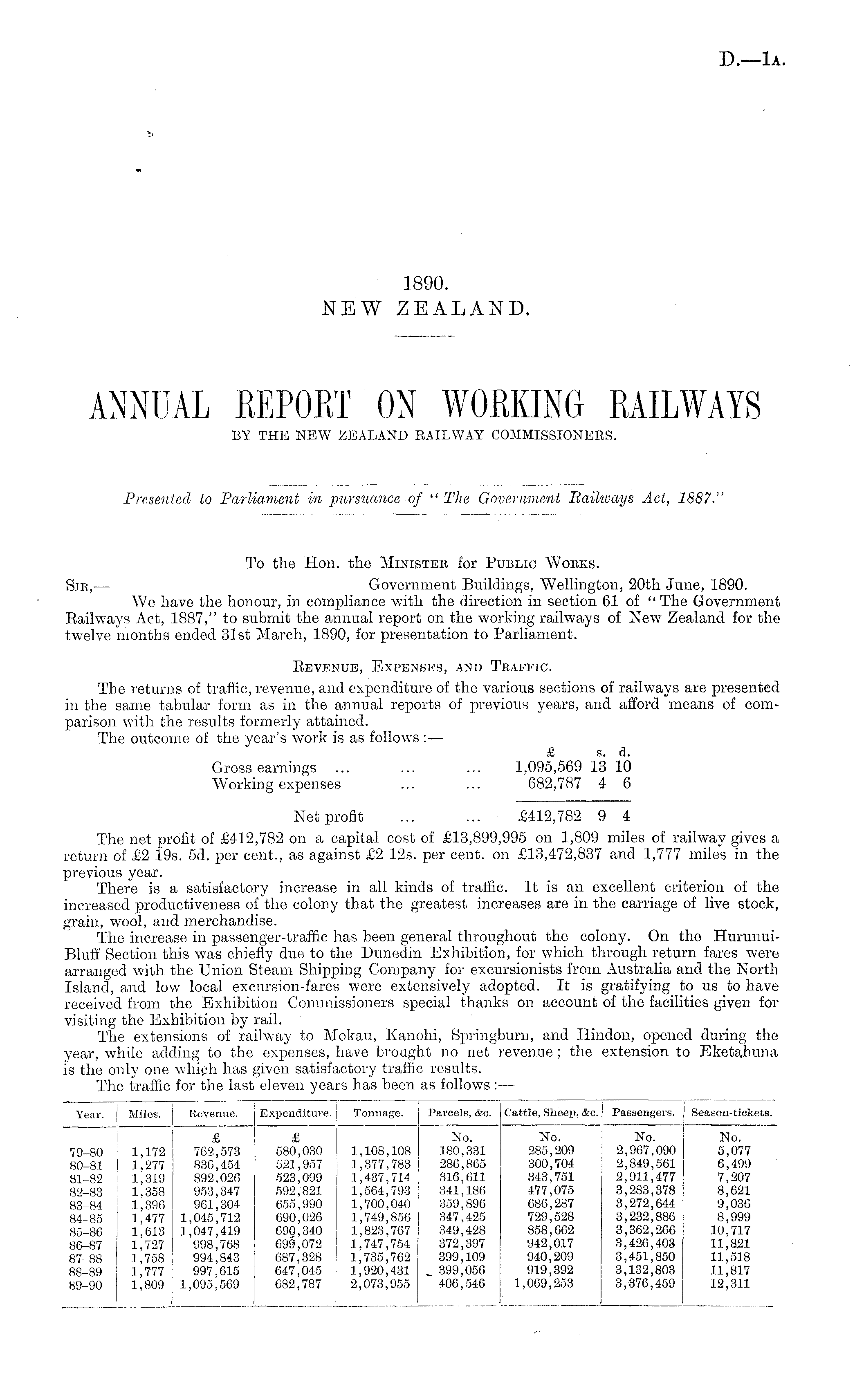 To the Hon. the Ministeb for Public Woeks. Sib, — Government Buildings, Wellington, 20th June, 1890. We have the honour, in compliance with the direction in section 61 of "The Government Railways Act, 1887," to submit the annual report on the working railways of New Zealand for the twelve months ended 31st March, 1890, for presentation to Parliament. Revenue, Expenses, and Traffic. The returns of traffic, revenue, and expenditure of the various sections of railways are presented in the same tabular form as in the annual reports of previous years, and afford means of comparison with the results formerly attained. The outcome of the year's work is as follows : — £ s. a. Gross earnings ... ... ... 1,095,569 13 10 Working expenses ... ... 682,787 4 6 Net profit ... ... £412,782 9 4 The net profit of £412,782 on a capital cost of £13,899,995 on 1,809 miles of railway gives a return of £2 19s. sd. per cent., as against £2 12s. per cent, on £13,472,837 and 1,777 miles in the previous year. There is a satisfactory increase in all kinds of traffic. It is an excellent criterion of the increased productiveness of the colony that the greatest increases are in the carriage of live stock, grain, wool, and merchandise. The increase in passenger-traffic has been general throughout the colony. On the HurunuiBluff Section this was chiefly due to the Dunedin Exhibition, for which through return fares were arranged with the Union Steam Shipping Company for excursionists from Australia and the North Island, and low local excursion-fares were extensively adopted. It is gratifying to us to have received from the Exhibition Commissioners special thanks on account of the facilities given for visiting the Exhibition by rail. The extensions of railway to Mokau, Kanohi, Sprmgburn, and Hindon, opened during the year, while adding to the expenses, have brought no net revenue; the extension to Eketajhuna is the only one which has given satisfactory traffic results. The traffic for the last eleven years has been as follows : —