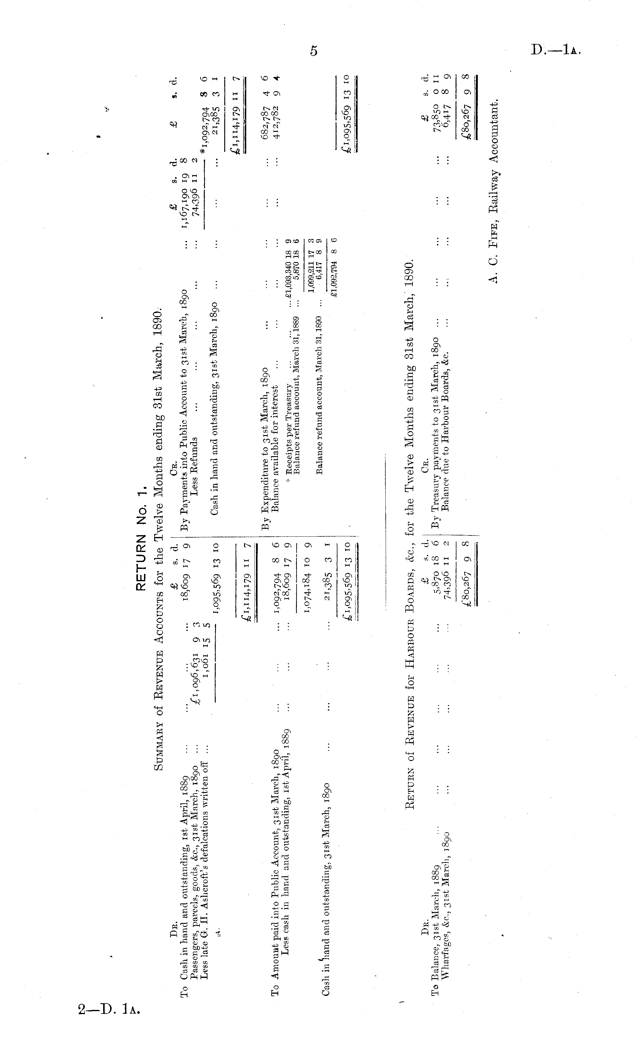 RETURN No. 1. Summary of Eevenue Accounts for the Twelve Months ending 31st March, 1890. Dr. £ s. cl. Ob. £ s. A. £ s. d. To Cash in hand and outstanding, ist April, 1889 ... ... ... ... 18,60917 9By Payments into Public Account to 31st March, 1890 ... 1,167,19019 8 Passengers, parcels, goods, &c., 31st March, 1890 ... 9 3 Less Refunds ... ... ... ... ... 74,396 11 2 Less late G. 11. Ashcroft's defalcations written off ... 1,061 15 5 — *i,092, 794 8 6 1,095,569 13 10 Cash in hand and outstanding, 31st March, 1890 ... ... ... ... 21,385 3 1 £1,114,179 11 7 £1,114,179 11 7 — ■ By Expenditure to 31st March, 1890 ... ... ... ... ... 682,787 4 6 To Amount paid into Public Account, 31st March, 1890 ... ... ... 1,092,794 8 6 Balance available for interest ... ... ... ... ... ... 412,782 9 4 Less cash in hand and outstanding, Ist April, 1889 ... ... ... 18,60917 9 ♦ Eeeeipts per Treasury £1,093,340 18 9 Balance refund account, March 31,1889 ... 5,870 18 6 1,074,184 10 9 1,099,21117 3 / ■ Balance refund account, March 31,1890 ... 6,417 8 9 Cash m hand and outstanding', 31st March, 1890 ... ... ... ... 21,38=; 11 ■ "' J ' y £1,092,794 8 6 £1,095,569 13 10 , £1,095,569 13 10 Return of Eevenue for Harbour Boards, &c, for the Twelve Months ending 31st March, 1890. I)e. £ s. d. Ce. £ s. d. To Balance, 31st March, 1889 ... ... ... ... ... ... 5,870 18 6By Treasury payments to 31st March, 1890 ... ... ... ... ... 73,850 011 Wharfages, &c, 31st March, 1890 ... ... ... ... ... 74,396 11 2 Balance due to Harbour Boards, &c. ... .., ... ... ... 6,417 8 9 £80,267 9 8 £80,267 9 8 A. C. Fife, Eailway Accountant.