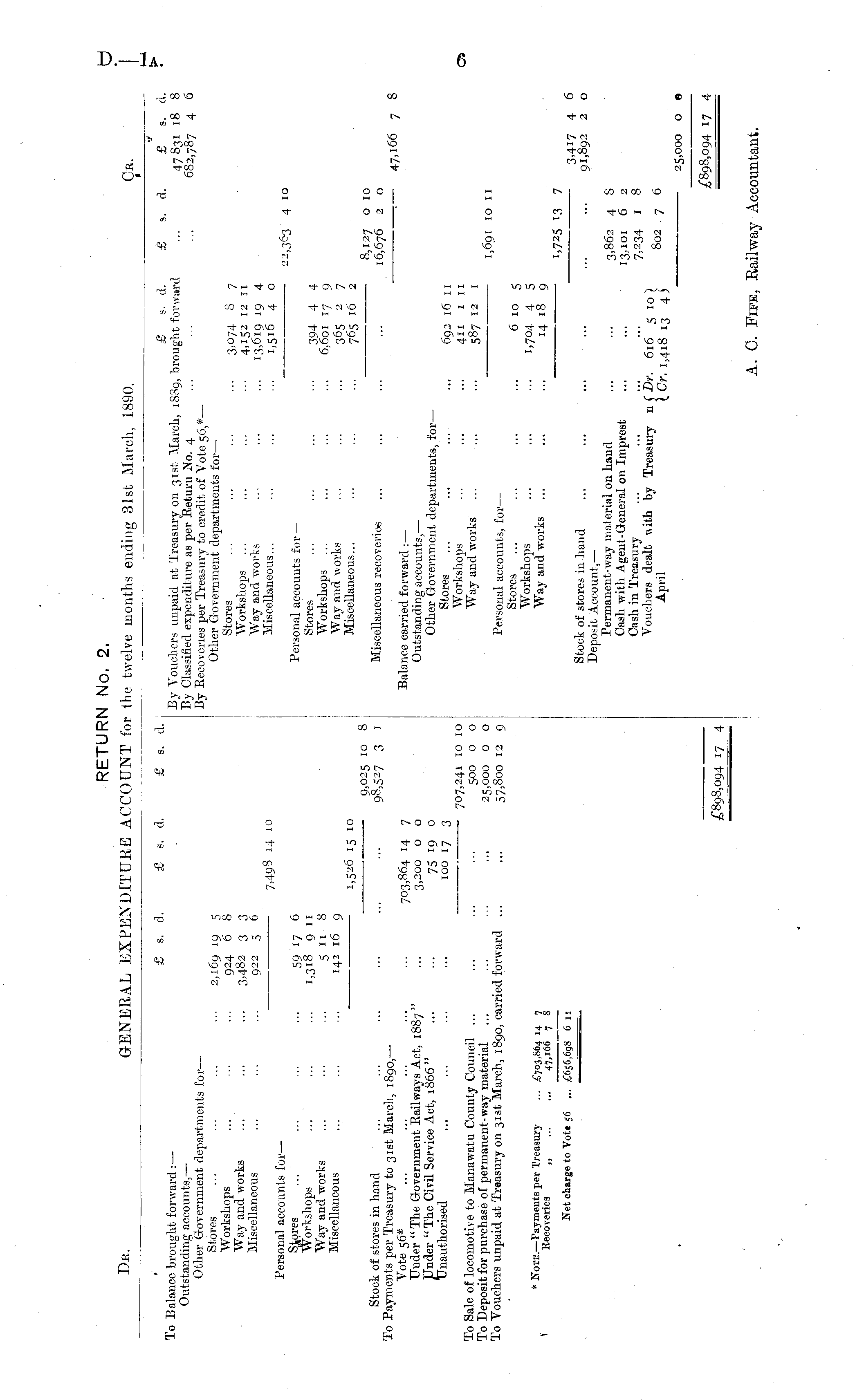 RETURN No. 2. Db. GENERAL EXPENDITURE ACCOUNT for the twelve months ending 31st March, 1890. Ok. ' £ s. a, £ s. d. £ s. d. £ s . d. £ s. d. £ s. d. lo .balance brought forward:— . By Touchers unpaid at Treasury on 31st March, 1889, brought forward ... 47831 18 8 Outstanding accounts,— By Classified expenditure as per Return No. 4 ... ... ... 682,787 4 6 Other Government departments for— By Recoveries per Treasury to credit of Vote 56,*— Stores ... ... ... ... 2,169 19 5 Other Government departments for— Workshops ... ... ... 924 6 8 Stores ... ... ... ... 3,074 8 7 Way and works ... ... ~. 3,482 3 3 Workshops ... ... ... 4,152 12 11 Miscellaneous ... ... ... 922 .5 6 Way and works .., ... ... 13,619 19 4 749S 14 10 Miscellaneous... ... ... ... 1,516 4 o Personal accounts for— . 22363 4 10 Scores ... ... ... ... 5917 6 Personal accounts for — Workshops ... ' ... ... 1,318 911 Stores ... ... ... ... 394 4 4 Way and works ... ... ... 511 8 Workshops ... ... ... 6,601 17 9 Miscellaneous ... ... ... 142169 Way and works 365 2 7 1,526 15 10 Miscellaneous... ... ... ... 765 16 2 9.025 10 8 8,127 o 10 Stock of stores m hand ... ... ... ... ... ... 98,527 3 : Miscellaneous recoveries ... ... ... ... 16,676 2 o To Payments per Treasury to 31st March, 1890,— 47166 7 8 Vote 56* ... ... ... ... ... 703,864 14 7 Balance carried forward:— Under" The Government Railways Act, 1887 " ... 3,200 o o Outstanding accounts,— Under "The Civil Service Act, 1866" ... ... 75 19 o Other Government departments, for— Unauthorised ... ... ... ... 100 17 3 Stores ... ... ... ... 692 16 11 707,241 10 10 Workshops ... ... ... 411 1 v To Sale of locomotive to Manawatu County Council ... ... ... ... 500 o 0 Way and works ... ... ... 587 12 1 To Deposit for purchase of permanent-way material ... ... ... ... 25,000 oo 1 601 10 11 To Vouchers unpaid at Treasury on 31st March, 1890, carried forward ... ... 57,800 12 9 I Personal accounts, for— Stores ... ... ... ... 6 10 5 Workshops ... ... ... 1,704 4 < Treasury Z^&m Way and works , 4 l 8 g 1,725 13 7 Net charge to Vote 56 ... £6*6,698 6 11 3,417 4 6 ' Stock of stores in hand ... ... ... ... ... ... 91,892 2 o Deposit Account,— Permanent-way material on hand ... ... 3,862 4 8 Cash with Agent-General on Imprest ... ... 13,101 6 2 Cash in Treasury ... ... ... ... 7,234 1 8 Vouchers dealt with by Treasury n f Dr. 616 <, 10) „ , April I Cr. 1,418 13 4) 802 7 6 25,000 O 8 £898,094 17 4 £898,094^17 4 A. C. Fife, Eailway Accountant.