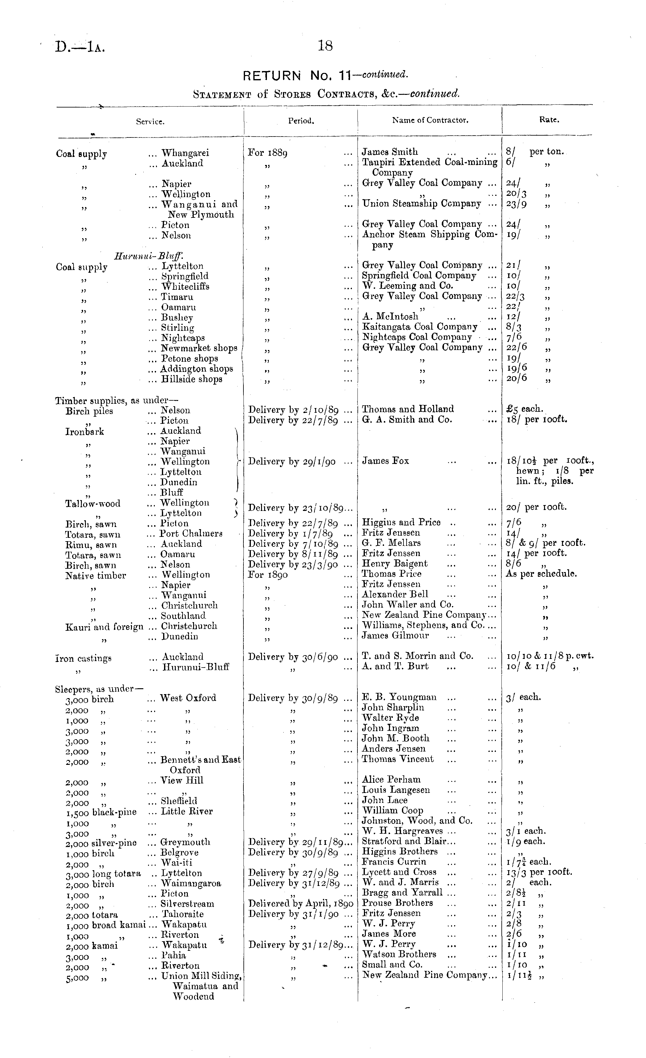 Service. Period. Name of Contractor. Rate. Coal supply ... Whangarei ... Auckland For 1889 James Smith Taupiri Extended Coal-mining Company Grey Valley Coal Company ... 8/ per ton. 6/ 3) ,, ... Napier ... Wellington ... Wanganui and Now Plymouth ,, ... Picton ... Nelson Union Steamship Company ... 24/ » 20/3 23/9 ,, ... >> Grey Valley Coal Company ... Anchor Steam Shipping Com24/ 19/ Hurunui-Bluff. Coal supply ... Lyttelton . Springfield ... Whitecliffs ... Timaru ... Oamaru ... Bushey j, ... Stirling „ ... Nightcaps ... Newmarket shops ... Petone shops j ... Addington shops ... Hillside shops pany ,, ,, j, Grey Valley Coal Company ... Springfield Coal Company W. Leeming and Co. Grey Valley Coal Company ... A.. Melntosh Kaitangata Coal Company ... Nightcaps Coal Company Grey Valley Coal Company ... 21/ 10/ 10/ 22/3 22/ 12/ 8/3 7/6 22/6 '9/ 19/6 20/6 ,, ,, ,j )> j, Timber supplies, as under — Birch piles ... Nelson ... Picton Ironbark ... Auckland \ ... Napier ... Wanganui ... Wellington r ... Lyttelton ... Dunedin ... Bluff Tallow-wood ... Wellington \ ... Lyttelton Birch, sawn ... Picton Totara, sawn ... Port Chalmers Rimu, sawn ... Auckland Totara., sawn ... Oamaru Birch, sawn ...Nelson Native timber ... Wellington ... Napier ... Wanganui ... Christchureh (1 ... Southland Kauri and foreign ... Christchureh ... Dunedin Delivery by 2/10/89 ... Delivery by 22/7/89 ... Delivery by 29/1/90 ... Delivery by 23/10/89... Delivery by 22/7/89 ... Delivery by 1/7/89 ... Delivery by 7/10/89 ... Delivery by 8/11/89 ... Delivery by 23/3/90 ... For 1890 Thomas and Holland G. A. Smith and Co. James Fox Higgins and Price .. Fritz Jeusscn G. F. Mellars Fritz Jenssen Henry Baigent Thomas Price Fritz Jenssen Alexander Bell John Waller and Co. New Zealand Pine Company... Williams, Stephens, and Co. ... James Gilmour £5 each. 18/ per 100ft. 18/ioi per 1 ooft., hewn; 1/8 per lin. ft., piles. 20/ per 1 ooft. 7/6 „ H/ » 8/ & 9/ per 100ft. 14/ per 100ft. 8/6 „ As per schedule. 1) ,, 11 >> ?) Iron coatings ... Auckland ... Hurunui-Bluff Delivery by 30/6/90 ... T. and S. Morrin and Co. A. and T. Burt 10/10 & 11/8 p. cwt. 10/ & 11/6 „ Sleepers, as under — 3,000 birch ... West Oxford 2,000 „ ■•• n 1,000 „ ■•■ !> . 3,000 „ ■■■ n 3,000 ,, ••• ji 2,OOO ,, ■•• >! 1,000 ,. ••■ Bennett's and East Oxford 2,000 „ ••■ View Hill 2,000 ,, ■■■ ji 2,000 „ ••■ Sheffield 1,500 black-pine ... Little River 1,000 ,, •■• )! 3,000 „ ... is 2,000 silver-pine ... Greymouth 1,000 birch ... Belgrove 2,000 „ ■•■ Wai-iti 3,000 long totara ..Lyttelton '2,000 birch ... Waimangaroa 1,000 „ ■■■ Picton 2,000 ,. ■•• Silverstream 2,000 totara ... Tahoraite 1,000 broad kamai... Wakftpfttu 1,000 „ ... Eirerton 2,000 kamai ... Wakapatu 3,000 „ ... i'ahia 2,000 ,, " ... Eirerton 5,000 „ ... Union Mill Siding, Waimatua and Woodeud Delivery by 30/9/89 ... ,, ... ,, ,, ., ,, ... ,, ,, ... 5) ' " Delivery by 29/11/89... Delivery by 30/9/89 ,., E. B. Youngrnan Jolm Sharplin Walter Eyde John Ingram John M. Booth Anders Jensen Thomas Vincent Alice Pcrham Louis Langesen John Lace William Coop Johnston, Wood, and Co. W. H. Hargreaves ... Stratford and Blair... Higgins Brothers ... Francis Currin Lycett and Cross W. and J. Harris ... Bragg and Yarrall ... Prouse Brothers Fritz Jenssen W. J. Perry James More W. J. Perry Wai son Brothers Small and Co. New Zealand Pine Company... 3/ each. )> » n )> )} It 3/1 each. 1/9 each. Delivery by 27/9/89 ... Delivery by 31/12/89 ... Delivered by April, 1890 Delivery by 31 /1 / 90 ... 1/7! each. 13/3 per 1 ooft. 2/ each. a/8* „ 2/11 „ 2/3 .. 2/8 „ 2/6 „ 1/10 „ 1/11 „ 1/10 „ i/llj » Delivery by 31/12/89... i, ,,