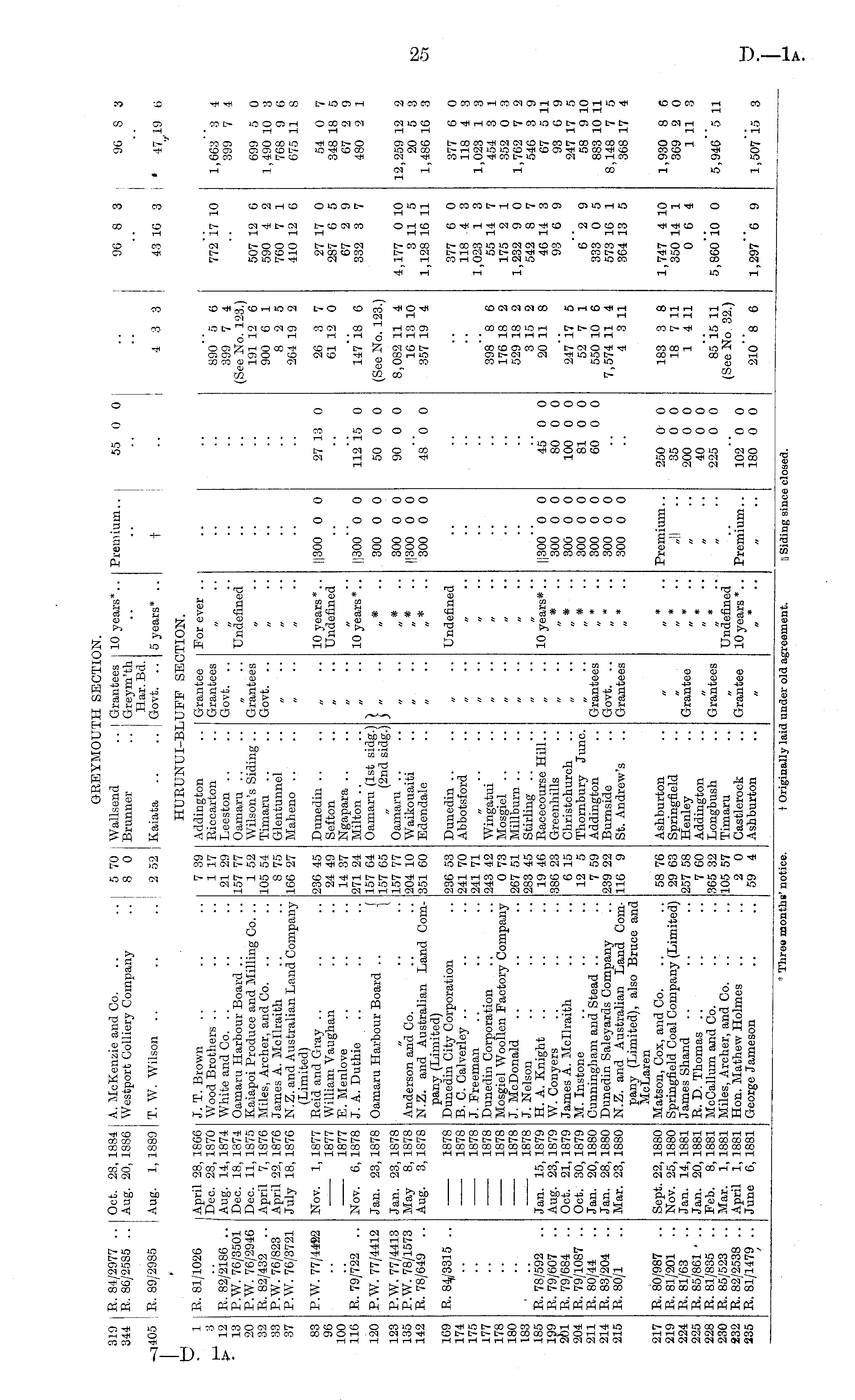 GREYMOUl jin. 319 344 R. 84/2977 .. R. 86/2585 .. R. 89/2985 Oct. 28, 1884 Aug. 20, 1886 A. McKenzie and Co. Westport Colliery Company 5 70 I 8 0 2 52 Wallsend .. I Brunner Kaiata .. .. j Grantees Greym'th Har.Bd. G0Yt. . . 10 years*.. 5 years* .. Premium.. 55 0 0 4 3 3 06 8 3 43 10 3 ! 96 8 3 —q405 P 1 £T 12 • 13 20 32 33 37 R. 81/1026 I R. 82/2186 .. P.W. 76/3501 P.W. 76/2946 R. 82/432 .. P.W. 76/823 P.W. 76/3721 Aug. 1, 1889 April 28, 1866 Dec. 28, 1870 Aug. 14, 1874 Dec. 18, 1874 Dec. 11, 1875 April 7, 1876 April 22, 1876 July 18, 1876 T. \V. Wilson .. .. .. i J. T. Brown Wood Brothers White and Co. .. Oamaru Harbour Board Kaiapoi Produce and Milling Co. .. Miles, Archer, and Co. James A. Mcllraith N.Z. and Australian Land Company (Limited) Reid and Gray William Vaughan E. Menlove J. A. Duthie Oamaru Harbour Board .. \ 7 39 1 17 21 29 157 77 1 52 105 54 8 75 166 27 HURUNUI-BL Addington Riccarton Leeston Oamaru Wilson's Siding .. Timaru Glentunnel Maheno ;UFF SEC Grantee Grantees Govt. .. ITION. For ever .. i t I 890 5 6 399 7 4 (See No. 123.) 191 12 6 900 6 1 8 2 5 264 19 2 772 17 10 507 12 G 590 4 2 760 7 1 410 12 6 • 47 19 6 1,663 3 4 399 7 4 Grantees Govt. .. Undefined 699 5 0 1,490 10 3 768 9 6 675 11 8 83 96 100 116 120 P.W. 77/44S2 R. 79/722 .. Nov. 1, 1877 1877 1877 Nov. 6, 1878 236 45 24 49 14 37 271 24 157 64 157 65 157 77 204 10 351 60 Dunedin Sefton Ngapara Milton Oamaru (1st sidg.) „ (2nd sidg.) Oamaru Waikouaiti Edendale 10 years*.. Undefined 10 years *.. H300 0 0 ||300 0 0 27 13 0 11215 0 26 3 7 61 12 0 147 'l8 6 27 17 0 287 6 5 67 2 9 332 3 7 54 0 7 348 18 5 67 2 9 480 2 1 P.W. 77/4412 Jan. 23, 1878 }. .. » * 300 0 0 50 0 0 (See No. 123.) 12,259 12 2 20 5 3 1,486 16 3 123 135 142 P.W. 77/4413 P.W. 78/1573 R. 78/649 .. Jan. 23, 1878 May 8, 1878 Aug. 3, 1878 Anderson and Co. N.Z. and Australian Land Company (Limited) Dunedin City Corporation B. C. Calverley .. J. Freeman Dunedin Corporation Mosgiel Woollen Factory Company J. McDonald J. Nelson H. A. Knight .. W. Conyers James A. Mcllraith M. Instone Cunningham and Stead Dunedin Saleyards Company N.Z. and Australian Land Company (Limited), also Bruce and McLaren Matson, Cox, and Co. Springfield Coal Company (Limited) James Shand R. D. Thomas McCallum and Co. Miles, Archer, and Co. Hon. Mathew Holmes George Jameson " * 300 0 0 ||300 0 0 300 0 0 90 0 0 48 0 0 8,082 11 4 16 13 10 357 19 4 4,177 0 10 3 11 5 1,128 16 11 169 174 175 177 178 180 183 185 199 201 204 211 214 215 R. 84./3315 .. • R. 78/592 .. R. 79/607 .. R. 79/684 .. R. 79/1087 .. R. 80/44 R. 83/204 .. R. 80/1 1878 1878 1878 1878 1878 1878 1878 Jan. 15, 1879 Aug. 23, 1879 Oct. 21, 1879 Oct. 30, 1879 Jan. 20, 1880 Jan. 28, 1880 Mar. 23, 1880 236 53 241 70 241 71 243 42 0 73 267 51 283 45 19 46 386 23 6 15 12 5 7 59 239 22 116 9 Dunedin Abbotsford Wingatui Mosgiel .. Millburn Stirling Racecourse Hill.. Greenhills Christchurch Thornbury June. Addington Burnside St. Andrew's " „ Undefined 10 years* .. * ||300 0 0 300 0 0 300 0 0 300 0 0 300 0 0 300 0 0 300 0 0 45 0 0 80 0 0 100 0 0 81 0 0 60 0 0 398 8 6 176 18 2 529 18 2 3 15 2 20 11 8 247*17 5 52 7 1 550 10 6 7,574 11 4 4 3 11 377 6 0 118 4 3 1,023 1 3 55 14 7 175 2 1 1,232 9 0 542 8 7 46 14 3 93 6 9 6**2 9 333 0 5 573 16 1 364 13 5 377 6 0 118 4 3 1,023 1 3 454 3 1 352 0 3 1,762 7 2 546 3 9 67 5 11 93 6 9 247 17 5 58 9 10 883 10 11 8,148 7 5 368 17 4 Grantees Govt. .. Grantees ' „- .. 217 219 224 225 228 230 232 235 R. 80/987 .. R. 81/201 .. R. 81/63 R. 85/861 • .. R. 81/835 .. R. 85/523 .. R. 82/2538 .. R. 81/1479 .. Sept. 22, 1880 Nov. 25, 1880 Jan. 14, 1881 Jan. 20, 1881 Feb. 8, 1881 Mar. 1, 1881 April 1, 1881 June 6, 1881 58 76 29 63 257 58 7 60 365 32 105 57 2 0 59 4 Ashburton Springfield Henley Addington Longbush Timaru Castlerock Ashburton Grantee * " , ■ ■ * "I • • -: • • Premium.. 250 0 0 35 0 0 200 0 0 40 0 0 225 0 0 183 3 8 18 7 11 1 4 11 1,747 4 10 350 14 1 0 6 4 1,930 8 6 369 2 0 1 11 3 Grantees " • • 85 15 11 (See No. 32.) 5,86010 0 5,946 5 11 Grantee Undefined 10 years *.. Premium.. 102 0 0 180 0 0 1,507 is 3 2io"s 6 1,297**6 9 » . ■•