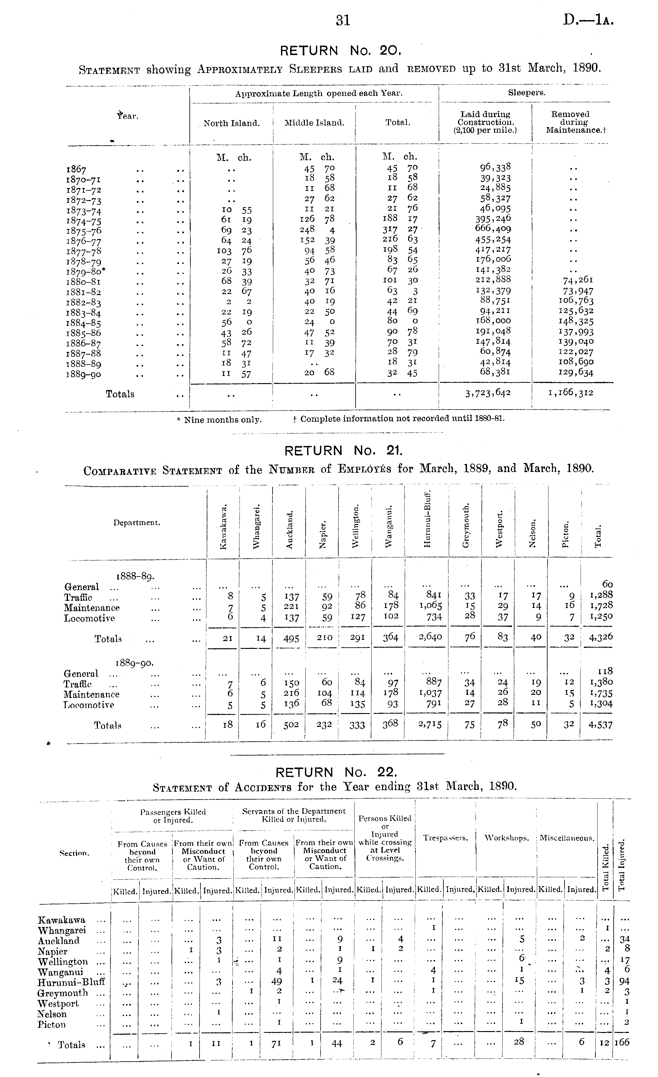 RETURN No. 20. Statement showing Approximately Sleepers laid and removed up to 31st March, 1890.