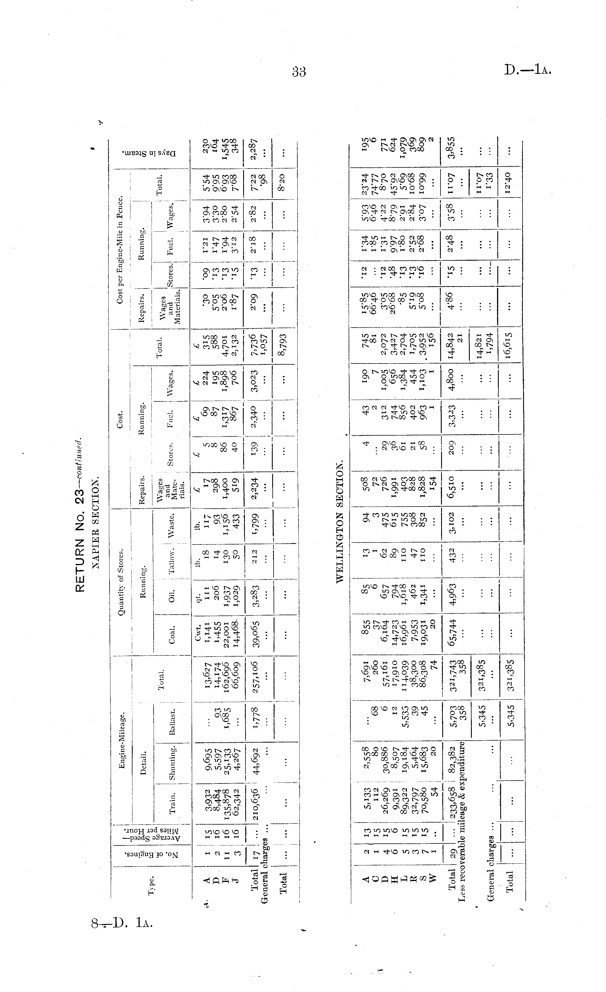 I *\ Engine-Mileage. Quantity of Stores. Cost. Cost per Engine-Mile in Peuce. Type. a a o d 2 <^l Detail. Ballast. Total. I Coal. Running. Run Oil. ming. Tallow. ; Waste. Repairs. Wages , Mat , St—" rials. 1 Running. Fuel, 1 Wages. Repairs. Running. Q Train. Shunting. Total. Wages ! I TotaL and .Stores.! Fuel. Wages. Materials. r> 3 I ! IS 3.932 2 ; 16 8,484 II I 16 I3S>878 3 j 16 62,342 17 ... 210,636 iharges ... 1-IH - 3.932 8,484 135,878 62,342 9.69S 5.S97 4,267 I 13.627 93 ; 14,174 1,685 [ 162,696 66,609 Cwt. 1,141 1.455 22,001 14,468. qt. Ill 206 1,937 1,029 lb. 18 14 130 5° 1b. [ 117 ! 93 433 j £ 17 298 1,400 5*9 £ £ £ 5 69 224 8 87 : 195 86 1,317 ! 1,898 40 867 ! 706 31s 588 I 4,701 2,132 7.736 8,793 ■30 5'05 2'o6 I'87 "09 j I '2 1 •13 ! I'47 -I 3 ; i"94 •IS I 3'I2 ■13 ; 2'i8 1 j 3'94 3'3° 2-80 2-54 S'S4 9'9S 6'93 7-68 2; II 323< 16, 1,54; 34! Total General c 44,692 1.778 I 257,106 39,o6s 3.283 212 1.799 I 2,234 139 I 2,340 3,023 ! i i 2'O9 2-82 7'22 '< •98 I 8'2O 2,28: 2,2: ... ... Total ... -" -