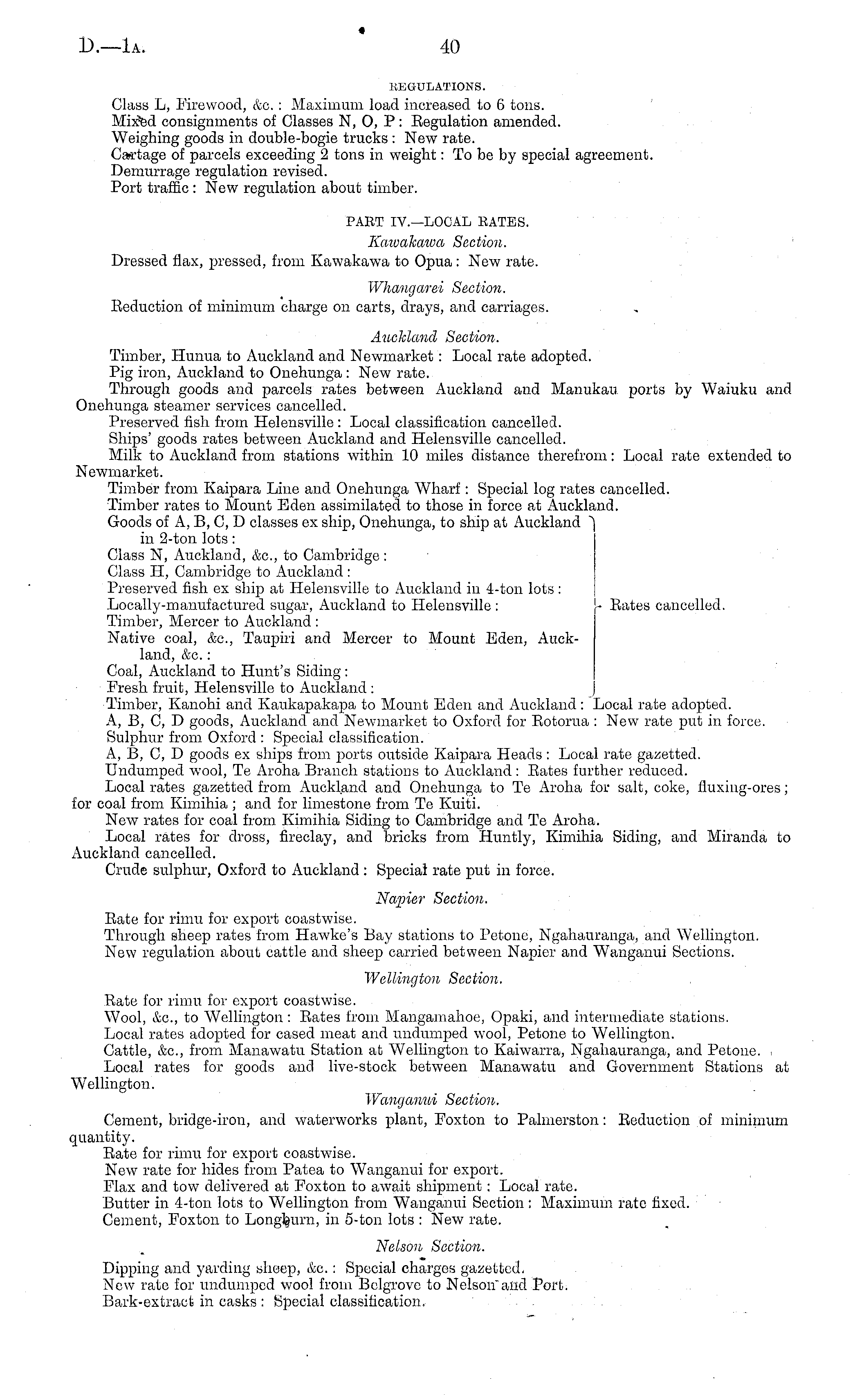 IiEUULATIONS. Class L, Firewood, &c.: Maximum load increased to 6 tons. Mixted consignments of Classes N, O, P: Eegulation amended. Weighing goods in double-bogie trucks : New rate. Cartage of parcels exceeding 2 tons in weight: To be by special agreement. Demurrage regulation revised. Port traffic : New regulation about timber. PART IV.—LOCAL KATES. Kaivakawa Section. Dressed flax, pressed, from Kawakawa to Opua: New rate. IVhangarei Section. Eeduction of minimum charge on carts, drays, and carriages. Auckland Section. Timber, Hunua to Auckland and Newmarket: Local rate adopted. Pig iron, Auckland to Onehunga : New rate. Through goods and parcels rates between Auckland and Manukau ports by Waiuku and Onehunga steamer services cancelled. Preserved fish from Helensville: Local classification cancelled. Ships' goods rates between Auckland and Helensville cancelled. Milk to Auckland from stations within 10 miles distance therefrom: Local rate extended to Newmarket. Timber from Kaipara Line and Onehunga Wharf: Special log rates cancelled. Timber rates to Mount Eden assimilated to those in force at Auckland. Goods of A, B, C, D classes ex ship, Onehunga, to ship at Auckland "] in 2-ton lots: Class N, Auckland, etc., to Cambridge: Class H, Cambridge to Auckland : Preserved fish ex ship at Helensville to Auckland in 4-ton lots: Locally-manufactured sugar, Auckland to Helensville : [- Kates cancelled. Timber, Mercer to Auckland : Native coal, &c, Taupiri and Mercer to Mount Eden, Auckland, &c.: Coal, Auckland to Hunt's Siding : Fresh fruit, Helensville to Auckland : Timber, Kanohi and Kaukapakapa to Mount Eden and Auckland : Local rate adopted. A, B, C, D goods, Auckland and Newmarket to Oxford for Eotorua : New rate put in force. Sulphur from Oxford : Special classification. A, B, C, D goods ex ships from ports outside Kaipara Heads : Local rate gazetted. Undumped wool, Te Aroha Branch stations to Auckland: Rates further reduced. Local rates gazetted from Auckland and Onehunga to Te Aroha for salt, coke, fluxing-ores; for coal from Kimihia ; and for limestone from Te Kuiti. New rates for coal from Kimihia Siding to Cambridge and Te Aroha. Local rates for dross, fireclay, and bricks from Huntly, Kimihia Siding, and Miranda to Auckland cancelled. Crude sulphur, Oxford to Auckland : Special rate put in force. Napier Section. Rate for rimu for export coastwise. Through sheep rates from Hawke's Bay stations to Petoue, Ngahauranga, and Wellington. New regulation about cattle and sheep carried between Napier and Wanganui Sections. Wellington Section. Rate for rimu for export coastwise. Wool, &C, to Wellington : Rates from Mangamahoe, Opaki, and intermediate stations. Local rates adopted for cased meat and undumped wool, Petone to Wellington. Cattle, &c, from Manawatu Station at Wellington to Kaiwarra, Ngahauranga, and Petone. Local rates for goods and live-stock between Manawatu and Government Stations at Wellington. Wanganui Section. Cement, bridge-iron, and waterworks plant, Foxton to Palmerston: Reduction of minimum quantity. Rate for rimu for export coastwise. New rate for hides from Patea to Wanganui for export. Flax and tow delivered at Foxton to await shipment : Local rate. Butter in 4-ton lots to Wellington from Wanganui Section; Maximum rate fixed. Cement, Foxton to Longfeurn, in 5-ton lots : New rate. Nelson Section. Dipping and yarding sheep, &c.: Special charges gazetted. New rate for undumped wool from Belgrovc to Nelson'and Port. Bark-extract in casks : Special classification.