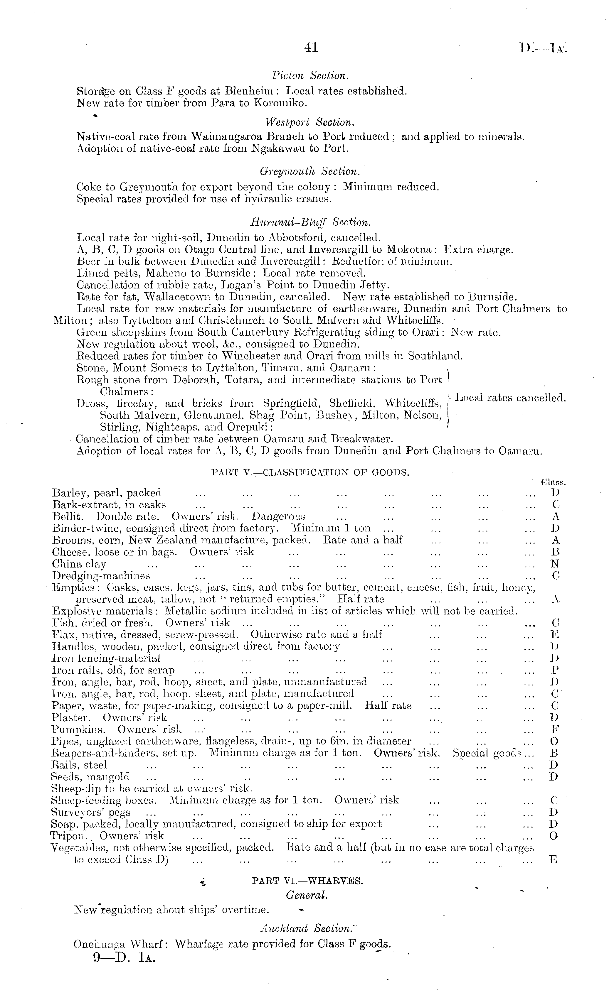 Picton Section. Storalge on Class 1' goods at Blenheim : Local rates established. New rate for timber from Para to Koromiko. Westport Section. Native-coal rate from Waimangaroa Branch to Port reduced ; and applied to minerals. Adoption of native-coal rate from Ngakawau to Port. Greymouth Section. Coke to Greymouth for export beyond the colony : Minimum reduced. Special rates provided for use of hydraulic, cranes. Ilurunui-hluff Section. Local rate for night-soil, Dunedin to Abbotsford, cancelled. A, B, C, D goods on Otago Central line, and Invercargill to Mokotua : Extra charge. Beer in bulk between Dunedin and Invercargill: Beduction of minimum. Limed pelts, Maheno to Burnside : Local rate removed. Cancellation of rubble rate, Logan's Point to Dunedin Jetty. Eate for fat, Wallace-town to Dunedin, cancelled. New rate established to Burnside. Local rate for raw materials for manufacture of earthenware, Dunedin and Port Chalmers to Milton ; also Lyttelton and Christchurch to South Malvern and Whitecliffs. Green sheepskins from South Canterbury Refrigerating siding to Orari: New rate. New regulation about wool, &c, consigned to Dunedin. Beduced rates for timber to Winchester and Orari from mills in Southland. Stone, Mount Somers to Lyttelton, Titnaru, and Oamaru : , Bough stone from Deborah, Totara, and intermediate stations to Port | Chalmers: I T , , n , Dross, fireclay, and bricks from Springfield, Sheffield, Wtatecliffs, f ijOcal rates callcellcrtSouth Malvern, Glentunnel, Shag Point, Bushey, Milton, Nelson, j Stirling, Nightcaps, and Orepuki: / Cancellation of timber rate between Oamaru and Breakwater. Adoption of local rates for A, B, C, D goods from Dunedin and Port Chalmers to Oamaru. PART V.—CLASSIFICATION OF GOODS. Class. Barley, pearl, packed ... ... ... ... ... ... ... ... D Bark-extract, in casks ... ... ... ... ... ... ... ... C Bellit. Double rate. Owners'risk. Dangerous ... ... ... ... ... A Binder-twine, consigned direct from factory. Minimum 1 ton ... ... ... ... D Brooms, corn, New Zealand manufacture, packed. Bate and a half ... ... ... A Cheese, loose or in bags. Owners'risk ... ... ... ... ... ... B China clay ... ... ... ... ... ... ... ... ... N Dredging-machines ... ... ... ... ... ... ... ... 0 Empties : Casks, cases, kegs, jars, tins, and tubs for butter, cement, cheese, fish, fruit, honey, preserved meat, tallow, not " returned empties." Half rate ... ... ... A Explosive materials : Metallic sodium included in list of articles which will not be carried. Fish, dried or fresh. Owners'risk ... ... ... ... ... ... ... 0 Flax, native, dressed, screw-pressed. Otherwise rate and a half ... ... ... E Handles, wooden, packed, consigned direct from, factory ... ... ... ... D Iron fencing-material ... ... ... ... ... ... ... ... J > Iron rails, old, for scrap ... ... ... ... ... ... .... ... P Iron, angle, bar, rod, hoop, sheet, and plate, unmanufactured ... ... ... ... j) Iron, angle, bar, rod, hoop, sheet, and plate, manufactured ... ... ... ... C Paper, waste, for paper-making, consigned to a paper-mill. Half rate ... ... ... C Plaster. Owners'risk ... ... ... ... ... ... .. ... D Pumpkins. Owners'risk ... ... ... ... ... ... ... ... F Pipes, uuglazed earthenware, flangeless, drain-, up to 6in. in diameter ... ... ... O Eeapers-and-binders, set up. Minimum charge as for 1 ton. Owners'risk. Special goods... B Bails, steel ... ... ... ... ... ... ... ... ... D Seeds, mangold ... ... .. ... ... ... ... ... ... D Sheep-dip to be carried at owners' risk. Sheep-feeding boxes. Minimum charge as for 1 ton. Owners'risk ... ... "... C Surveyors'pegs ... ... ... ... ... ... ... ... ... I> Soap, packed, locally manufactured, consigned to ship for export ... ... ... D Tripoli. Owners'risk ... ... ... ... ... ... ... ... O Vegetables, not otherwise specified, packed. Bate and a half (but in no case are total charges to exceed Class D) ... ... ... ... ... ... ... ... E i PART VI.—WHABVES. General. New regulation about ships' overtime. - Auckland Section.' Onehuntra Wharf: W Tharfage rate provided for Class F goods. 9—D. la.