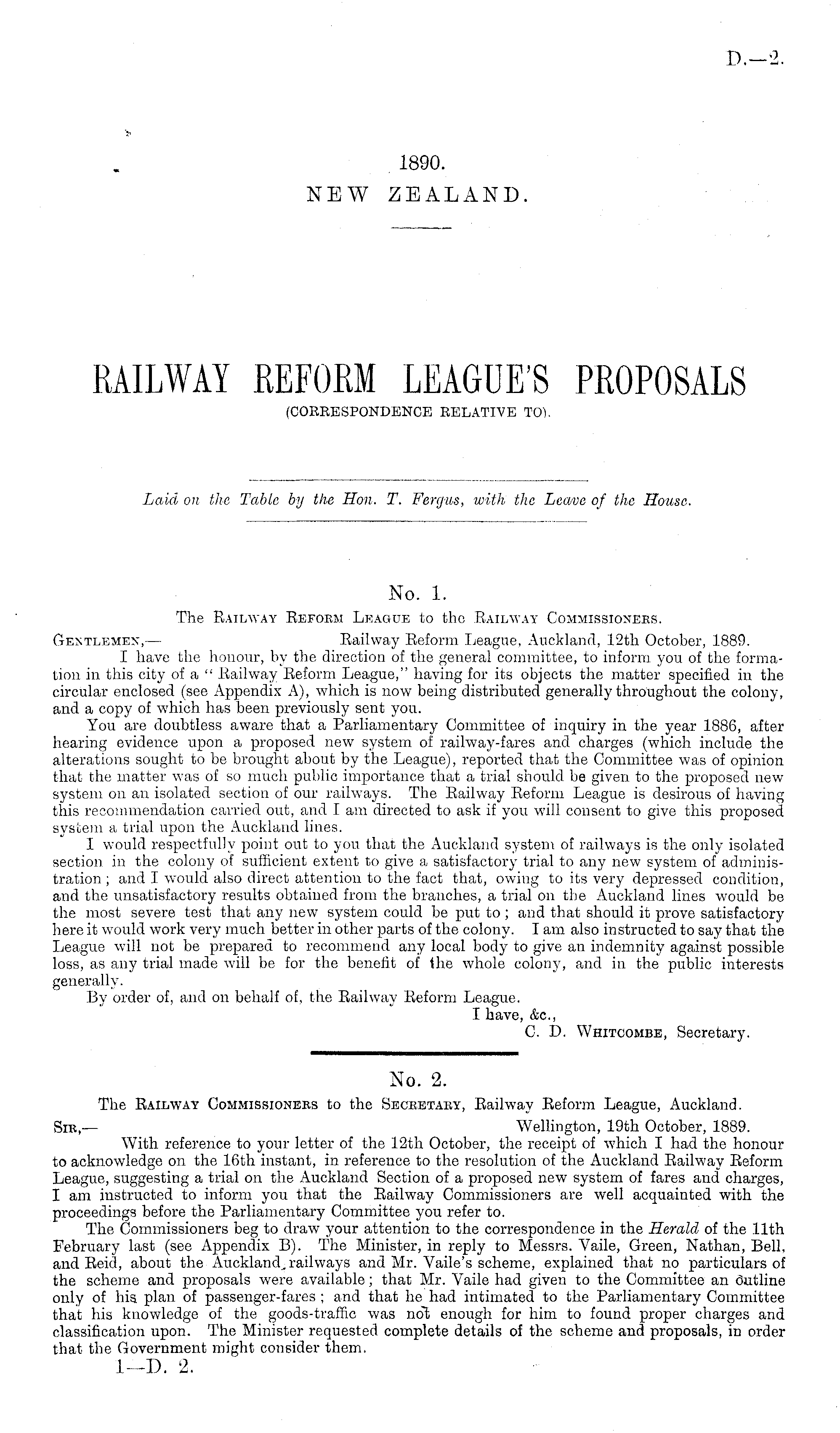 No. 1. The Eailway Eeform League to the Eailway Commissioners, Gentlemen, — Eailway Eeform League, Auckland, 12th October, 1889. I have the honour, by the direction of the general committee, to inform you of the formation in this city of a " Eailway Eeform League," having for its objects the matter specified in the circular enclosed (see Appendix A), which is now being distributed generally throughout the colony, and a copy of which has been previously sent you. You are doubtless aware that a Parliamentary Committee of inquiry in the year 1886, after hearing evidence upon a proposed new system of railway-fares and charges (which include the alterations sought to be brought about by the League), reported that the Committee was of opinion that the matter was of so much public importance that a trial should be given to the proposed new system on an isolated section of our railways. The Eailway Eeform League is desirous of having this recommendation carried out, and I am directed to ask if you will consent to give this proposed system a trial upon the Auckland lines. I would respectfully point out to you that the Auckland system of railways is the only isolated section in the colony of sufficient extent to give a satisfactory trial to any new system of administration; and I would also direct attention to the fact that, owing to its very depressed condition, and the unsatisfactory results obtained from the branches, a trial on the Auckland lines would be the most severe test that any new system could be put to ; and that should it prove satisfactory here it would work very much better in other parts of the colony. lam also instructed to say that the League will not be prepared to recommend any local body to give an indemnity against possible loss, as any trial made will be for the benefit of the whole colony, and in the public interests generally. By order of, and on behalf of, the Eailway Eeform League. I have, &c, C. D. Whitcombe, Secretary.