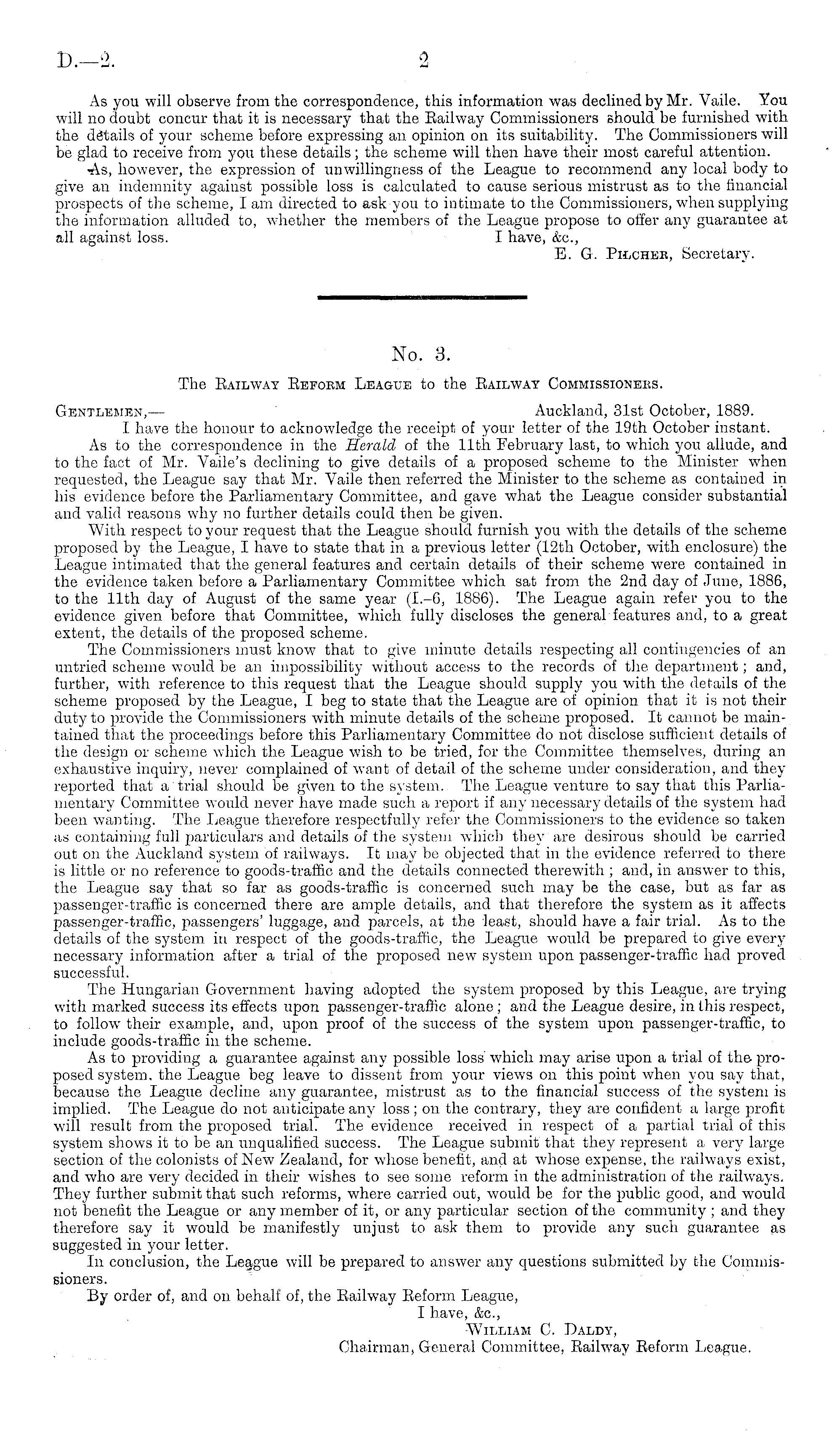 No. 3. The Eailway Eeform League to the Bail way Commissioners. Gentlemen, — Auckland, 31st October, 1889. I have the honour to acknowledge the receipt of your letter of the 19th October instant. As to the correspondence in the Herald of the 11th February last, to which you allude, and to the fact of Mr. Vaile's declining to give details of a proposed scheme to the Minister when requested, the League say that Mr. Vaile then referred the Minister to the scheme as contained in his evidence before the Parliamentary Committee, and gave what the League consider substantial and valid reasons why no further details could then be given. With respect to your request that the League should furnish you with the details of the scheme proposed by the League, I have to state that in a previous letter (12th October, with enclosure) the League intimated that the general features and certain details of their scheme were contained in the evidence taken before a Parliamentary Committee which sat from the 2nd day of June, 1886, to the 11th day of August of the same year (1.-6, 1886). The League again refer you to the evidence given before that Committee, which fully discloses the general features and, to a great extent, the details of the proposed scheme. The Commissioners must know that to give minute details respecting all contingencies of an untried scheme would be an impossibility without access to the records of the department; and, further, with reference to this request that the League should supply you with the details of the scheme proposed by the League, I beg to state that the League are of opinion that it is not their duty to provide the Commissioners with minute details of the scheme proposed. It cannot be maintained that the proceedings before this Parliamentary Committee do not disclose sufficient details of the design or scheme which the League wish to be tried, for the Committee themselves, during an exhaustive inquiry, never complained of want of detail of the scheme under consideration, and they reported that a trial should be gwen to the system. The League venture to say that this Parliamentary Committee would never have made such a report if any necessary details of the system had been wanting. The League therefore respectfully refer the Commissioners to the evidence so taken as containing full particulars and details of the system which they are desirous should be carried out on the Auckland system of railways. It may be objected that in the evidence referred to there is little or no reference to goods-traffic and the details connected therewith ; and, in answer to this, the League say that so far as goods-traffic is concerned such may be the case, but as far as passenger-traffic is concerned there are ample details, and that therefore the system as it affects passenger-traffic, passengers' luggage, and parcels, at the least, should have a fair trial. As to the details of the system in respect of the goods-traffic, the League would be prepared to give every necessary information after a trial of the proposed new system upon passenger-traffic had proved successful. The Hungarian Government having adopted the system proposed by this League, are trying with marked success its effects upon passenger-traffic alone ; and the League desire, in this respect, to follow their example, and, upon proof of the success of the system upon passenger-traffic, to include goods-traffic in the scheme. As to providing a guarantee against any possible loss which may arise upon a trial of the proposed system, the League beg leave to dissent from your views on this point when you say that, because the League decline any guarantee, mistrust as to the financial success of the system is implied. The League do not anticipate any loss; on the contrary, they are confident a large profit will result from the proposed trial. The evidence received in respect of a partial trial of this system shows it to be an unqualified success. The League submit that they represent a very large section of the colonists of New Zealand, for whose benefit, and at whose expense, the railways exist, and who are very decided in their wishes to see some reform in the administration of the railways. They further submit that such reforms, where carried out, would be for the public good, and wxmld not benefit the League or any member of it, or any particular section of the community ; and they therefore say it would be manifestly unjust to ask them to provide any such guarantee as suggested in your letter. In conclusion, the League will be prepared to answer any questions submitted by the Commissioners. By order of, and on behalf of, the Bailway Eeform League, I have, &c, -William C. Daldy, Chairman, General Committee, Eailway Eeform League.