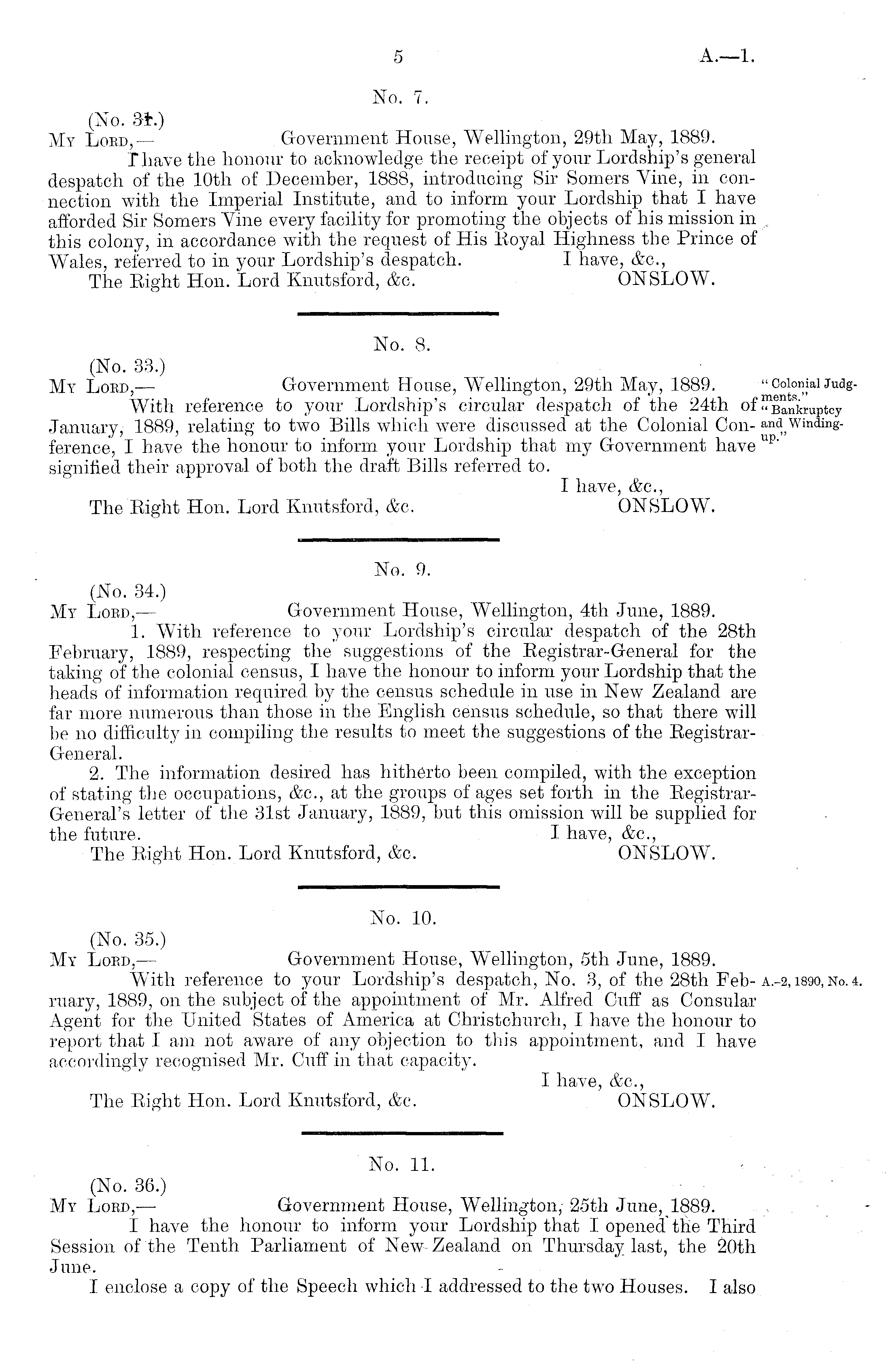No. 10. (No. 35.) My Lord,— Government House, Wellington, sth June, 1889. With reference to your Lordship's despatch, No. 3, of the 28th February, 1889, on the subject of the appointment of Mr. Alfred Cuff as Consular Agent for the United States of America at Christchurch, I have the honour to report that I am not aware of any objection to this appointment, and I have accordingly recognised Mr. Cuff in that capacity. I have, &c, The Eight Hon. Lord Knutsford, &c. ONSLOW.