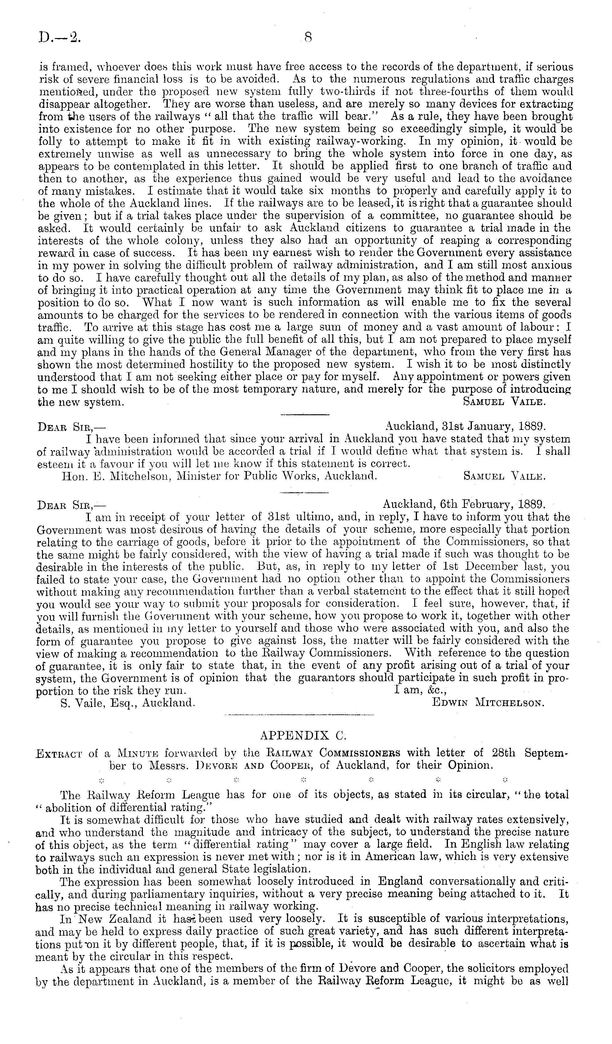 is framed, whoever does this work must have free access to the records of the department, if serious risk of severe financial loss is to be avoided. As to the numerous regulations and traffic charges mentioned, under the proposed new system fully two-thirds if not three-fourths of them would disappear altogether. They are worse than useless, and are merely so many devices for extracting from the users of the railways " all that the traffic will bear." As a rule, they have been brought into existence for no other purpose. The new system being so exceedingly simple, it would be folly to attempt to make it fit in with existing railway-working. In my opinion, it would be extremely unwise as well as unnecessary to bring the whole system into force in one day, as appears to be contemplated in this letter. It should be applied first to one branch of traffic and then to another, as the experience thus gained would be very useful and lead to the avoidance of many mistakes. I estimate that it would take six months to properly and carefully apply it to the whole of the Auckland lines. If the railways are to be leased, it is right that a guarantee should be given; but if a trial takes place under the supervision of a committee, no guarantee should be asked. It would certainly be unfair to ask Auckland citizens to guarantee a trial made in the interests of the whole coiony, unless they also had an opportunity of reaping a corresponding reward in case of success. It has been my earnest wish to render the Government every assistance in my power in solving the difficult problem of railway administration, and I am still most anxious to do so. I have carefully thought out all the details of my plan, as also of the method and manner of bringing it into practical operation at any time the Government may think fit to place me in a position to do so. What I now want is such information as will enable me to fix the several amounts to be charged for the services to be rendered in connection with the various items of goods traffic. To arrive at this stage has cost me a large sum of money and a vast amount of labour: I am quite willing to give the public the full benefit of all this, but I am not prepared to place myself and my plans in the hands of the General Manager of the department, who from the very first has shown the most determined hostility to the proposed new system. I wish it to be most distinctly understood that lam not seeking either place or pay for myself. Any appointment or powers given to me I should wish to be of the most temporary nature, and merely for the purpose of introducing the new system. Samuel Vaile.