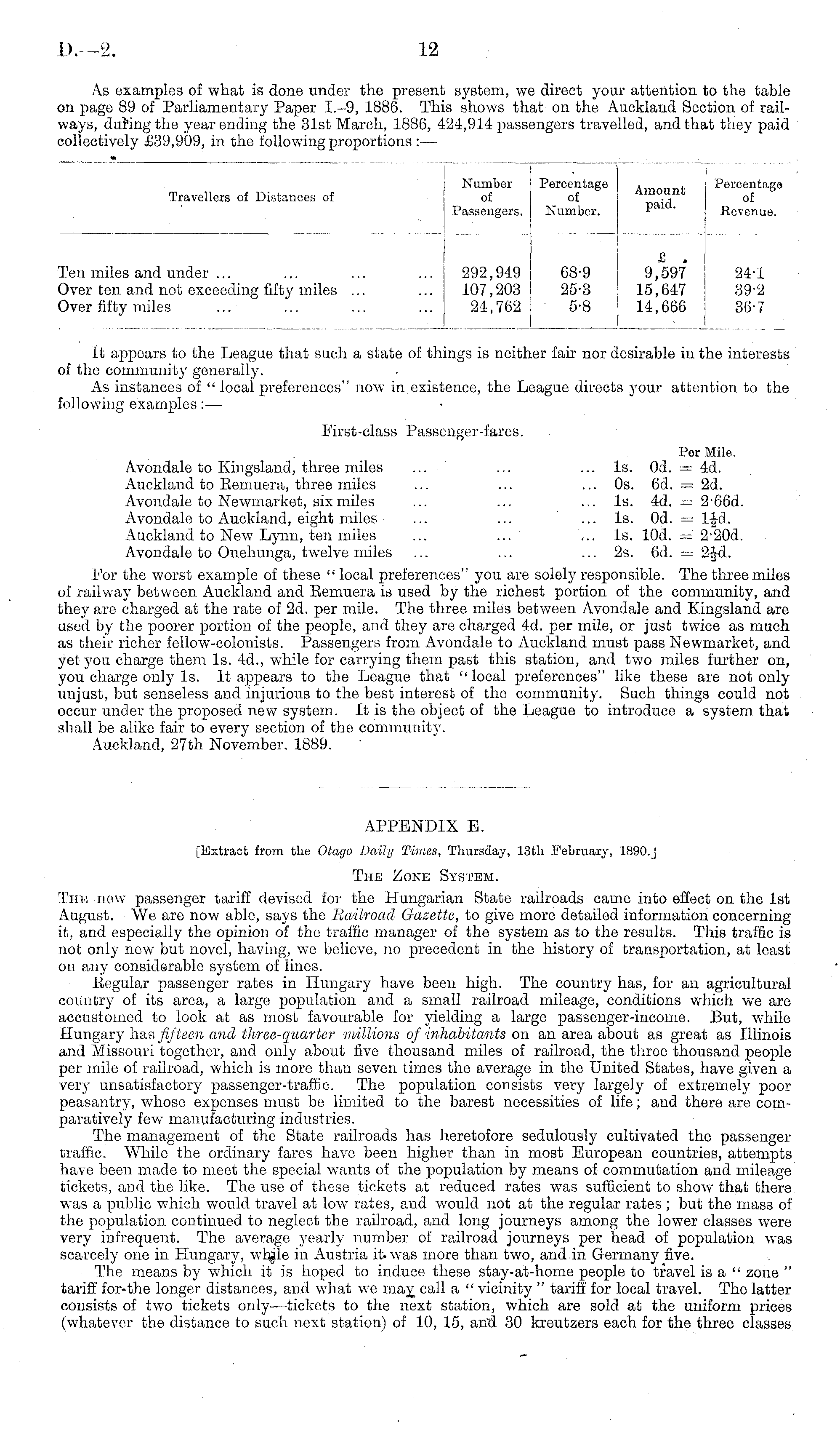 APPENDIX E. [Extract from the Otago Daily Times, Thursday, 13th February, 1890. | The Zone System. The new passenger tariff devised for the Hungarian State railroads came into effect on the Ist August. We are now able, says the Bailroad Gazette, to give more detailed information concerning it, and especially the opinion of the traffic manager of the system as to the results. This traffic is not only new but novel, having, we believe, no precedent in the history of transportation, at least on any considerable system of lines. Regular passenger rates in Hungary have been high. The country has, for an agricultural country of its area, a large population and a small railroad mileage, conditions which we are accustomed to look at as most favourable for yielding a large passenger-income. But, while Hungary has fifteen and three-quarter millions of inhabitants on an area about as great as Illinois and Missouri together, and only about five thousand miles of railroad, the three thousand people per mile of railroad, which is more than seven times the average in the United States, have given a very unsatisfactory passenger-traffic. The population consists very largely of extremely poor peasantry, whose expenses must bo limited to the barest necessities of life; and there are comparatively few manufacturing industries. The management of the State railroads has heretofore sedulously cultivated the passenger traffic. While the ordinary fares have been higher than in most European countries, attempts have been made to meet the special wants of the population by means of commutation and mileage tickets, and the like. The use of these tickets at reduced rates was sufficient to show that there was a public which would travel at low rates, and would not at the regular rates ; but the mass of the population continued to neglect the railroad, and long journeys among the lower classes were very infrequent. The average yearly number of railroad journeys per head of population was scarcely one in Hungary, whjle in Austria it. was more than two, and.in Germany five. The means by which it is hoped to induce these stay-at-home people to travel is a " zone " tariff for-the longer distances, and what we maj call a " vicinity " tariff for local travel. The latter consists of two tickets only —tickets to the next station, which are sold at the uniform prices (whatever the distance to such next station) of 10, 15, and 30 kreutzers each for the three classes
