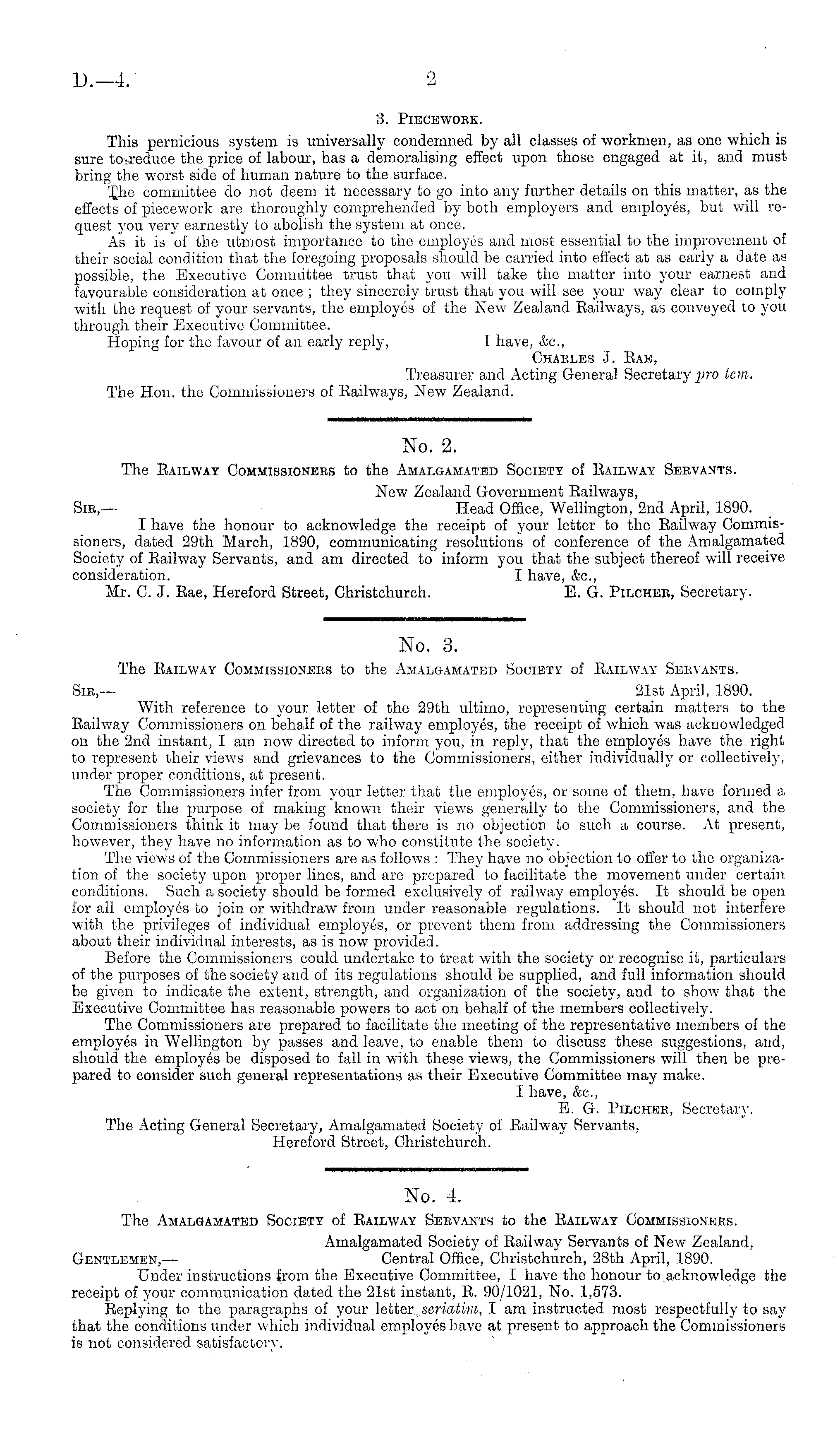 3. Piecework. This pernicious system is universally condemned by all classes of workmen, as one which is sure torfeduce the price of labour, has a demoralising effect upon those engaged at it, and must bring the worst side of human nature to the surface. T.he committee do not deem it necessary to go into any further details on this matter, as the effects of piecework are thoroughly comprehended by both employers and employes, but will request you very earnestly to abolish the system at once. As it is of the utmost importance to the employes and most essential to the improvement of their social condition that the foregoing proposals should be carried into effect at as early a date as possible, the Executive Committee trust that you will take the matter into your earnest and favourable consideration at once ; they sincerely trust that you will see your way clear to comply with the request of your servants, the employes of the New Zealand Railways, as conveyed to you through their Executive Committee. Hoping for the favour of an early reply, I have, &c, Charles J. Eae, Treasurer and Acting General Secretary pro torn. The Hon. the Commissioners of Eailways, New Zealand.