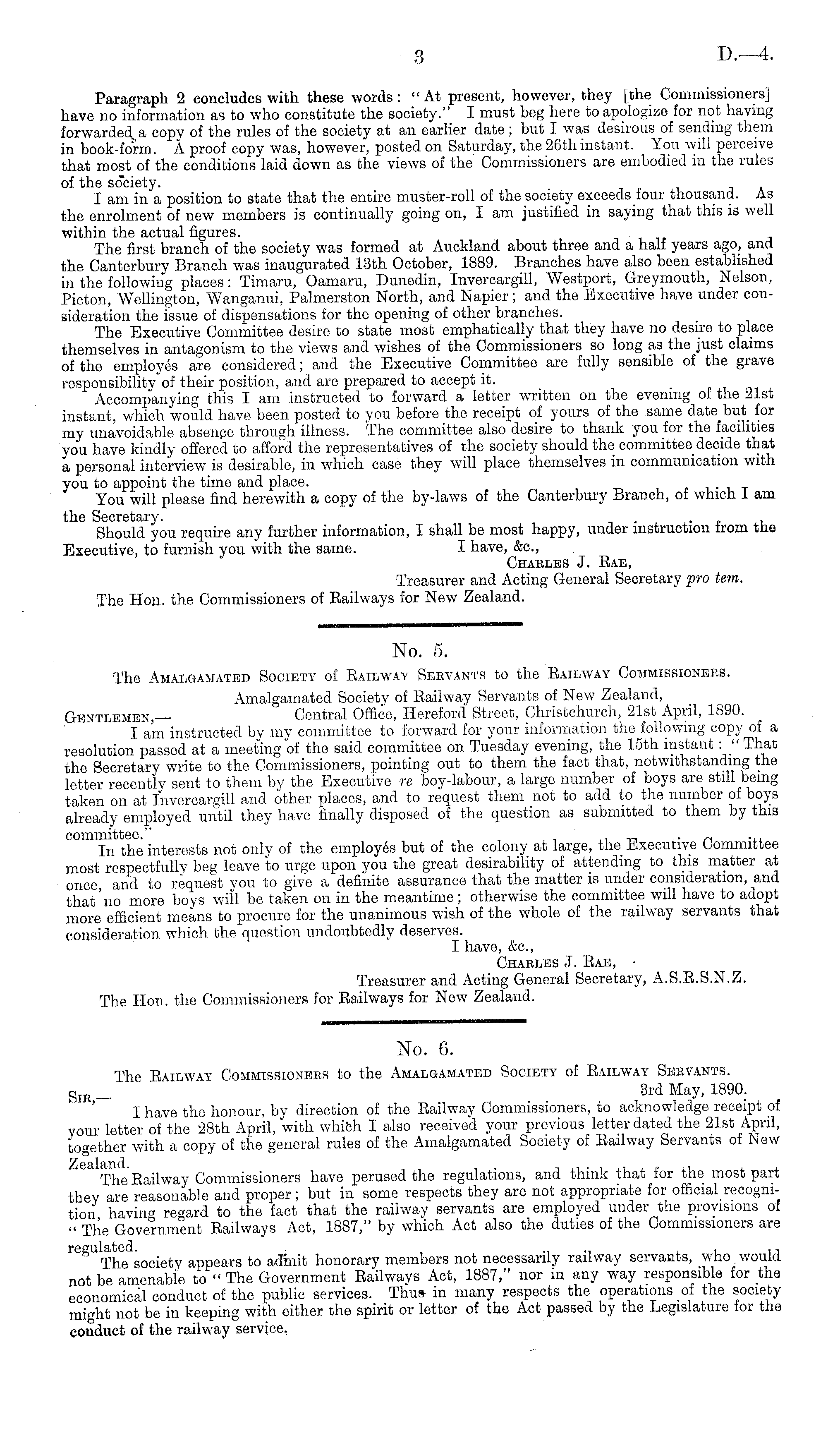 No. 5. The Amalgamated Society of Railway Servants to the Eailway Commissioners. Amalgamated Society of Eailway Servants of New Zealand, Gentlemen,— Central Office, Hereford" Street, Christchurch, 21st April, 1890. I am instructed by my committee to forward for your information the following copy of a resolution passed at a meeting of the said committee on Tuesday evening, the 15th instant: " That the Secretary write to the Commissioners, pointing out to them the fact that, notwithstanding the letter recently sent to them by the Executive re boy-labour, a large number of boys are still being taken on at Invercargill and other places, and to request them not to add to the number of boys already employed until they have finally disposed of the question as submitted to them by this committee." „ . In the interests not only of the employds but of the colony at large, the Executive Committee most respectfully beg leave to urge upon you the great desirability of attending to this matter at once and to request you to give a definite assurance that the matter is under consideration, and that'no more boys will be taken on in the meantime ; otherwise the committee will have to adopt more efficient means to procure for the unanimous wish of the whole of the railway servants that consideration which the question undoubtedly deserves. I have, &c, Charles J. Eae, • Treasurer and Acting General Secretary, A.S.E.S.N.Z. The Hon. the Commissioners for Eailways for New Zealand.