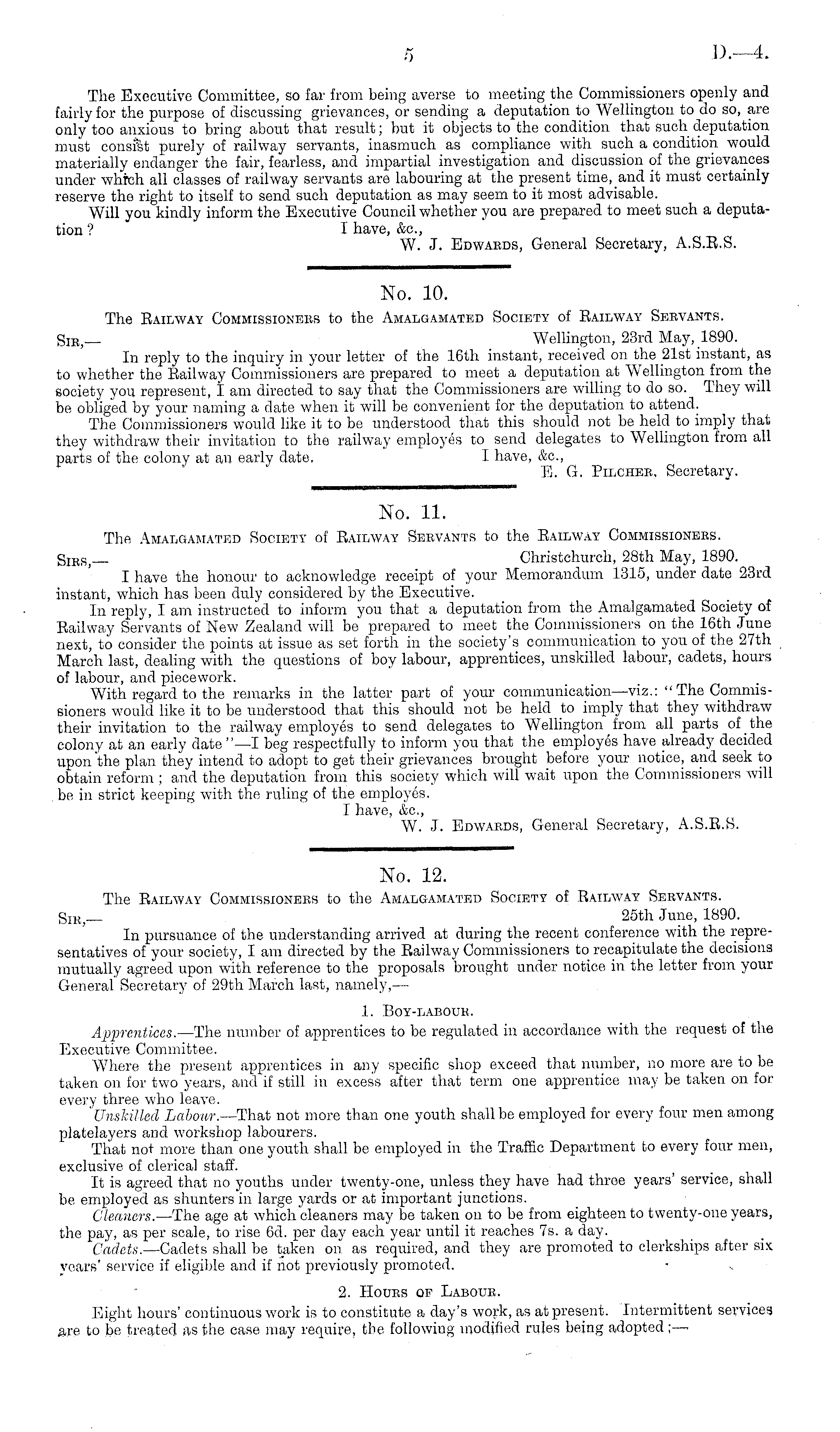 No. 12. The Bail-way Commissioners to the Amalgamated Society of Railway Servants. Sik,— 25th June, 1890. In pursuance of the understanding arrived at during the recent conference with the representatives of your society, I am directed by the Railway Commissioners to recapitulate the decisions mutually agreed upon with reference to the proposals brought under notice in the letter from your General Secretary of 29th March last, namely,— 1. BoY-LABOUE. Apprentices. —The number of apprentices to be regulated in accordance with the request of the Executive Committee. Where the present apprentices in any specific shop exceed that number, no more are to be taken on for two years, and if still in excess after that term one apprentice may be taken on for every three who leave. 'Unskilled Labour. —That not more than one youth shall be employed for every four men among platelayers and workshop labourers. That not more than one youth shall be employed in the Traffic Department to every four men, exclusive of clerical staff. It is agreed that no youths under twenty-one, unless they have had three years' service, shall be employed as shunters in large yards or at important junctions. Cleaners.— The age at which cleaners may be taken on to be from eighteen to twenty-one years, the pay, as per scale, to rise 6d. per day each year until it reaches 7s. a day. Cadets. —Cadets shall be taken on as required, and they are promoted to clerkships after six years' service if eligible and if flot previously promoted. 2. Houbs of Laboue. Bight hours' continuous work is to constitute a day's work, as at present. Intermittent services g,re to be treated as the case may require, the following modified rules being adopted ; —-