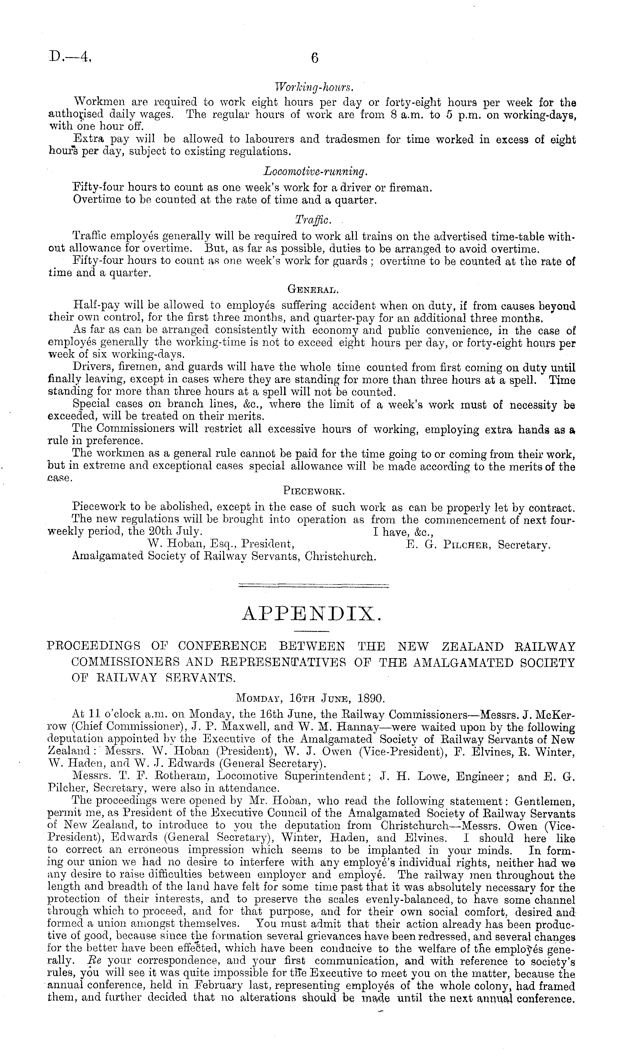 PEOCEEDINGS OF CONFEBENCE BETWEEN THE NEW ZEALAND EAILWAY COMMISSIONERS AND EEPEESENTATIVES OF THE AMALGAMATED SOCIETY OP EAILWAY SEEVANTS. Momday, 16th June, 1890. At 11 o'clock a.m. on Monday, the 16th June, the Eailway Commissioners—Messrs. J. McKerrow (Chief Commissioner), J. P. Maxwell, and W. M. Hannay—were waited upon by the following deputation appointed by the Executive of the Amalgamated Society of Eailway Servants of New Zealand :' Messrs. W. Hoban (President), W. J. Owen (Vice-President), P. Elvines, E. Winter, W. Haden, and W. J. Edwards (General Secretary). Messrs. T. P. Eotherain, Locomotive Superintendent; J. H. Lowe, Engineer; and E. G. Pilcher, Secretary, were also in attendance. The proceedings were opened by Mr. Hoban, who read the following statement: Gentlemen, permit me, as President of the Executive Council of the Amalgamated Society of Eailway Servants of New Zealand, to introduce to you the deputation from Christchurch—Messrs. Owen (VicePresident), Edwards (General Secretary), Winter, Haden, and Elvines. I should here like to correct an erroneous impression which seems to be implanted in your minds. In forming our union we had no desire to interfere with any employe's individual rights, neither had we any desire to raise difficulties between employer and employe. The railway men throughout the length and breadth of the land have felt for some time past that it was absolutely necessary for the protection of their interests, and to preserve the scales evenly-balanced, to have some'channel through which to proceed, and for that purpose, and for their own social comfort, desired and formed a union amongst themselves. You must admit that their action already has been productive of good, because since tlie formation several grievances have been redressed, and several changes for the better have been effected, which have been conducive to the welfare of the employes generally. Be your correspondence, and your first communication, and with reference to society's rules, you will see it was quite impossible for tlfe Executive to meet you on the matter, because the annual conference, held in February last, representing employes of the whole colony, had framed them, and further decided that no alterations should be made until the next annual conference.