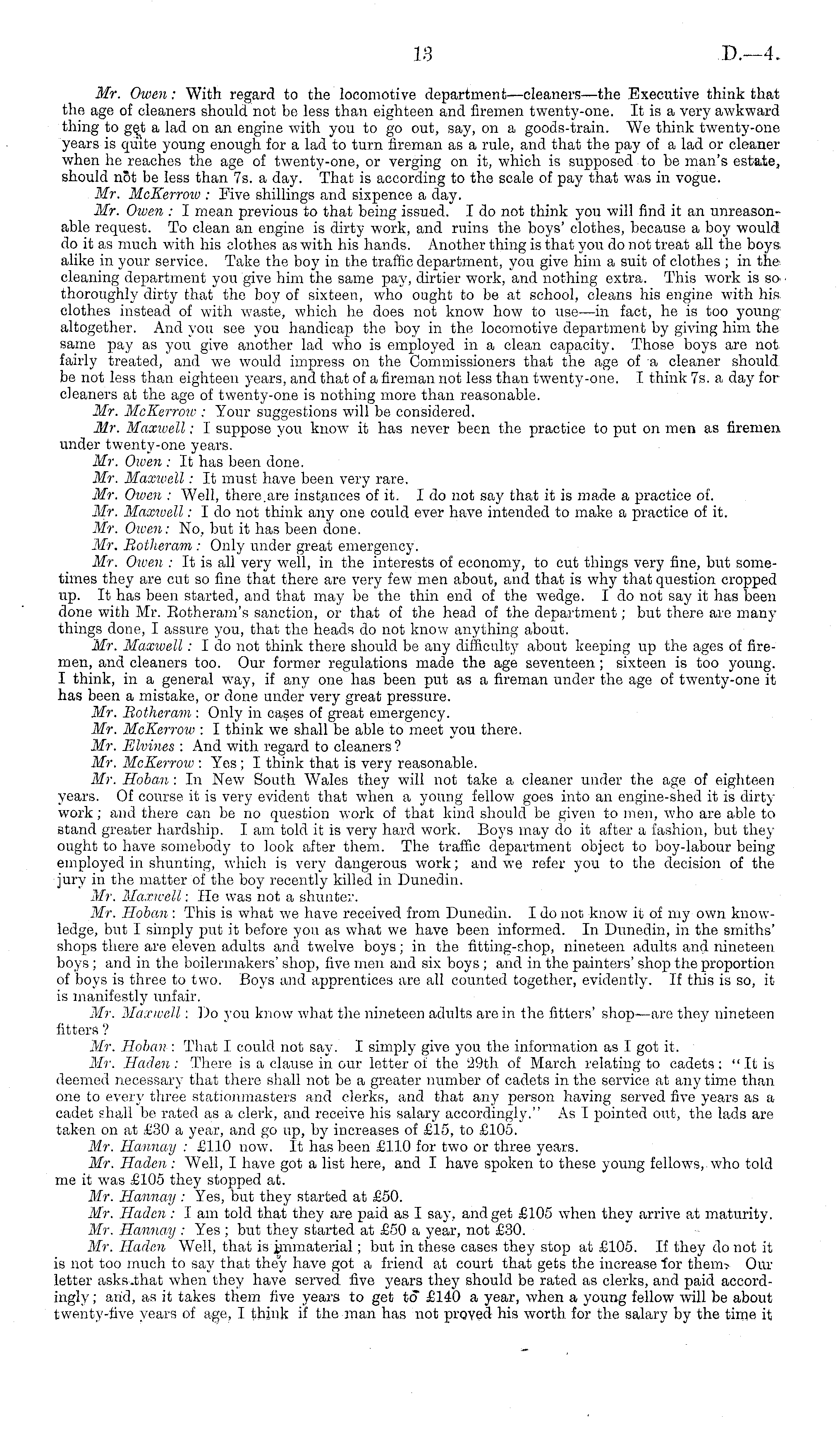 Mr. Owen: With regard to the locomotive department—cleaners—the Executive think that the age of cleaners should not be less than eighteen and firemen twenty-one. It is a very awkward thing to get a lad on an engine with you to go out, say, on a goods-train. We think twenty-one years is quite young enough for a lad to turn fireman as a rule, and that the pay of a lad or cleaner when he reaches the age of twenty-one, or verging on it, which is supposed to be man's estate, should not be less than 7s. a day. That is according to the scale of pay that was in vogue. Mr. McKerroto : Five shillings and sixpence a day. Mr. Owen : I mean previous to that being issued. Ido not think you will find it an unreasonable request. To clean an engine is dirty work, and ruins the boys' clothes, because a boy would1 do it as much with his clothes as with his hands. Another thing is that you. do not treat all the boys, alike in your service. Take the boy in the traffic department, you give him a suit of clothes ; in the cleaning department you give him the same pay, dirtier work, and nothing extra. This work is so. thoroughly dirty that the boy of sixteen, who ought to be at school, cleans his engine with his. clothes instead of with waste, which he does not know how to use—in fact, he is too youngaltogether. And you see you handicap the boy in the locomotive department by giving him the same pay as you give another lad who is employed in a clean capacity. Those boys are not. fairly treated, and we would impress on the Commissioners that the age of a cleaner should be not less than eighteen years, and that of a fireman not less than twenty-one. I think 7s. a day for cleaners at the age of twenty-one is nothing more than reasonable. Mr. McKerrow : Your suggestions will be considered. Mr. Maxwell; 1 suppose you know it has never been the practice to put on men as firemen under twenty-one years. Mr. Owen : It has been done. Mr. Maxwell: It must have been very rare. Mr. Owen : Well, there.are instances of it. Ido not say that it is made a practice of. Mr. Maxwell: Ido not think any one could ever have intended to make a practice of it. Mr. Owen: No, but it has been done. Mr. Botiieram : Only under great emergency. Mr. Owen : It is all very well, in the interests of economy, to cut things very fine, but sometimes they are cut so fine that there are very few men about, and that is why that question cropped up. It has been started, and that may be the thin end of the wedge. I do not say it has been done with Mr. Eotheram's sanction, or that of the head of the department; but there are many things done, I assure you, that the heads do not know anything about. Mr. Maxwell : I do not think there should be any difficult.)' about keeping up the ages of firemen, and cleaners too. Our former regulations made the age seventeen; sixteen is too young. I think, in a general way, if any one has been put as a fireman under the age of twenty-one it has been a mistake, or done under very great pressure. Mr. Sotheravi : Only in cases of great emergency. Mr. McKerrow : I think we shall be able to meet you there. Mr. Elvines : And with regard to cleaners ? Mr. McKerrow : Yes ; I think that is very reasonable. Mr. Hoban : In New South Wales they will not take a cleaner under the age of eighteen years. Of course it is very evident that when a young fellow goes into an engine-shed it is dirty work ; and there can be no question work of that kind should be given to men, who are able to stand greater hardship. lam told it is very hard work. Boys may do it after a fashion, but they ought to have somebody to look after them. The traffic department object to boy-labour being employed in shunting, which is very dangerous work; and we refer you to the decision of the jury in the matter of the boy recently killed in Dunedin. Mr. Maxwell : He was not a shunter. Mr. Hoban : This is vvhat we have received from Dunedin. Ido not know it of my own knowledge, but I simply put it before you as what we have been informed. In Dunedin, in the smiths' shops there are eleven adults and twelve boys; in the fitting-chop, nineteen adults and nineteen boys ; and in the boilermakers' shop, five men and six boys; and in the painters' shop the proportion of boys is three to two. Boys and apprentices are all counted together, evidently. If this is so, it is manifestly unfair. Mr. Maxwell : Do you know what the nineteen adults are in the fitters' shop—are they nineteen fitters ? Mr. Hoban : That I could not say. I simply give you the information as I got it. Mr. Haden: There is a clause in our letter of the 29th of March relating to cadets: "It is deemed necessary that there shall not be a greater number of cadets in the service at any time than one to every three stationmasters and clerks, and that any person having served five years as a cadet shall be rated as a clerk, and receive his salary accordingly." As I pointed out, the lads are taken on at £30 a year, and go up, by increases of £15, to £105. Mr. Hannay : £110 now. It has been £110 for two or three years. Mr. Haden : Well, I have got a list here, and I have spoken to these young fellows, who told me it was £105 they stopped at. Mr. Hannay: Yes, but they started at £50. Mr. Haden: lam told that they are paid as I say, and get £105 when they arrive at maturity. Mr. Hannay: Yes ; but they started at £50 a year, not £30. Mr. Haden Well, that is immaterial; but in these cases they stop at £105. If they do not it is not too much to say that they have got a friend at court that gets the increase lor them. Our letter asks-that when they have served, five years they should be rated as clerks, and paid accordingly ; arid, as it takes them five years to get to £140 a year, when a young fellow will be about twenty-five years of age, I think if the man has not proved his worth for the salary by the time it