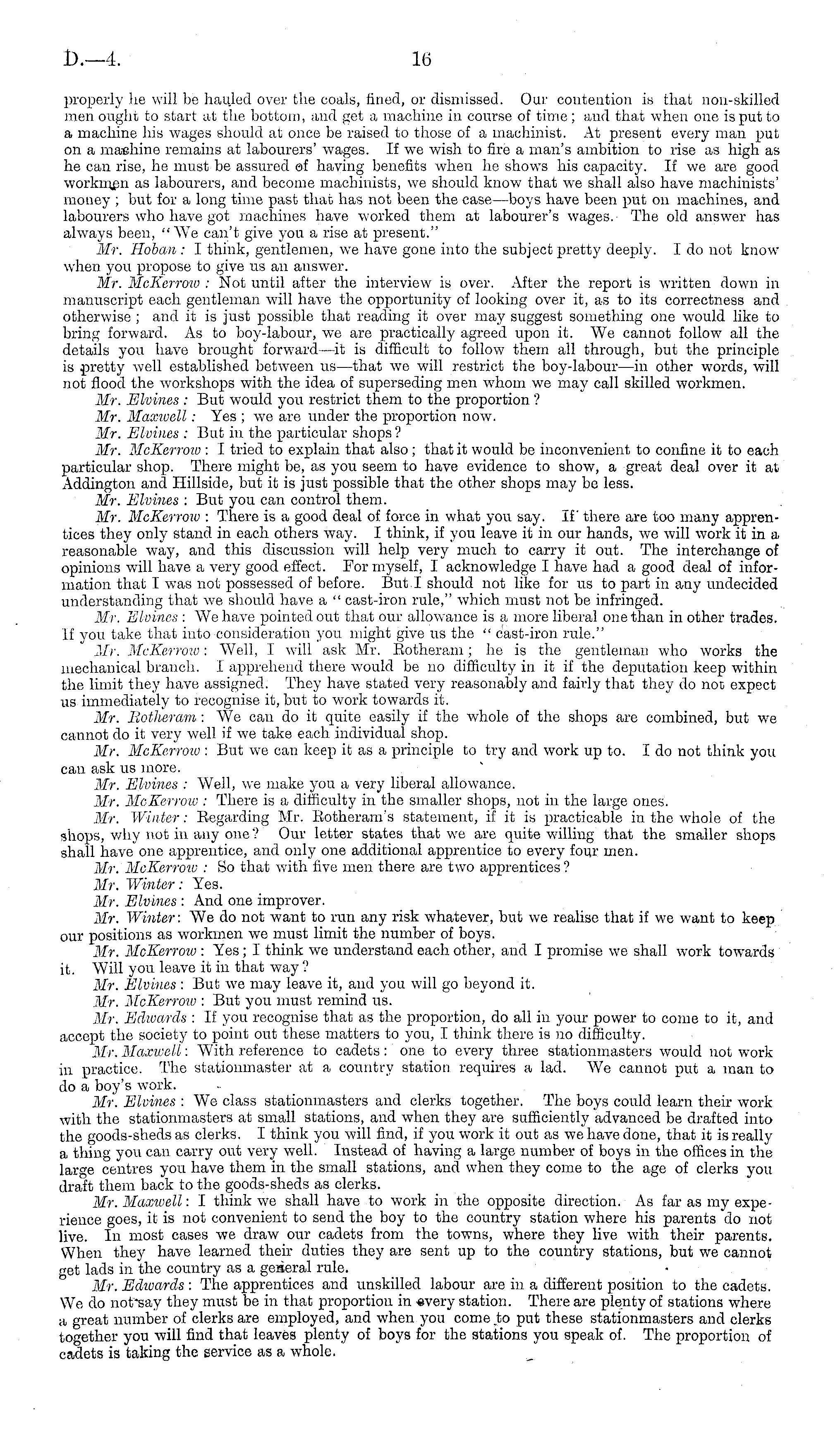 properly lie will be hauled over the coals, fined, or dismissed. Our contention is that non-skilled men ought to start at the bottom, and get a machine in course of time; and that when one is put to a machine his wages should at once be raised to those of a machinist. At present every man put on a machine remains at labourers' wages. If we wish to fire a man's ambition to rise as high as he can rise, he must be assured ef having benefits when he shows his capacity. If we are good ■workman as labourers, and become machinists, we should know that we shall also have machinists' money ; but for a long time past that has not been the case—boys have been put on machines, and labourers who have got machines have worked them at labourer's wages. The old answer has always been, "We can't give you a rise at present." Mr. Hoban : I think, gentlemen, we have gone into the subject pretty deeply. Ido not know when you propose to give us an answer. Mr. McKerrow : Not until after the interview is over. After the report is written down in manuscript each gentleman will have the opportunity of looking over it, as to its correctness and otherwise ; and it is just possible that reading it over may suggest something one would like to bring forward. As to boy-labour, we are practically agreed upon it. We cannot follow all the details you have brought forward—it is difficult to follow them all through, but the principle is pretty well established between vs —that we will restrict the boy-labour—in other words, will not flood the workshops with the idea of superseding men whom we may call skilled workmen. Mr. Elvines : But would you restrict them to the proportion ? Mr. Maxwell: Yes ;we are under the proportion now. Mr. Elvines : But in the particular shops ? Mr. McKarrow : I tried to explain that also; that it would be inconvenient to confine it to each particular shop. There might be, as you seem to have evidence to show, a great deal over it at Addington and Hillside, but it is just possible that the other shops may be less. Mr. Elvines : But you can control them. Mr. McKerrow : There is a good deal of force in what you say. If there are too many apprentices they only stand in each others way. I think, if you leave it in our hands, we will work it in a reasonable way, and this discussion will help very much to carry it out. The interchange of opinions will have a very good effect. For myself, I acknowledge I have had a good deal of information that I was not possessed of before. But I should not like for us to part in any undecided understanding that we should have a " cast-iron rule," which must not be infringed. Mi\ Elvines : We have pointed out that our allowance is a more liberal one than in other trades. If you take that into consideration you might give us the " cast-iron rule." Mr. McKerrow : Well, I will ask Mr. Eotheram; he is the gentleman who works the mechanical branch. I apprehend there would be no difficulty in it if the deputation keep within the limit they have assigned. They have stated very reasonably and fairly that they do not expect us immediately to recognise it, but to work towards it. Mr. liotheram : We can do it quite easily if the whole of the shops are combined, but we cannot do it very well if we take each individual shop. Mr. McKerrow : But we can keep it as a principle to try and work up to. Ido not think you can ask us more. Mr. Elvines : Well, we make you a very liberal allowance. Mr. McKerrow : There is a difficulty in the smaller shops, not in the large ones. Mr. Winter: Regarding Mr. Eotheram's statement, if it is practicable in the whole of the shops, why not in any one? Our letter states that we are quite willing that the smaller shops shall have one apprentice, and only one additional apprentice to every four men. Mr. McKerrow : So that with five men there are two apprentices ? Mr. Winter: Yes. Mr. Elvines : And one improver. Mr. Winter: We do not want to run any risk whatever, but we realise that if we want to keep our positions as workmen we must limit the number of boys. Mr. McKerrow : Yes; I think we understand each, other, and I promise we shall work towards it. Will you leave it in that way ? Mr. Elvines: But we may leave it, and you will go beyond it. Mr. McKerrow : But you must remind us. Mr. Edwards : If you recognise that as the proportion, do all in your power to come to it, and accept the society to point out these matters to you, I think there is no difficulty. Mr. Maxwell : With reference to cadets: one to every three stationmasters would not work in practice. The stationmaster at a country station requires a lad. We cannot put a man to do a boy's work. Mr. Elvines :We class stationmasters and clerks together. The boys could learn their work with the stationmasters at small stations, and when they are sufficiently advanced be drafted into the goods-sheds as clerks. I think you will find, if you work it out as we have done, that it is really a thing you can carry out very well. Instead of having a large number of boys in the offices in the large centres you have them in the small stations, and when they come to the age of clerks you draft them back to the goods-sheds as clerks. Mr. Maxwell: I think we shall have to work in the opposite direction. As far as my experience goes, it is not convenient to send the boy to the country station where his parents do not live. In most cases we draw our cadets from the towns, where they live with their parents. When they have learned their duties they are sent up to the country stations, but we cannot get lads in the country as a geaeral rule. Mr. Edwards : The apprentices and unskilled labour are in a different position to the cadets. We do not"say they must be in that proportion in every station. There are plenty of stations where a great number of clerks are employed, and when you come to put these stationmasters and clerks together you Avill find that leaves plenty of boys for the stations you speak of. The