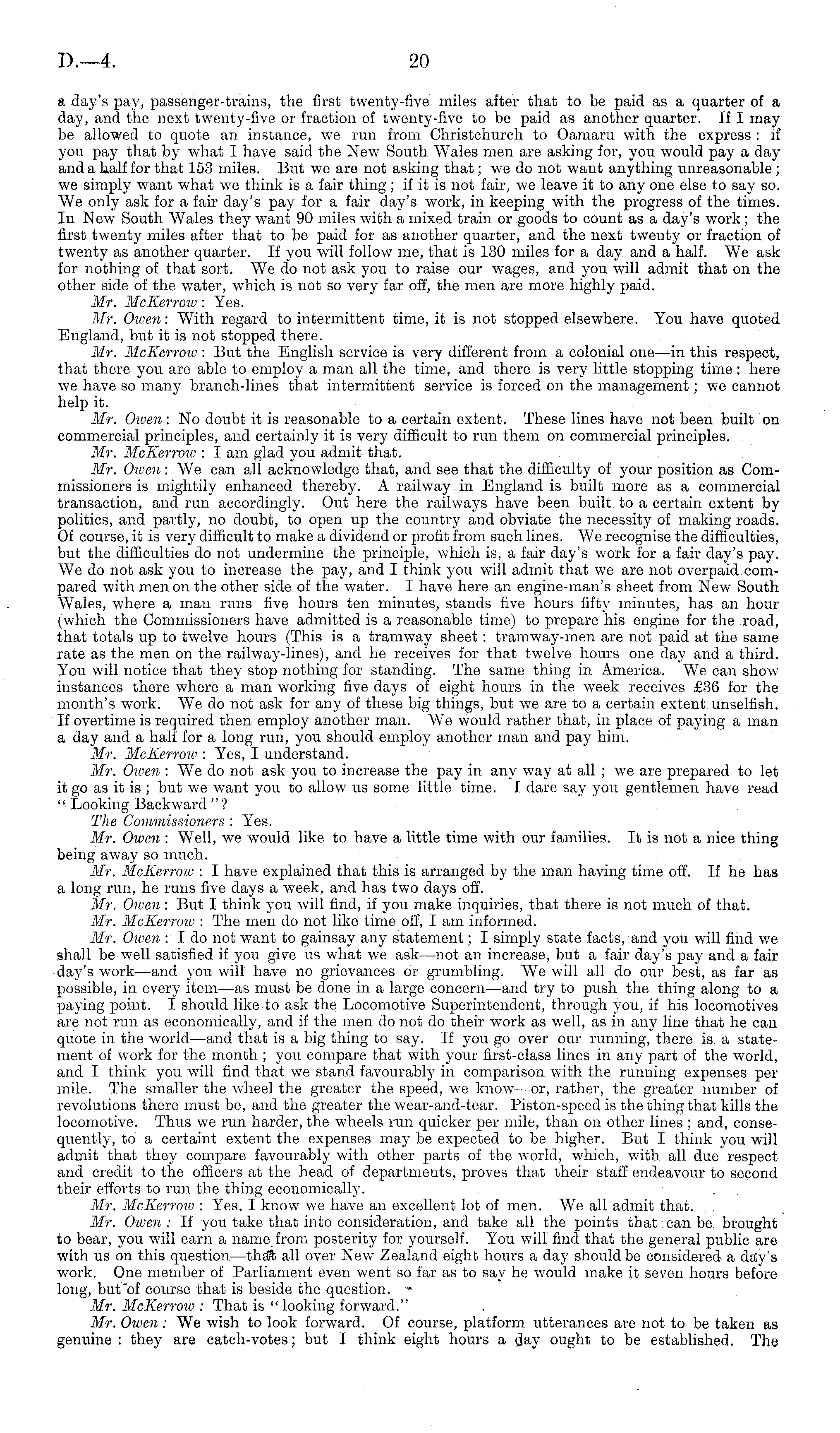 a day's pay, passenger-trains, the first twenty-five miles after that to be paid as a quarter of a day, and the next twenty-five or fraction of twenty-five to be paid as another quarter. If I may be allowed to quote an instance, we run from Christchurch to Oamaru with the express : if you pay that by what I have said the New South Wales men are asking for, you would pay a day and a half for that 153 miles. But we are not asking that; we do not want anything unreasonable ; we simply want what we think is a fair thing; if it is not fair, we leave it to any one else to say so. We only ask for a fair day's pay for a fair day's work, in keeping with the progress of the times. In New South Wales they want 90 miles with a mixed train or goods to count as a day's work; the first twenty miles after that to be paid for as another quarter, and the next twenty or fraction of twenty as another quarter. If you will follow me, that is 130 miles for a day and a half. We ask for nothing of that sort. We do not ask you to raise our wages, and you will admit that on the other side of the water, which is not so very far off, the men are more highly paid. Mr. McKerrotv: Yes. Mr. Owen: With regard to intermittent time, it is not stopped elsewhere. You have quoted England, but it is not stopped there. Mr. McKerrow : But the English service is very different from a colonial one—in this respect, that there you are able to employ a man all the time, and there is very little stopping time: here we have so many branch-lines that intermittent service is forced on the management; we cannot help it. Mr. Owen : No doubt it is reasonable to a certain extent. These lines have not been built on commercial principles, and certainly it is very difficult to run them on commercial principles. Mr. McKerrow : I am glad you admit that. Mr. Owen : We can all acknowledge that, and see that the difficulty of your position as Commissioners is mightily enhanced thereby. A railway in England is built more as a commercial transaction, and run accordingly. Out here the railways have been built to a certain extent by politics, and partly, no doubt, to open up the country and obviate the necessity of making roads. Of course, it is very difficult to make a dividend or profit from such lines. We recognise the difficulties, but the difficulties do not undermine the principle, which is, a fair day's work for a fair day's pay. We do not ask you to increase the pay, and I think you will admit that we are not overpaid compared with men on the other side of the water. I have here an engine-man's sheet from New South Wales, where a man runs five hours ten minutes, stands five hours fifty minutes, has an hour (which the Commissioners have admitted is a reasonable time) to prepare his engine for the road, that totals up to twelve hours (This is a tramway sheet : tramway-men are not paid at the same rate as the men on the railway-lines), and he receives for that twelve hours one day and a third. You will notice that they stop nothing for standing. The same thing in America. We can show instances there where a man working five days of eight hours in the week receives £36 for the month's work. We do not ask for any of these big things, but we are to a certain extent, unselfish. If overtime is required then employ another man. We would rather that, in place of paying a man a day and a half for a long run, you should employ another man and pay him. Mr. McKerroio : Yes, I understand. Mr. Owen : We do not ask you to increase the pay in any way at all ; we are prepared to let it go as it is ; but we want you to allow us some little time. I dare say you gentlemen have read " Looking Backward "? The Commissioners : Yes. Mr. Owen : Well, we would like to have a little time with our families. It is not a nice thing being away so much. Mr. McKerrow : I have explained that this is arranged by the man having time off. If he has a long run, he runs five days a week, and has two days off. Mr. Owen: But I think you will find, if you make inquiries, that there is not much of that. Mr. McKerrow : The men do not like time off, I am informed. Mr. Oioen :I do not want to gainsay any statement; I simply state facts, and you will find we shall be well satisfied if you give us what we ask—not an increase, but a fair day's pay and a fair ■ day's work —and you will have no grievances or grumbling. We will all do our best, as far as possible, in every item—as must be done in a large concern —and try to push the thing along to a paying point. I should like to ask the Locomotive Superintendent, through you, if his locomotives are not run as economically, and if the men do not do their work as well, as in any line that he can quote in the world—and that is a big thing to say. If you go over our running, there is. a statement of work for the month ; you compare that with your first-class lines in any part of the world, and I think you will find that we stand favourably in comparison with the running expenses per mile. The smaller the wheel the greater the speed, we know—or, rather, the greater number of revolutions there must be, and the greater the wear-and-tear. Piston-speed is the thing that kills the locomotive. Thus we run harder, the wheels run quicker per mile, than on other lines ; and, consequently, to a certaint extent the expenses may be expected to be higher. But I think you will admit that they compare favourably with other parts of the world, which, with all due respect and credit to the officers at the head of departments, proves that their staff endeavour to second their efforts to run the thing economically. Mr. McKerrow : Yes. I know we have an excellent lot of men. We all admit that. Mr. Owen: If you take that into consideration, and take all the points that can be brought to bear, you will earn a name from posterity for yourself. You will find that the general public are with us on this question—that all over New Zealand eight hours a day shou