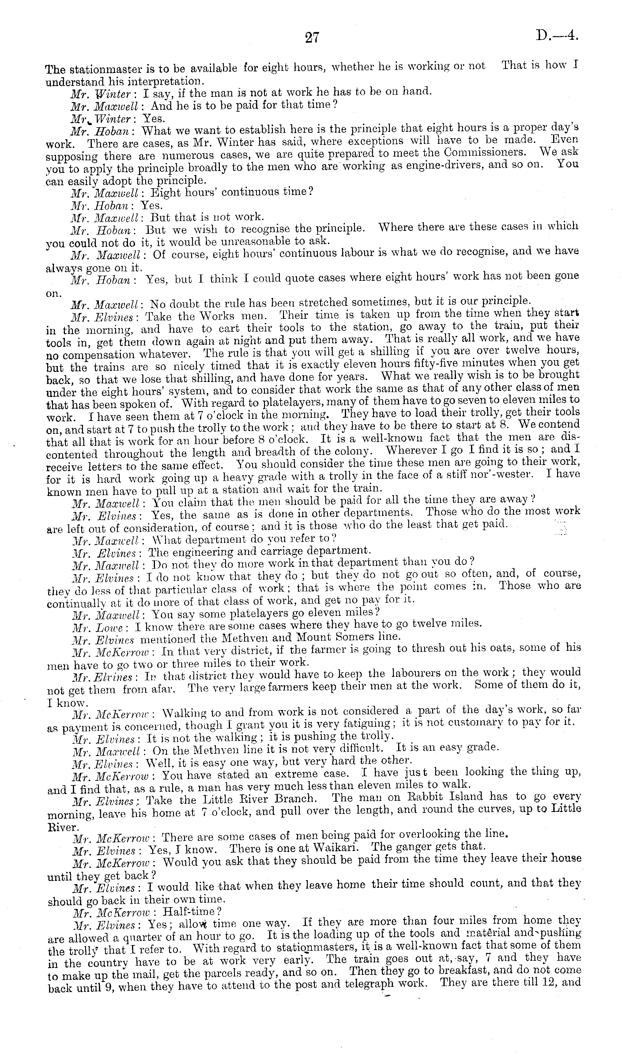 The stationmaster is to be available for eight hours, whether he is working- or not That is how I understand his interpretation. Mr. Winter: I say, if the man is not at work he has to be on hand. Mr. Maxwell : And he is to be paid for that time ? Mr* Winter : Yes. . , Mr. Hoban : What we want to establish here is the principle that eight hours is a proper day s work. There are cases, as Mr. Winter has said, where exceptions will haw- to_ be made. Even supposing there are numerous cases, we are quite prepared to meet the Commissioners. We ask you to apply the principle broadly to the men who are working as engine-drivers, and so on. You can easily adopt the principle. Mr. Maxwell : Eight hours' continuous time? Mr. Hoban: Yes. Mr. Maxwell : But that is not work. . Mr. Hoban: But we wish to recognise the principle. Where there are these cases in which you could not do it, it would be unreasonable to ask. Mr. Maxwell : Of course, eight hours' continuous labour is what we do recognise, and we have always gone on it. , . Mr. Hoban : Yes, but I think I could quote cases where eight hours work has not been gone on. . . . Mr Maxwell: No doubt the rale has been stretched sometimes, but it is our prmcipie. Mr. Elvines : Take the Works men. Their time is taken up from the time when they start in the inorning, and have to cart their tools to the station, go away to the tram, put their tools in g°t them down again at night and put them away. That is really all work, and we have no compensation whatever. The rule is that you will get a shilling if you are over twelve hours, but the trains are so nicely timed that it is exactly eleven hours fifty-five minutes when you get back so that we lose that shilling, and have done for years. What we really wish is to be brought under the eight hours' system, and to consider that work the same as that of any other class of men that has been spoken of. With regard to platelayers, many of them have to go seven to eleven miles to work I have seen them at 7 o'clock in the morning. They have to load their trolly, get their tools on and start at 7to push the trolly to the work ; and they have to be there to start at 8. We contend that all that is work for an hour'before 8 o'clock. It is a well-known fact that the men are discontented throughout the length and breadth of the colony. Wherever Igo I find it is so ; and I receive letters to the same effect. You should consider the time these men are going to their work, for it is hard work going up a heavy grade with a trolly in the face of a stiff nor'-wester. I have known men have to pull up at a station and wait for the train. Mr Maxwell : You claim that the men should be paid for all the time they are away ? Mr. 'Elvines : Yes, the same as is done in other departments. Those who do the most work are left 'out of consideration, of course; and it is those who do the least that get paid. Mr. Maxwell : What department do you refer to. Mr. Elvines : The engineering and carriage department. Mr Maxwell : Do not they do more work in that department than you do ? Mr. Elvines : I do not know that they do ; but they do not go out so often, and, of course, they do'less of that particular class of work; that is where the point comes in. Those who are continually at it do more of that class of work, and get no pay for it. Mr. Maxwell : You say some platelayers go eleven miles? Mr. Loice : I know there are some cases where they have to go twelve miles. Mr. Elvines mentioned the Methven and Mount Somers line. Mr. McKerrow : In that very district, if the farmer is going to thresh out his oats, some of his men have to go two or three miles to their work. Mr Elvines : In that district they would have to keep the labourers on the work ; they would not get them from afar. The very large farmers keep their men at the work. Some of them do it, Mr McKerrow : Walking to and from work is not considered a part of the day's work, so far as payment is concerned, though I grant you it is very fatiguing; it is not customary to pay for it. Mr. Elvines : It is not the walking ; it is pushing the trolly. Mr. Maxwell : On the Methven line it is not very difficult. It is an easy grade. Mr Elvines : Well it is easy one way, but very hard the other. Mr McKerrow : You have stated an' extreme "case. I have jus t been looking the thing up, and I find that, as a rule, a man has very much less than eleven miles to walk. Mr Elvines : Take the Little Eiver Branch. The man on Rabbit Island has to go every morning, leave his home at 7 o'clock, and pull over the length, and round the curves, up to Little Mr McKerrow : There are some cases of men being paid for overlooking the line. Mr. Elvines : Yes, I know. There is one at Waikari. The ganger gets that. Mr. McKerrow : Would you ask that they should be paid from the time they leave their house 1 Mrlfflvines : I would like that when they leave home their time should count, and that they should go back in their own time. Mr. MoKerroib: Half-time? " • Mr Elvines : Yes; allow time one way. If they are more than four miles from home they are allowed a quarter of an hour to go. It is the loading up of the tools and material and pushing the trolly that I refer to With regard to stationmasters, it is a well-known fact that some of them in the country have to be at work very early. The train goes out at, say, 7 and they have to make up the mail, get the parcels ready, and so on. Then they go to breakfast, and do not come back until 9 when they have to attend to the post and telegraph work. The;- are there till 12, and