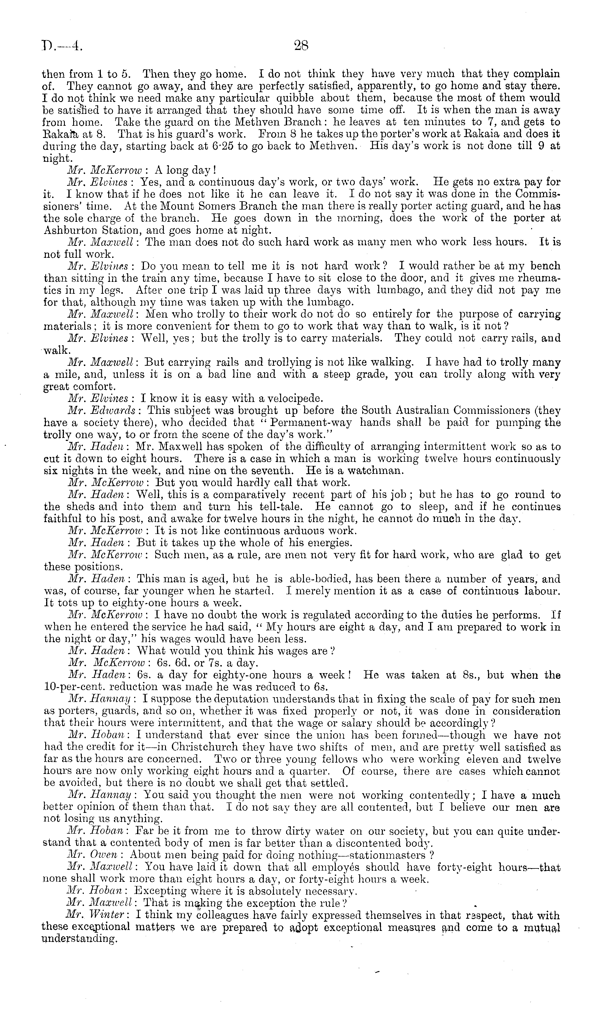 then from Ito 5. Then they go home. Ido not think they have very much that they complain of. They cannot go away, and they are perfectly satisfied, apparently, to go home and stay there. I do not think we need make any particular quibble about them, because the most of them would be satisfied to have it arranged that they should have some time off. It is when the man is away from home. Take the guard on the Methven Branch: he leaves at ten minutes to 7, and gets to Eakafe at 8. That is his guard's work. From Bhe takes up the porter's work at Eakaia and does it during the day, starting back at 6#25 to go back to Methven. His day's work is not done till 9at night. Mr. McKcrrow : A long day ! Mr. Eloincs : Yes, and a continuous day's work, or two days' work. He gets no extra pay for it. I know that if he does not like it he can leave it. Ido not say it was done in the Commissioners' time. At the Mount Somers Branch the man there is really porter acting guard, and he has the sole charge of the branch. He goes down in the morning, does the work of the porter at Ashburton Station, and goes home at night. Mr. Maxwell : The man does not do such hard work as many men who work less hours. It is not full work. Mr. Elvincs : Do you mean to tell me it is not hard work ? I would rather be at my bench than sitting in the train any time, because I have to sit close to the door, and it gives me rheumatics in my legs. After one trip I was laid up three days with lumbago, and they did not pay me for that, although my time was taken up with the lumbago. Mr. Maxwell : Men who trolly to their work do not do so entirely for the purpose of carrying materials ; it is more convenient for them to go to work that way than to walk, is it not ? Mr. Elvines : Well, yes; but the trolly is to carry materials. They could not carry rails, and walk. Mr. Maxwell: But carrying rails and trollying is not like walking. I have had to trolly many a mile, and, unless it is on a bad line and with a steep grade, you can trolly along with very great comfort. Mr. Elvines : I know it is easy with a velocipede. Mr. Edwards : This subject was brought up before the South Australian Commissioners (they have a society there), who decided that " Permanent-way hands shall be paid for pumping the trolly one way, to or from the scene of the day's work." Mr. Haden : Mr. Maxwell has spoken of the difficulty of arranging intermittent work so as to cut it down to eight hours. There is a case in which a man is working twelve hours continuously six nights in the week, and nine on the seventh. He is a watchman. Mr. McKerrow : But you would hardly call that work. Mr. Haden : Well, this is a comparatively recent part of his job ; but he has to go round to the sheds and into them and turn his tell-tale. He cannot go to sleep, and if he continues faithful to his post, and awake for twelve hours in the night, he cannot do much in the day. Mr. McKerrow : It is not like continuous arduous work. Mr. Haden : But it takes up the whole of his energies. Mr. McKerrow : Such men, as a rule, are men not very fit for hard work, who are glad to get these positions. Mr. Haden : This man is aged, but he is able-borlied, has been there a number of years, and was, of course, far younger when he started. I merely mention it as a case of continuous labour. It tots up to eighty-one hours a week. Mr. McKerrow : I have no doubt the work is regulated according to the duties he performs. If when he entered the service he had said, " My hours are eight a day, and I am prepared to work in the night or day," his wages would have been less. Mr. Haden : What would you think his wages are ? Mr. McKerrow : 6s. 6d. or 7s. a day. Mr. Haden: 6s. a day for eighty-one hours a week! He was taken at Bs., but when the 10-per-cent. reduction was made he was reduced to 6s. Mr. Hannay : I suppose the deputation understands that in fixing the scale of pay for such men as porters, guards, and so on, whether it was fixed properly or not, it was done in consideration that their hours were intermittent, and that the wage or salary should be accordingly ? Mr. Hoban: I understand that ever since the union has been formed—though we have not had the credit for it—in Christchurch they have two shifts of men, and are pretty well satisfied as far as the hours are concerned. Two or three young fellows who were working eleven and twelve hours are now only working eight hours and a quarter. Of course, there are cases which cannot be avoided, but there is no doubt we shall get that settled. Mr. Hannay : You said you thought the men were not working contentedly; 1 have a much better opinion of them than that. Ido not say they are all contented, but I believe our men are not losing us anything. Mr. Hoban : Far be it from me to throw dirty water on our society, but you can quite understand that a contented body of men is far better than a discontented body. Mr. Owen : About men being paid for doing nothing—stationmasters ? Mr. Maxwell : You have laid it down that all employes should have forty-eight hours—that none shall work more than eight hours a day, or forty-eight hours a week. Mr. Hoban : Excepting where it is absolutely necessary. Mr. Maxwell : That is making the exception the rule ? Mr. Winter : I think my colleagues have fairly expressed themselves in that rsspect, that with these exceptional matters we are prepared to adopt exceptional measures and come to a mutual understanding.