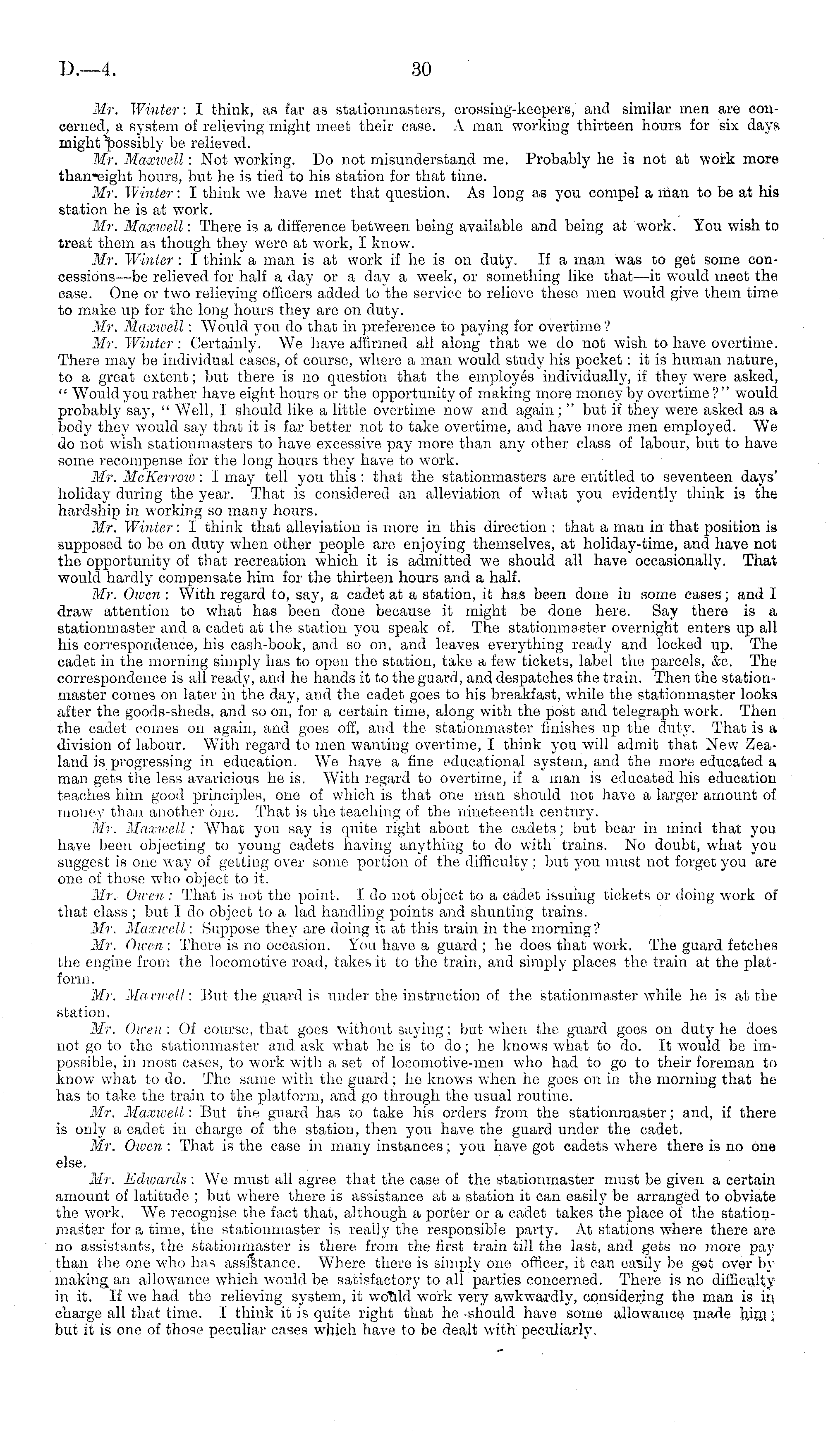 Mr. Winter: I think, as far as stationmasters, crossing-keepers, and similar men are concerned, a system of relieving might meet their ease. A man working thirteen hours for six days might possibly be relieved. Mr. Maxwell : Not working. Do not misunderstand me. Probably he is not at work more than-eight hours, but he is tied to his station for that time. Mr. Winter: I think we have met that question. As long as you compel a man to be at his station he is at work. Mr. Maxwell : There is a difference between being available and being at work. You wish to treat them as though they were, at work, I know. Mr. Winter: I think a man is at work if he is on duty. If a man was to get some concessions—be relieved for half a day or a day a week, or something like that—it would meet the case. One or tw xo relieving officers added to the service to relieve these men would give them time to make up for the long hours they are on duty. Mr. Maxwell : Would you do that in preference to paying for overtime ? Mr. Winter : Certainly. We have affirmed all along that we do not wish to have overtime. There may be individual cases, of course, where a man would study his pocket : it is human nature, to a great extent; but there is no question that the employes individually, if they were asked, " Would you rather have eight hours or the opportunity of making more money by overtime ? " would probably say, " Well, I should like a little overtime now and again; " but if they were asked as a body they would say that it is far better not to take overtime, and have more men employed. We do not wish stationmasters to have excessive pay more than any other class of labour, but to have some recompense for the long hours they have to work. Mr. McKerrow: I may tell you this : that the stationmasters are entitled to seventeen days' holiday during the year. That is considered an alleviation of what you evidently think is the hardship in working so many hours. Mr. Winter : 1 think that alleviation is more in this direction : that a man in that position is supposed to be on duty when other people are enjoying themselves, at holiday-time, and have not the opportunity of that recreation which it is admitted we should all have occasionally. That would hardly compensate him for the thirteen hours and a half. Mr. Owen : With regard to, say, a cadet at a station, it has been done in some cases; and I draw attention to what has been done because it might be done here. Say there is a stationmaster and a cadet at the station you speak of. The stationroaster overnight enters up all his correspondence, his cash-book, and so on, and leaves everything ready and locked up. The cadet in the morning simply has to open the station, take a few tickets, label the parcels, &c. The correspondence is all ready, and he hands it to the guard, and despatches the train. Then the stationmaster comes on later in the day, and the cadet goes to his breakfast, while the stationmaster looks after the goods-sheds, and so on, for a certain time, along with the post and telegraph work. Then the cadet comes on again, and goes off, and the stationmaster finishes up the duty. That is a division of labour. With regard to men wanting overtime, I think you will admit that New Zealand is progressing in education. We have a fine educational system, and the more educated a man gets the less avaricious he is. With regard to overtime, if a man is educated his education teaches him good principles, one of which is that one man should not have a larger amount of money than another one. 'That is the teaching of the nineteenth century. Mr. Maxwell : What you say is quite right about the cadets; but bear in mind that you have been objecting to young cadets having anything to do with trains. No doubt, what you suggest is one way of getting over some portion of the difficulty; hut you must not forget you are one of those who object to it. Mr. Owen : That is not the point. Ido not object to a cadet issuing tickets or doing work of that class ; but I do object to a lad handling points and shunting trains. Mr. Maxwell : Suppose they are doing it at this train, in the morning. Mr. Oven: There is no occasion. You have a guard; he does that work. The guard fetches the engine from the locomotive road, takes it to the train, and simply places the train at the platform. Mr. Maxivtll : But the guard is under the instruction of the stationmaster while he is at the .station. Mr. Owen: Of course, that goes without saying; but when the guard goes ou duty he does not go to the stationmaster and ask what he is to do; he knows what to do. It would be impossible, in most cases, to work with a set of locomotive-men who had to go to their foreman to know what to do. The same with the guard; he knows when he goes on in the morning that he has to take the train to the platform, and go through the usual routine. Mr. Maxwell: But the guard has to take his orders from the stationmaster; and, if there is only a cadet in charge of the station, then you have the guard under the cadet. Mr. Owen : That is the case in many instances; you have got cadets where there is no oue else. Mr. Edwards : We must all agree that the case of the stationmaster must be given a certain amount of latitude ; but where there is assistance, at a station it can easily be arranged to obviate the work. We recognise the fact that, although a porter or a cadet takes the place of the stationmaster for a time, the stationmaster is really the responsible party. At stations where there are no assistants, the stationmaster is there from the first train till the last, and gets no more pay than the one who has assistance. Where there is simply one officer, it can easily be got over by making an allowance which would be satisfactory to all parties concerned. There is no difficulty in it. If we had the relieving system, it would work very awkwardly, considering the man is in, charge all that time. I think it is quite right that he -should 
