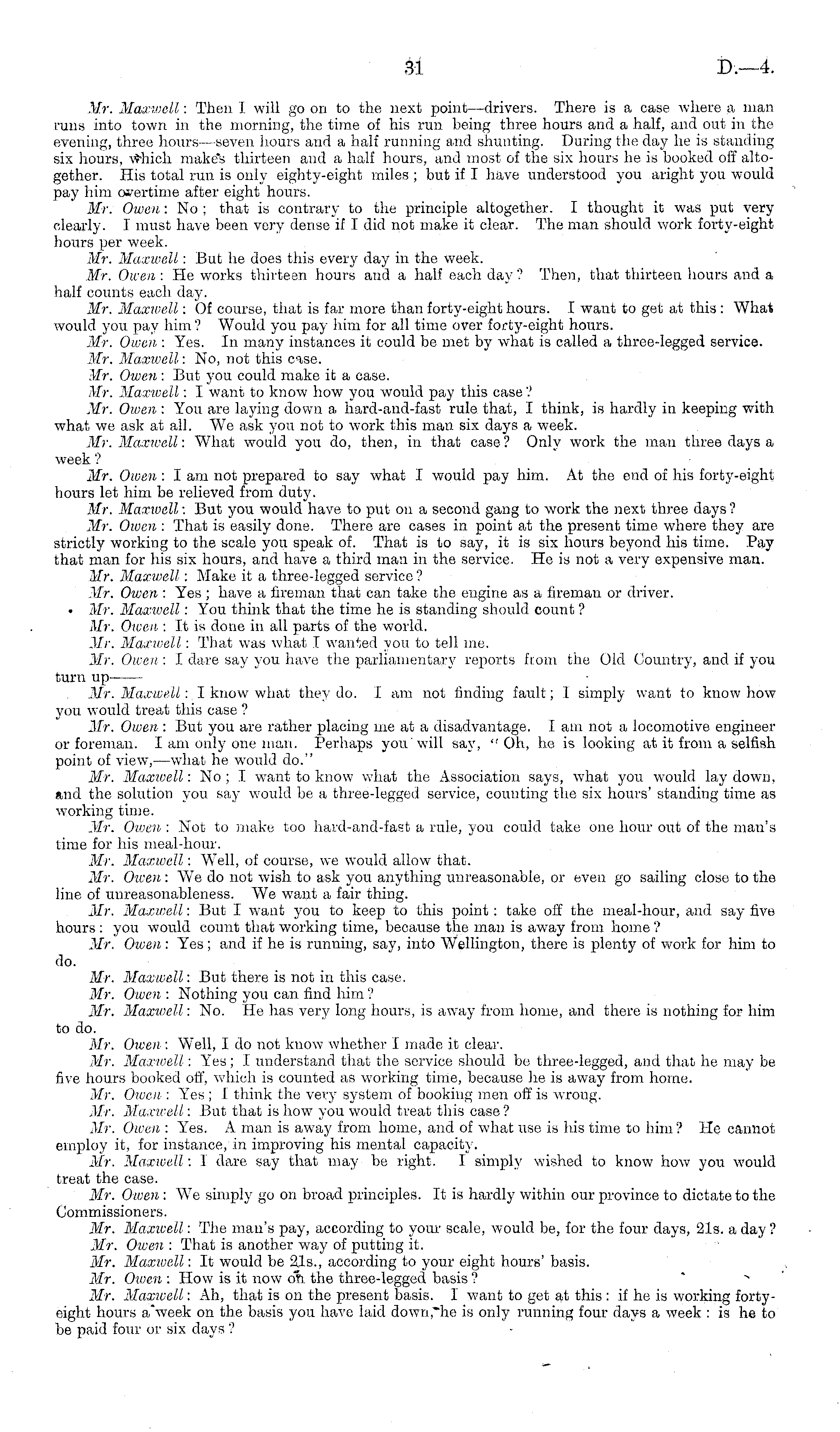 Mr. Maxwell : Then I will go on to the next point—drivers. There is a case where a man runs into town in the morning, the time of his run being three hours and a half, and out in the evening, three hours—seven hours and a half running and shunting. During the day he is standing six hours, which make's thirteen and a half hours, and most of the six hours he is booked off altogether. His total run is only eighty-eight miles ; but if I have understood you aright you would pay him overtime after eight hours. Mr. Owen: No ; that is contrary to the principle altogether. I thought it was put very clearly. I must have been very dense if I did not make it clear. The man should work forty-eight hours per week. Mr. Maxwell : But he does this every day in the week. Mr. Owen :He works thirteen hours and a half each day ? Then, that thirteen hours and a half counts each day. Mr. Maxwell : Of course, that is far more than forty-eight hours. I want to get at this : What would you pay him ? Would you pay him for all time over forty-eight hours. Mr. Owen : Yes. In many instances it could be met by what is called a three-legged service. Mr. Maxwell: No, not this case. Mr. Oiven: But you could make it a case. Mr. Maxwell: I want to know how you would pay this case ? Mr. Owen : You are laying down a hard-and-fast rule that, I think, is hardly in keeping with what we ask at all. W Te ask you not to work this man six days a week. Mr. Maxwell: What would you do, then, in that case? Only work the man three days a week ? Mr. Owen :I am not prepared to say what I would pay him. At the end of his forty-eight hours let him be relieved from duty. Mr. Maxwell : But you would have to put on a second gang to work the next three days ? Mr. Owen : That is easily done. There are cases in point at the present time where they are strictly working to the scale you speak of. That is to say, it is six hours beyond his time. Pay that man for his six hours, and have a third man in the service. He is not a very expensive man. Mr. Maxwell : Make it a three-legged service'? Mr. Owen : Yes ; have a fireman that can take the engine as a tireman or driver. • Mr. Maxwell: You think that the time he is standing should count ? Mr. Owen : It is done in all parts of the world. Mr. Maxwell: That was what I wanted you to tell me. Mr. Owen- : I dare say you have the parliamentary reports from the Old Country, and if you turn up Mr. Maxwell: I know what they do. 1 am not finding fault; I simply want to know how you w:ould treat this case ? Mr. Owen : But you are rather placing me at a disadvantage, iam not a locomotive engineer or foreman. lam only one man. Perhaps you will say, "Oh, he is looking at it from a selfish point of view,—what he would do." Mr. Maxioell: No; I want to know what the Association says, what you would lay down, and the solution you say would be a three-legged service, counting the six hours' standing time as working time. Mr. Owen : Not to make too hard-and-fast a rule, yon could take, one hour out of the mau's time for his meal-hour. Mr. Maxwell : Well, of course, we would allow that. Mr. Owen: We do not wish to ask you anything unreasonable, or even go sailing close to the line of unreasonableness. We want a fair thing. Mr. Maxv;ell: But I want you to keep to this point : take off the meal-hour, and say five hours : you would count that working time, because the man is away from home ? Mr. Owen : Yes; and if he is running, say, into Wellington, there is plenty of work for him to do. Mr. Maxwell: But there is not in this case. Mr. Owen : Nothing you can find him ? Mr. Maxwell: No. He has very long hours, is away from home, and there is nothing for him to do. Mr. Owen: Well, Ido not know whether I made it clear. Mr. Maxwell: Yes; I understand that the service should be three-legged, and that he may be five hours booked off, which is counted as working time, because he is away from home. Mr. Owen : Yes ; I think the very system of booking men off is wrong. Mr. Maxwell: But that is how you would treat this case'? Mr. Owen : Yes. A man is away from home, and of what use is his time to him ? He cannot employ it, for instance, in improving his mental capacity. Mr. Maxwell: I dare say that may be right. I simply wished to know how you would treat the case. Mr. Owen :We simply go on broad principles. It is hardly withiu our province to dictate to the Commissioners. Mr. Maxwell: The man's pay, according to your scale, would be, for the four days, 21s. a day'? Mr. Owen : That is another way of putting it. Mr. Maxwell: It would be 2.15., according to your eight hours' basis. Mr. Owen : How is it now oh the three-legged basis ? Mr. Maxwell : Ah, that is on the present basis. I want to get at this :ifhe is working fortyeight hours a'week on the basis you have laid down "he is only running four days a week : is he to be paid four or six days ?