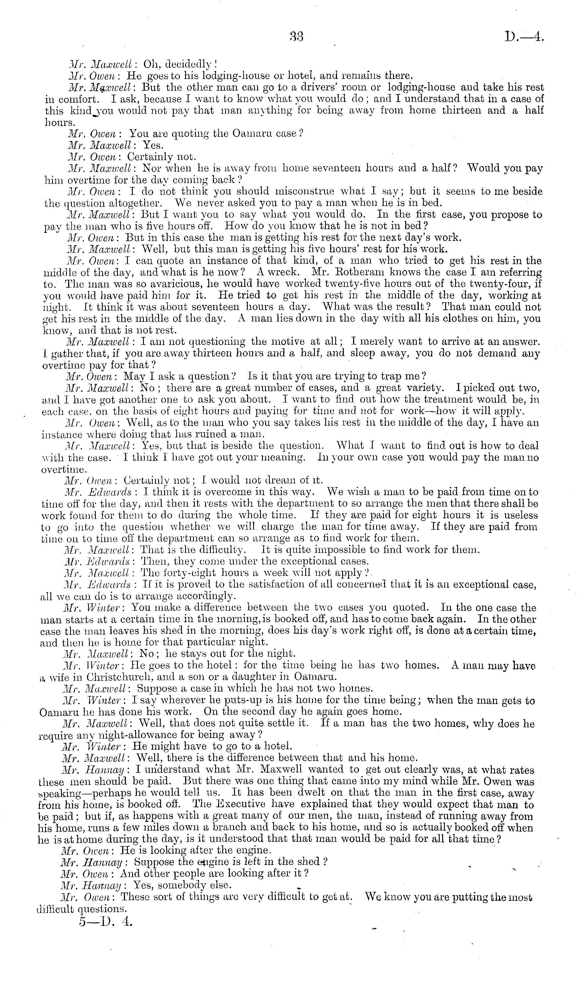 Mr. Maxwell : Oil, decidedly ! Mr. Owen : He goes to his lodging-house or hotel, and remains there. Mr. Maxwell: But the other man cau go to a drivers' room or lodging-house and take his rest in comfort. I ask, because I want to know what you would do; and I understand that in a case of this kindj^ou would not pay that man anything for being away from home thirteen and a half hours. Mr. Owen : You are quoting the Oamaru case ? Mr. Maxwell: Yes. Mr. Owen: Certainly not. Mr. Maxwell: Nor when he is away from home seventeen hours and a half? Would you pay him overtime for the day coining back ? Mr. Owen : I do not think you should misconstrue what I say; but it seems to me beside the question altogether. We never asked you to pay a man when he is in bed. Mr. Maxwell: But I want you to say what you would do. In the first case, you propose to pay the man who is five hours off. How do you know that he is not in bed? Mr. Owen : But in this case the man is getting his rest for the next day's work. Mr. Maxwell: Well, but this man is getting his five hours' rest for his work. Mr. Owen: I can quote an instance of that kind, of a man who tried to get his rest in the middle of the day, and what is he now ? A wreck. Mr. Eotheram knows the case lam referring to. The man was so avaricious, he would have worked twenty-five hours out of the twenty-four, if you would have paid him for it. He tried to get his rest in the middle of the day, working at night. It think it was about seventeen hours a day. What was the result? That man could not get his rest in the middle of the day. A man lies down in the day with all his clothes on him, you know, and that is not rest. Mr. Maxwell: lam not questioning the motive at all; I merely want to arrive at an answer. I gather that, if you are away thirteen hours and a half, and sleep away, you do not demand any overtime pay for that ? Mr. Oiven: May I ask a question ? Is it that you are trying to trap me ? Mr. Maxwell : No ; there are a great number of cases, and a great variety. 1 picked out two, and I have got another one to ask you about. I want to find out how the treatment would be, in each case, on the basis of eight hours and paying for time and not for work—how it will apply. Mr. Owen: Well, as to the man who you say takes his vest in the middle of the day, I have an instance where doing that has ruined a man. Mr. Maxwell : Yes, but that is beside the question. What I want to find out is how to deal with the case. I think I have got out your meaning. In your own case you would pay the man no overtime. Mr. Owen : Certainly not; I would not dream of it. Mr, Edwards : I think it is overcome in this way. We wish a man to be paid from time onto time off for the day, and then it rests with the department to so arrange the men that there shall be work found for them to do during the whole time. If they are paid for eight hours it is useless to go into the question whether we will charge the man for time away. If they are paid from lime on to time off the department can so arrange as to find work for them. Mr. Maxwell: That is the difficulty. It is quite impossible to find work for them. Mr. Edwards : Then, they come under the exceptional cases. Mr. Maxwell: The forty-eight hours a week will not apply ? Mr. Edwards : If it is proved to the satisfaction of all concerned that it is an exceptional case, all we can. do is to arrange accordingly, Mr. Winter: You make a difference between the two cases yon quoted. In the one case the man starts at a certain time in the morning, is booked off, and has to come back again. In the other case the man leaves his shed in the morning, does his day's work right off, is done at a certain time, and then he is home for that particular night. Mr. Maxwell: No; he stays out for the night. Mr. Winter: He goes to the hotel: for the time being lie lias two homes. A man may have a wife in Christchurch, and a son or a daughter in Oamaru. Mr. Maxwell: Suppose a case in which he has not two homes. Mr. Winter: I say wherever he puts-up is his home for the time being; when the man gets to Oamaru he has done his work. On the second clay he again goes home. Mr. Maxwell: Well, that does not quite settle it. If a man has the two homes, why does he require any night-allowance for being away ? Mr. Winter : He might have to go to a hotel. Mr. Maxwell: Well, there is the difference between that and his home. Mr. Hannay: I understand what Mr. Maxwell wanted to gat out clearly was, at what rates these men should be paid. But there was one thing that came into my mind while Mr. Owen was speaking —perhaps he would tell us. It has been dwelt on that the man in the first case, away from his home, is booked off. The Executive have explained that they would expect that man to be paid; but if, as happens with a great many of our men, the man, instead of running away from his home, runs a few miles down a branch and back to his home, and so is actually booked off when he is at home during the day, is it understood that that man would be paid for all that time ? Mr. Owen: He is looking after the engine. Mr. Hannay : Suppose the engine is left in the shed ? Mr. Owen : And other people are looking after it ? Mr. Haitnay : Yes, somebody else. Mr. Owen: These sort, of tilings are very difficult to get at. We know you are putting the most difficult questions. 5—D. 4.