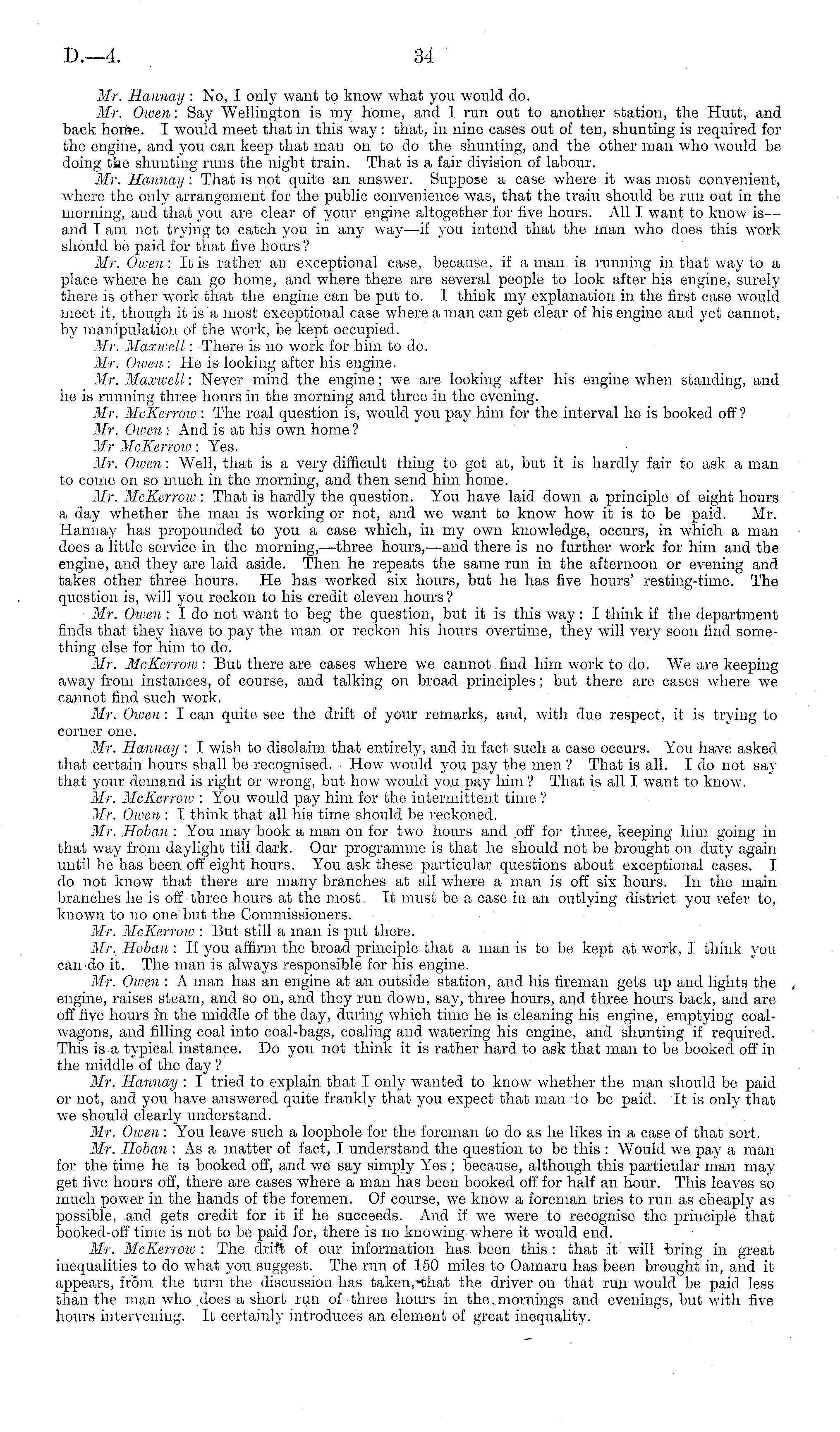 Mr. Hannay : No, I only want to know what you would do. Mr. Owen : Say Wellington is my homo, and 1 run out to another station, the Hutt, and back hoi-fte. I would meet that in this way : that, in nine cases out of ten, shunting is required for the engine, and you can keep that man on to do the shunting, and the other man who would be doing the shunting runs the night train. That is a fair division of labour. Mr. Ilannaij : That is not quite an answer. Suppose a case where it was most convenient, where the only arrangement for the public convenience was, that the train should be run out in the morning, and that you are clear of your engine altogether for five hours. All I want to know is— and I am not trying to catch you in any way —if you intend that the man who does this work should be paid for that five hours ? Mr. Owen: It is rather an exceptional case, because, if a man is running in that way to a place w 7here he can go home, and where there are several people to look after his engine, surely there is other work that the engine can be put to. I think my explanation in the first case would meet it, though it is a most exceptional case where a man can get clear of his engine and yet cannot, by manipulation of the work, be kept occupied. Mr. Maxivcll : There is no work for him to do. Mr. Owen. : He is looking after his engine. Mr. Max-well : Never mind the engine; we are looking after his engine when standing, and he is running three hours in the morning and three in the evening. Mr. McKerrow : The real question is, would you pay him for the interval he is booked off? Mr. Owen : And is at his ow Tn home ? Mr McKerrow : Yes. Mr. Owen : Well, that is a very difficult thing to get at, but it is hardly fair Co ask a man to come on so much in the morning, and then send him home. Mr. McKerrow : That is hardly the question. You have laid down a principle of eight hours a day whether the man is working or not, and we want to know how it is to be paid. Mr. Hannay has propounded to you a case which, in my own knowledge, occurs, in which a man does a little service in the morning,—three hours, —and there is no further work for him and the engine, and they are laid aside. Then he repeats the same run in the afternoon or evening and takes other three hours. He has worked six hours, but he has five hours' resting-time. The question is, will you reckon to his credit eleven hours ? Mr. Owen : I do not want to beg the question, but it is this way : I think if the department finds that they have to pay the man or reckon his hours overtime, they will very soon find something else for him to do. Mr. McKerrow : But there are cases where we cannot find him work to do. We are keeping away from instances, of course, and talking on broad principles; but there are cases where we cannot find such work. Mr. Owen : I can quite see the drift of your remarks, and, with duo respect, it is trying to corner one. Mr. Hannay : I wish to disclaim that entirely, and in fact such a case occurs. You have asked that certain hours shall be recognised. How would you pay the men ? That is all. Ido not say that your demand is right or wrong, but how would you pay him ? That is all I want to know. Mr. McKerrow : You would pay him for the intermittent time ? Mr. Owen : I think that all his time should be reckoned. Mr. Hoban : You may book a man on for two hours and off for three, keeping him going in that way from daylight till dark. Our programme is that he should not be brought on duty again until he has been off eight hours. You ask these particular questions about exceptional cases. I do not know that there are many branches at all where a man is off six hours. In the main branches he is off three hours at the most, It must be a case in an outlying district you refer to, known to no one but the Commissioners. Mr. McKerrow : But still a man is put there. Mr. Hoban : If you affirm the broad principle that a man is to be kept at work, I think you can'do it. The man is always responsible for his engine. Mr. Owen : A man has an engine at an outside station, and his fireman gets up and lights the engine, raises steam, and so on, and they run down, say, three hours, and three hours back, and are off five hours in the middle of the day, during which time he is cleaning his engine, emptying coalwagons, and filling coal into coal-bags, coaling and watering his engine, and shunting if required. This is a typical instance. Do you not think it is rather hard to ask that man to be booked off iv the middle of the day ? Mr. Hannay : I tried to explain that I only wanted to know whether the man should be paid or not, and you have answered quite frankly that you expect that man to be paid. It is only that we should clearly understand. Mr. Owen : You leave such a loophole for the foreman to do as he likes in a case of that sort. Mr. Hoban :As a matter of fact, I understand the question to be this : Would w Te pay a man for the time he is booked off, and we say simply Yes ; because, although this particular man may get five hours off, there are cases where a man has been booked off for half an hour. This leaves so much power in the hands of the foremen. Of course, we know a foreman tries to run as cheaply as possible, and gets credit for it if he succeeds. And if we were to recognise the principle that booked-off time is not to be paid for, there is no knowing where it would end. Mr. McKerrow : The drift of our information has. been this : that it will tiring in great inequalities to do what you suggest. The run of 150 miles to Oamaru has been brought in, and it appears, from the turn the discussion has taken,-that the driver on that nm would be paid less than the man who does a short ran of three hours in the,mornings and evenings, but with five hours intervening. It certainly introduces an element of great inequality.