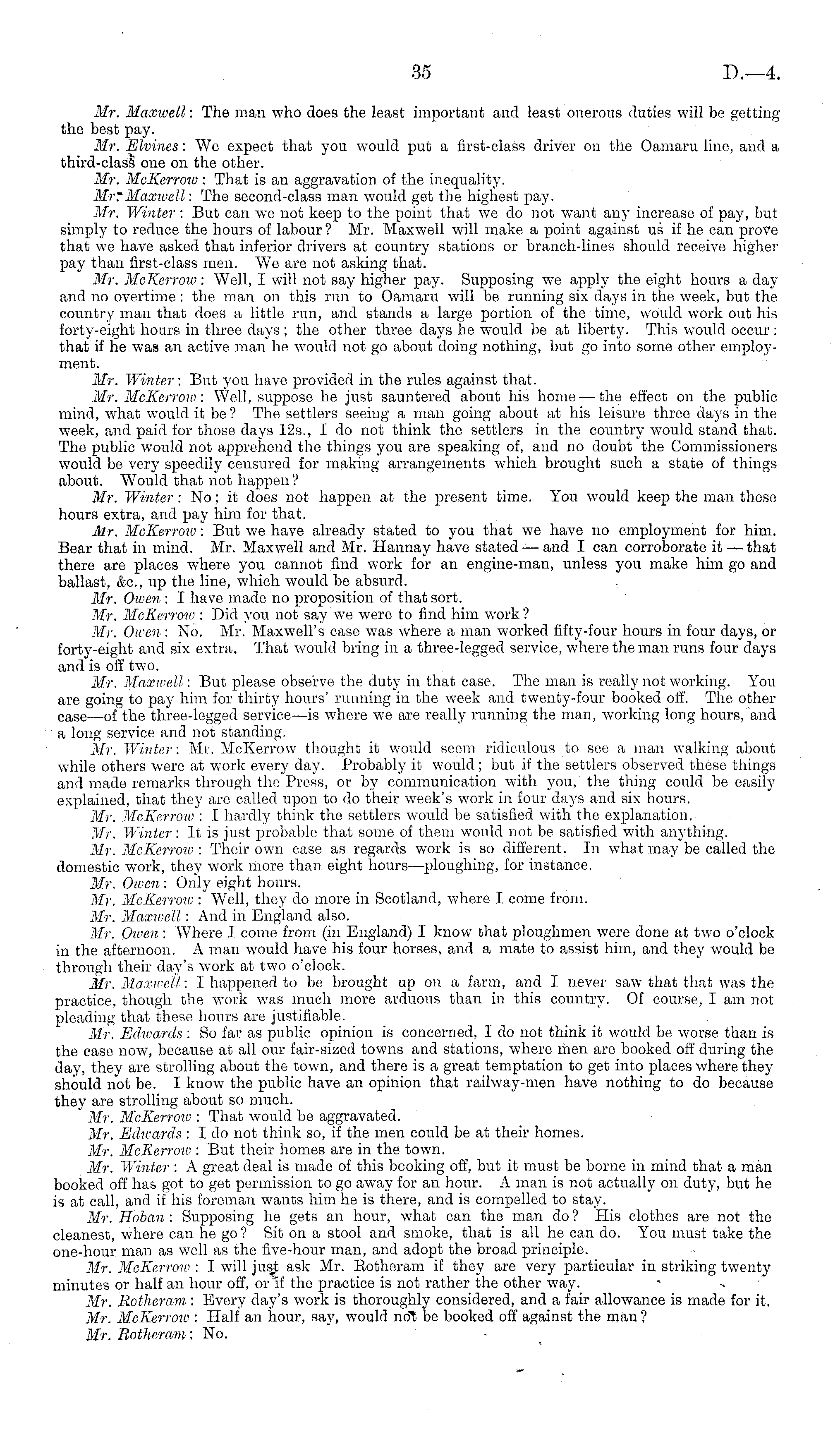 Mr. Maxwell: The man who does the least important and least onerous duties will be getting the best pay. Mr. Elvines: We expect that you would put a first-class driver on the Oamaru line, and a third-class' one on the other. Mr. McKerrow : That is an aggravation of the inequality. Mr? Maxwel l: The second-class man would get the highest pay. Mr. Winter : But can we not keep to the point that we do not want any increase of pay, but simply to reduce the hours of labour ? Mr. Maxwell will make a point against us if he can prove that we have asked that inferior drivers at country stations or branch-lines should receive higher pay than first-class men. We are not asking that. Mr. McKerrow : Well, I will not say higher pay. Supposing we apply the eight hours a day and no overtime: the man on this run to Oamaru will be running six days in the week, but the country man that does a little run, and stands a large portion of the time, would work out his forty-eight hoars in three days ; the other three days he would be at liberty. This would occur : that if he was an active man he would not go about doing nothing, but go into some other employment. Mr. Winter: But you have provided in the rules against that. Mr. McKerrow: Well, suppose he just sauntered about his home — the effect on the public mind, what would it be ? The settlers seeing a man going about at his leisure three days in the week, and paid for those days 125., I do not think the settlers in the country would stand that. The public would not apprehend the things you are speaking of, and no doubt the Commissioners would be very speedily censured for making arrangements which brought such a state of things about. Would that not happen? Mr. Winter: No; it does not happen at the present time. You would keep the man these hours extra, and pay him for that. Mr. McKerrow : But we have already stated to you that we have no employment for him. Bear that in mind. Mr. Maxwell and Mr. Hannay have stated — and I can corroborate it — that there are places where you cannot find work for an engine-man, unless you make him go and ballast, &c, up the line, which would be absurd. Mr. Owen : I have made no proposition of that sort. Mr. McKerrow : Did you not say we were to find him work ? Mr. Owen : No. Mr. Maxwell's case was where a man worked fifty-four hours in four days, or forty-eight and six extra. That would bring in a three-legged service, where the man runs four days and is off two. Mr. Maxwell : But please observe the duty in that case. The man is really not working. You are going to pay him for thirty hours' running in the week and twenty-four booked off. The other case —of the three-legged service—is where we are really running the man, working long hours, and a long service and not standing. Mr. Winter: Mr. McKerrow thought it would seem ridiculous to see a man walking about while others were at work every day. Probably it would ; but if the settlers observed these things and made remarks through the Press, or by communication with you, the thing could be easily explained, that they are called upon to do their week's work in four days and six hours. Mr. McKerrow : I hardly think the settlers would be satisfied with the explanation. Mr. Winter: It is just probable that some of them would not be satisfied with anything. Mr. McKerrow : Their own case as regards work is so different. In what may be called the domestic work, they work more than eight hours —ploughing, for instance. Mr. Owen: Only eight hours. Mr. McKerrow : Well, they do more in Scotland, where I come from. Mr. Maxwell: And in England also. Mr. Owen : Where I come from (in England) I know that ploughmen were done at two o'clock in the afternoon. A man would have his four horses, and a mate to assist him, and they would be through their day's work at two o'clock. Mr. Maxwell: I happened to be brought up on a farm, and I never saw that that was the practice, though the work was much more arduous than in this country. Of course, lam not pleading that these hours are justifiable. Mr. Edwards : So far as public opinion is concerned, I do not think it would be worse than is the case now, because at all our fair-sized towns and stations, where men are booked off during the day, they are strolling about the town, and there is a great temptation to get into places where they should not be. I know the public have an opinion that railway-men have nothing to do because they are strolling about so much. Mr. McKerrow : That would be aggravated. Mr. Edwards : I do not think so, if the men could be at their homes. Mr. McKerrow : But their homes are in the town. Mr. Winter : A great deal is made of this booking off, but it must be borne in mind that a man booked off has got to get permission to go away for an hour. A man is not actually on duty, but he is at call, and if his foreman wants him he is there, and is compelled to stay. Mr. Hoban : Supposing he gets an hour, what can the man do ? His clothes are not the cleanest, where can he go ? Sit on a stool and smoke, that is all he can do. You must take the one-hour man as well as the five-hour man, and adopt the broad principle. Mr. McKerrow : I will just ask Mr. Eotheram if they are very particular in striking twenty minutes or half an hour off, or if the practice is not rather the other way. Mr. Rotheram : Every day's work is thoroughly considered, and a fair allowance is made for it, Mr. McKerrow : Half an hour, say, would not be booked off against the man ? Mr. Bother ami: No,