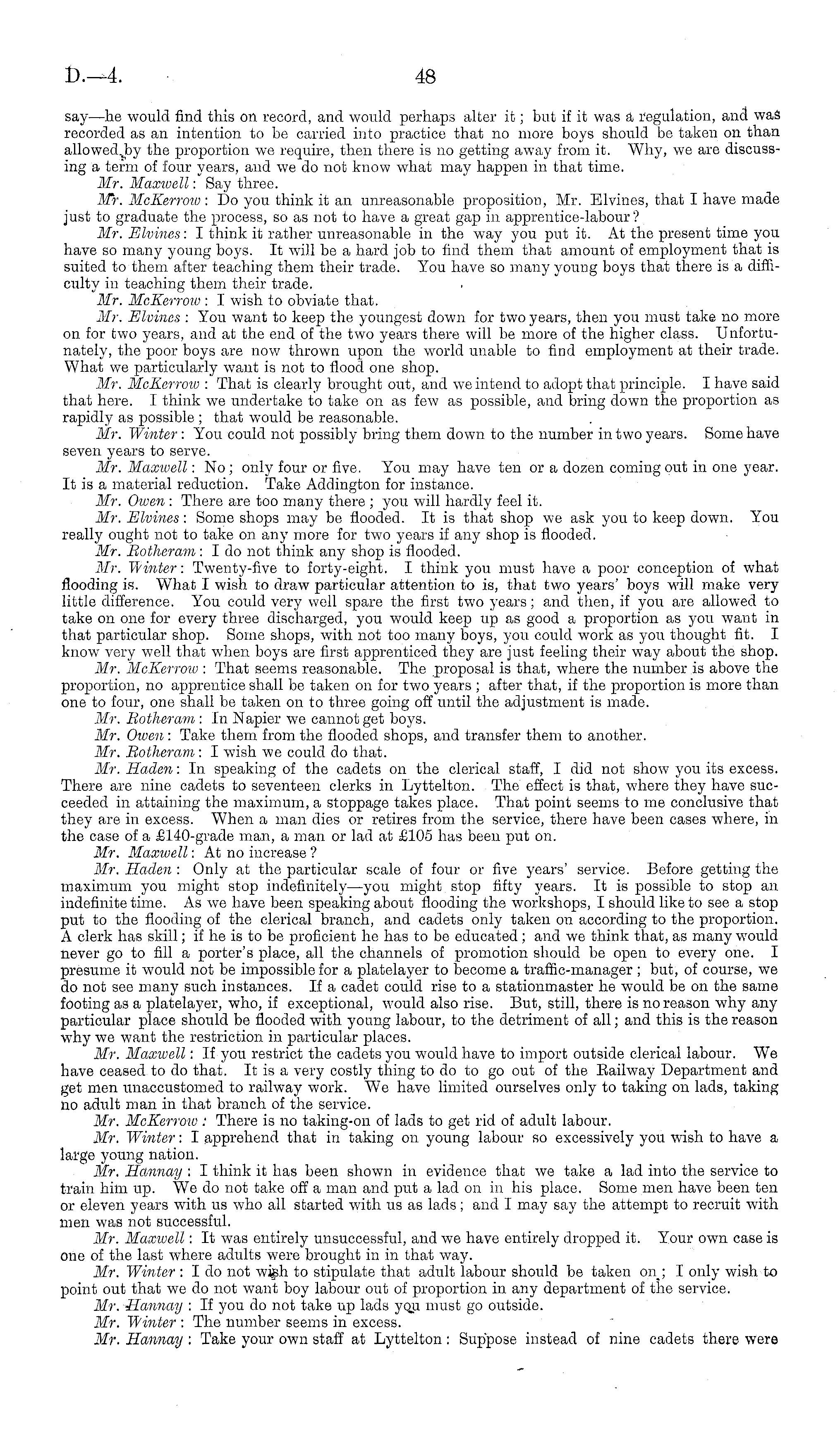 say—he would find this on record, and would perhaps alter it; but if it was a regulation, and was recorded as an intention to be carried into practice that no more boys should be taken on than allowedjby the proportion we require, then there is no getting away from it. Why, we are discussing a term of four years, and we do not know what may happen in that time. Mr. Maxwell : Say three. Mr\ McKerrow : Do you think it an unreasonable proposition, Mr. Elvines, that I have made just to graduate the process, so as not to have a great gap in apprentice-labour ? Mr. Elvines: I think it rather unreasonable in the way you put it. At the present time you have so many young boys. It will be a hard job to find them that amount of employment that is suited to them after teaching them their trade. You have so many young boys that there is a difficulty in teaching them their trade. Mr. McKerrow : I wish to obviate that. Mr. Elvines : You want to keep the youngest down for two years, then you must take no more on for two years, and at the end of the two years there will be more of the higher class. Unfortunately, the poor boys are now thrown upon the world unable to find employment at their trade. What we particularly want is not to flood one shop. Mr. McKerrow : That is clearly brought out, and we intend to adopt that principle. I have said that here. I think we undertake to take on as few as possible, and bring down the proportion as rapidly as possible ; that would be reasonable. Mr. Winter : You could not possibly bring them down to the number in two years. Some have seven years to serve. Mr. Maxwell : No; only four or five. You may have ten or a dozen coming out in one year. It is a material reduction. Take Addington for instance. Mr. Owen : There are too many there ; you will hardly feel it. Mr. Elvines : Some shops may be flooded. It is that shop we ask you to keep down. You really ought not to take on any more for two years if any shop is flooded. Mr. Botheram : Ido not think any shop is flooded. Mr. Winter: Twenty-five to forty-eight. I think you must have a poor conception of what flooding is. What I wish to draw particular attention to is, that two years' boys will make very little difference. You could very well spare the first two years; and then, if you are allowed to take on one for every three discharged, you would keep up as good a proportion as you want in that particular shop. Some shops, with not too many boys, you could work as you thought fit. I know very well that when boys are first apprenticed they are just feeling their way about the shop. Mr. McKerrow : That seems reasonable. The proposal is that, where the number is above the proportion, no apprentice shall be taken on for two years ; after that, if the proportion is more than one to four, one shall be taken on to three going off until the adjustment is made. Mr. Botheram : In Napier we cannot get boys. Mr. Owen: Take them from the flooded shops, and transfer them to another. Mr. Botheram: I wish we could do that. Mr. Haden: In speaking of the cadets on the clerical staff, I did not show you its excess. There are nine cadets to seventeen clerks in Lyttelton. The effect is that, where they have succeeded in attaining the maximum, a stoppage takes place. That point seems to me conclusive that they are in excess. When a man dies or retires from the service, there have been cases where, in the case of a £140-grade man, a man or lad at £105 has been put on. Mr. Maxwell: At no increase ? Mr. Haden : Only at the particular scale of four or five years' service. Before getting the maximum you might stop indefinitely—you might stop fifty years. It is possible to stop an indefinite time. As we have been speaking about flooding the workshops, I should like to see a stop put to the flooding of the clerical branch, and cadets only taken on according to the proportion. A clerk has skill; if he is to be proficient he has to be educated; and we think that, as many would never go to fill a porter's place, all the channels of promotion should be open to every one. I presume it would not be impossible for a platelayer to become a traffic-manager ; but, of course, we do not see many such instances. If a cadet could rise to a statiomnaster he would be on the same footing as a platelayer, who, if exceptional, would also rise. But, still, there is no reason why any particular place should be flooded with young labour, to the detriment of all; and this is the reason why we want the restriction in particular places. Mr. Maxwell : If you restrict the cadets you would have to import outside clerical labour. We have ceased to do that. It is a very costly thing to do to go out of the Eailway Department and get men unaccustomed to railway work. We have limited ourselves only to taking on lads, taking no adult man in that branch of the service. Mr. McKerroiv : There is no taking-on of lads to get rid of adult labour. Mr. Winter: I apprehend that in taking on young labour so excessively you wish to have a large young nation. Mr. Hannay : I think it has been shown in evidence that we take a lad into the service to train him up. We do not take off a man and put a lad on in his place. Some men have been ten or eleven years with us who all started with us as lads ; and I may say the attempt to recruit with men was not successful. Mr. Maxwell : It was entirely unsuccessful, and we have entirely dropped it. Your own case is one of the last where adults were brought in in that way. Mr. Winter : I do not wigh to stipulate that adult labour should be taken on ; I only wish to point out that we do not want boy labour out of proportion in any department of the service. Mr. Hannay : If you do not take up lads yqu must go outside. Mr. Winter : The number seems in excess. Mr. Hannay : Take your own staff at Lyttelton: Suppose instead of nine cadets there were