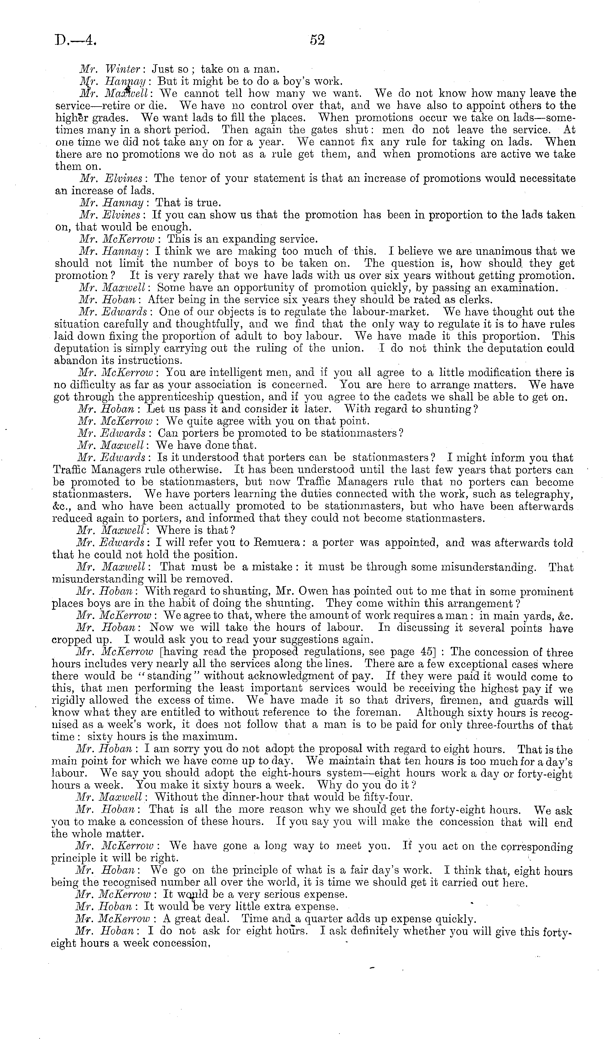 Mr. Winter : Just so ; take on a man. Mr. Hannay : But it might be to do a boy's work. Mr. MaSvell: We cannot tell how many we want. We do not know how many leave the service—retire or die. We have no control over that, and we have also to appoint others to the higher grades. We want lads to fill the places. When promotions occur we take on lads—sometimes many in a short period. Then again the gates shut : men do not leave the service. At one time we did not take any on for a year. We cannot fix any rule for taking on lads. When there are no promotions we do not as a rule get them, and when promotions are active we take them on. Mr. Elvines : The tenor of your statement is that an increase of promotions would necessitate an increase of lads. Mr. Hannay : That is true. Mr. Elvines : If you can show us that the promotion has been in proportion to the lads taken on, that would be enough. Mr. McEerrow : This is an expanding service. Mr. Hannay : I think we are making too much of this. I believe we are unanimous that we should not limit the number of boys to be taken on. The question is, how should, they get promotion ? It is very rarely that we have lads with us over six years without getting promotion. Mr. Maxwell: Some have an opportunity of promotion quickly, by passing an examination. Mr. Hoban : After being in the service six years they should be rated as clerks. Mr. Edwards : One of our objects is to regulate the labour-market. We have thought out the situation carefully and thoughtfully, and we find that the only way to regulate it is to have rules laid down fixing the proportion of adult to boy labour. We have made it this proportion. This deputation is simply carrying out the ruling of the union. Ido not think the deputation could abandon its instructions. Mr. McKerroiv: You are intelligent men, and if you all agree to a little modification there is no difficulty as far as your association is concerned. You are here to arrange matters. We have got through the apprenticeship question, and if you agree to the cadets we shall be able to get on. Mr. Hoban : Let us pass it and consider it later. With regard to shunting ? Mr. McKerroiv : We quite agree with you on that point. Mr. Edwards : Can porters be promoted to be stationmasters ? Mr. Maxwell : We have done that. Mr. Edwards :Is it understood that porters can be stationmasters ? I might inform you that Traffic Managers rule otherwise. It has been understood until the last few years that porters can be promoted to be stationmasters, but now Traffic Managers rule that no porters can become stationmasters. We have porters learning the duties connected with the work, such as telegraphy, &c, and who have been actually promoted to be stationmasters, but who have been afterwards reduced again to porters, and informed that they could not become stationmasters. Mr. Maxwell: Where is that ? Mr. Edwards : I will refer you to Eemuera : a porter was appointed, and was afterwards told that he could not hold the position. Mr. Maxwell: That must be a mistake :it must be through some misunderstanding. That misunderstanding will be removed. Mr. Hoban: With regard to shunting, Mr. Owen has pointed out to me that in some prominent places boys are in the habit of doing the shunting. They come within this arrangement ? Mr. McKerroiv : We agree to that, where the amount of work requires a man : in main yards, &c. Mr. Hoban: Now we will take the hours of labour. In discussing it several points have cropped up. I would ask you to read your suggestions again. Mr. McKerroiv [having read the proposed regulations, see page 45] : The concession of three hours includes very nearly all the services along the lines. There are a few exceptional cases where there would be " standing" without acknowledgment of pay. If they were paid it would come to this, that men performing the least important services would be receiving the highest pay if we rigidly allowed the excess of time. We have made it so that drivers, firemen, and guards will know what they are entitled to without reference to the foreman. Although sixty hours is recognised as a week's work, it does not follow that a man is to be paid for only three-fourths of that time : sixty hours is the maximum. Mr. Hoban :I am sorry you do not adopt the proposal with regard to eight hours. That is the main point for which we have come up to day. We maintain that ten hours is too much for a day's labour. We say you should adopt the eight-hours system —eight hours work a day or forty-eight hours a week. You make it sixty hours a week. Why do you do it ? Mr. Maxwell : Without the dinner-hour that would be fifty-four. Mr. Hoban : That is all the more reason why we should get the forty-eight hours. We ask you to make a concession of these hours. If you say you will make the concession that will end the whole matter. Mr. McKerroiv :We have gone a long way to meet you. If you act on the corresponding principle id will be right. Mr. Hoban: We go on the principle of what is a fair day's work. I think that, eight hours being the recognised number all over the world, it is time we should get it carried out here. Mr. McKerroiv : It would be a very serious expense. Mr. Hoban : It would be very little extra expense. Mr. McKerroiv : A great deal. Time and a quarter adds up expense quickly. Mr. Hoban : I do not ask for eight hours. I ask definitely whether you will give this fortyeight hours a week concession,