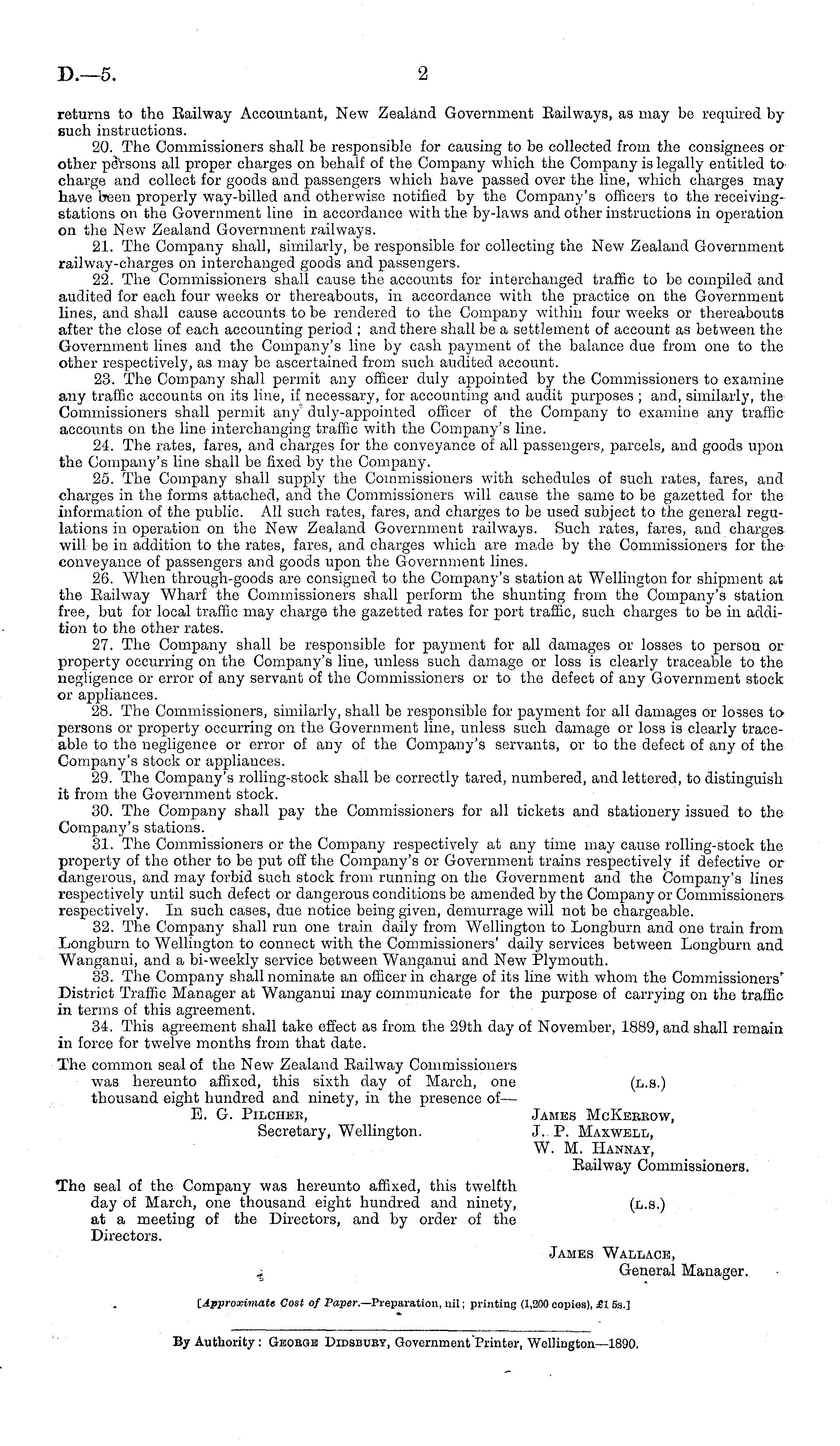 returns to the Eailway Accountant, New Zealand Government Bailways, as may be required by such instructions. 20. The Commissioners shall be responsible for causing to be collected from the consignees or other persons all proper charges on behalf of the Company which the Company is legally entitled to charge and collect for goods and passengers which have passed over the line, which charges may have been properly way-billed and otherwise notified by the Company's officers to tho receivingstations on the Government line in accordance with the by-laws and other instructions in operation on the New Zealand Government railways. 21. The Company shall, similarly, be responsible for collecting the New Zealand Government railway-charges on interchanged goods and passengers. 22. The Commissioners shall cause the accounts for interchanged traffic to be compiled and audited for each four weeks or thereabouts, in accordance with the practice on the Government lines, and shall cause accounts to be rendered to the Company within four weeks or thereabouts after the close of each accounting period ; and there shall be a settlement of account as between the Government lines and the Company's line by cash payment of the balance due from one to the other respectively, as may be ascertained from such audited account. 23. The Company shall permit any officer duly appointed by the Commissioners to examine any traffic accounts on its line, if necessary, for accounting and audit purposes ; and, similarly, the Commissioners shall permit any* duly-appointed officer of the Company to examine any traffic accounts on the line interchanging traffic with the Company's line. 24. The rates, fares, and charges for the conveyance of all passengers, parcels, and goods upon the Company's line shall be fixed by the Company. 25. The Company shall supply the Commissioners with schedules of such rates, fares, and charges in the forms attached, and the Commissioners will cause the same to be gazetted for the Information of the public. All such rates, fares, and charges to be used subject to the general regulations in operation on the New Zealand Government railways. Such rates, fares, and charges will be in addition to the rates, fares, and charges which are made by the Commissioners for the conveyance of passengers and goods upon the Government lines. 26. When through-goods are consigned to the Company's station at Wellington for shipment at the Eailway Wharf the Commissioners shall perform the shunting from the Company's station free, but for local traffic may charge the gazetted rates for port traffic, such charges to be in addition to the other rates. 27. The Company shall be responsible for payment for all damages or losses to person or property occurring on the Company's line, unless such damage or loss is clearly traceable to the negligence or error of any servant of the Commissioners or to the defect of any Government stock or appliances. 28. The Commissioners, similarly, shall be responsible for payment for all damages or losses to persons or property occurring on the Government line, unless such damage or loss is clearly traceable to the negligence or error of any of the Company's servants, or to the defect of any of the Company's stock or appliances. 29. The Company's rolling-stock shall be correctly tared, numbered, and lettered, to distinguish it from the Government stock. 30. The Company shall pay the Commissioners for all tickets and stationery issued to the Company's stations. 31. The Commissioners or the Company respectively at any time may cause rolling-stock the property of the other to be put off the Company's or Government trains respectively if defective or dangerous, and may forbid such stock from running on the Government and the Company's lines respectively until such defect or dangerous conditions be amended by the Company or Commissioners respectively. In such cases, due notice being given, demurrage will not be chargeable. 32. The Company shall run one train daily from Wellington to Longburn and one train from Longburn to Wellington to connect with the Commissioners' daily services between Longburn and Wanganui, and a bi-weekly service between Wanganui and New Plymouth. 33. The Company shall nominate an officer in charge of its line with whom the Commissioners'" District Traffic Manager at Wanganui may communicate for the purpose of carrying on the traffic in terms of this agreement. 34. This agreement shall take effect as from the 29th day of November, 1889, and shall remain in force for twelve months from that date. The common seal of the New Zealand Eailway Commissioners was hereunto affixed, this sixth day of March, one (1.5.) thousand eight hundred and ninety, in the presence of— E. G. Pilchee, James McKbeeow, Secretary, Wellington. J. P. Maxwell, W. M. Hannay, Eailway Commissioners. The seal of the Company was hereunto affixed, this twelfth day of March, one thousand eight hundred and ninety, (1.5.) at a meeting of the Directors, and by order of the Directors. James Wallace, General Manager. [Approximate Cost of Paper.— Preparation, nil; printing (1,200 copies), £1 ss.]
