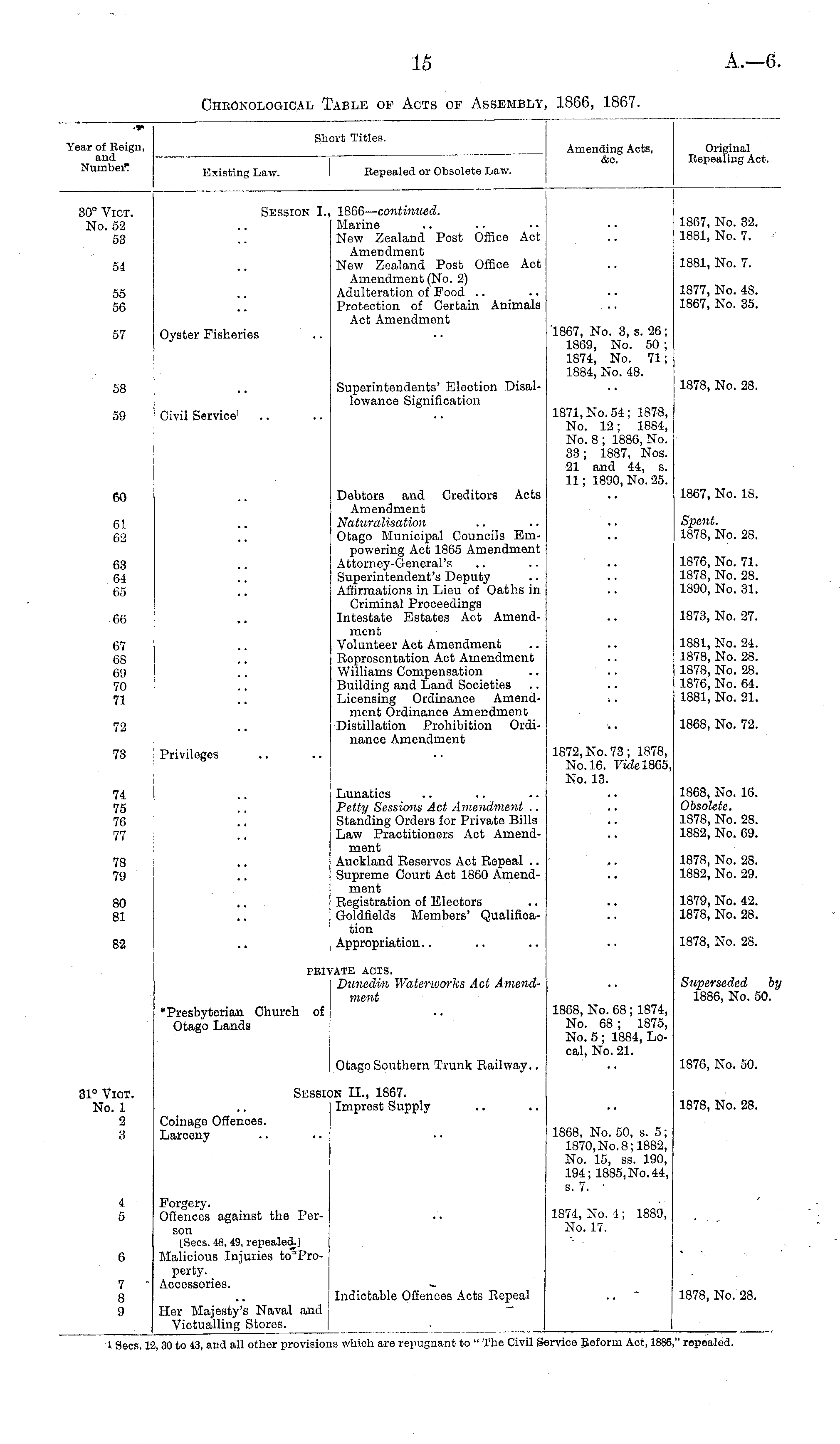 .* Year of Reign, and Number. Short Titles. Amending Acts, &e. Original Repealing Act. Existing Law. Repealed or Obsolete Law. 30° Vict. No. 52 53 Session I., , 1866 — continued. Marine New Zealand Post Office Act Amendment New Zealand Post Office Act Amendment (No. 2) Adulteration of Food Protection of Certain Animals Act Amendment 1867, No. 32. 1881, No. 7. 54 1881, No. 7. 55 56 1877, No. 48. 1867, No. 85. 57 Oyster Fisheries 1867, No. 3, s. 26; 1869, No. 50 ; 1874, No. 71; 1884, No. 48. 58 Superintendents' Election Disallowance Signification 1878, No. 28. 59 Civil Service 1 1871, No. 54; 1878, No. 12; 1884, No. 8; 1886, No. 33; 1887, Nos. 21 and 44, s. 11; 1890, No. 25. 1867, No. 18. 60 Debtors and Creditors Acts Amendment Naturalisation Otago Municipal Councils Empowering Act 1865 Amendment Attorney-General's Superintendent's Deputy Affirmations in Lieu of Oaths in Criminal Proceedings Intestate Estates Act Amendment Volunteer Act Amendment Bepresentation Act Amendment Williams Compensation Building and Land Societies Licensing Ordinance Amendment Ordinance Amendment Distillation Prohibition Ordinance Amendment 61 62 Spent. 1878, No. 28. 63 64 65 1876, No. 71. 1878, No. 28. 1890, No. 31. 66 1873, No. 27. 67 68 69 70 71 1881, No. 24. 1878, No. 28. 1878, No. 28. 1876, No. 64. 1881, No. 21. 72 1868, No. 72. 73 Privileges 1872, No. 73; 1878, No. 16. Fi_el865, No. 13. 1868, No. 16. Obsolete. 1878, No. 28. 1882, No. 69. 74 75 76 77 78 79 Lunatics Petty Sessions Act Amendment .. Standing Orders for Private Bills Law Practitioners Act Amendment Auckland Beserves Act Bepeal .. Supreme Court Act 1860 Amendment Begistration of Electors Goldfields Members' Qualification Appropriation 1878, No. 28. 1882, No. 29. 80 81 1879, No. 42. 1878, No. 28. 82 1878, No. 2S. PRIV .ate acts. Dunedin Waterworks Act Amendment Superseded b; 1886, No. 50. "Presbyterian Church of Otago Lands 1868, No. 68 ; 1874, No. 68; 1875, No. 5 ; 1884, Local, No. 21. Otago Southern Trunk Bailway.. 1876, No. 50. Sessio dn IL, 1867. Imprest Supply 31° Vict. No. 1 2 3 Coinage Offences. Larceny 1868, No. 50, s. 5; 1870, No. 8; 1882, No. 15, ss. 190, 194; 1885, No. 44, s. 7. ' 1878, No. 28. 4 5 Forgery. Offences against the Person [Sees. 48, 49, repealed.] Malicious Injuries to aProperty. _ Accessories. 1874, No. 4; 1889, No. 17. 6 Indictable Offences Acts Bepeal 7 8 9 1878, No. 28. Her Majesty's Naval and Victualling Stores. 1 Sees. 12, 30 to 43, and all other provisions which are repugnant to " The Civil Service Reform Act, 1886, ," repealed,