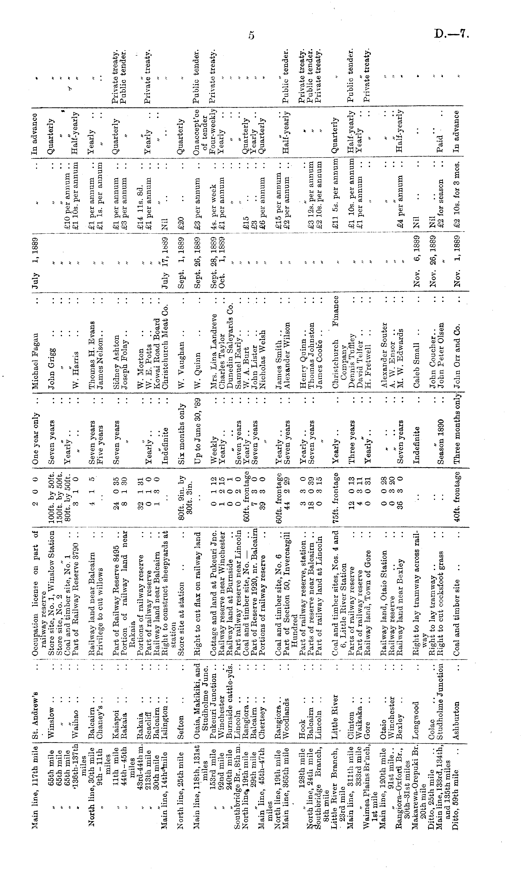 Main line, 117th mile 65th mile 65th mile „ 65th mile ■136th-137th miles North line, 30th mile 9th - 11th miles „ 11th mile 44th-45th miles 43rd-44thm. 213th mile „ 30th mile Main line, 14th taiile St. Andrew's .. ; Occupation license on part of 2 0 0 railway reserve Winslow .. .. | Store site, No. 1, Winslow Station 100ft. by 50ft. .. ! Store site, No. 2 „ 150ft. by 50ft. .. | Coal and timber site, No. 1 .. 80ft. by 50ft. Waihao .. .. j Part of Railway Reserve 3790 .. J 3 10 One year only .. Seven years Michael Pagan John Grigg July 1, 1889 In advance ] Quarterly Yearly £10 per annum .. £1 10s. per annum ' . W. Harris Half-yearly •_■ » Balcairn .. .. Railway land near Balcairn .. 4 15 Chaney's .. .. Privilege to cut willows Seven years Five years Thomas H. Evans James Nelson.. - £1 per annum .. „ £1 Is. per annum Yearly Kaiapoi .. .. Part of Railway Reserve 8495 .. 24 0 35 Rakaia .. .. Portion of railway land near 8 1 30 Rakaia Rakaia .. .. Portions of railway reserve .. 32 1 31 Seaclifl .. .. Part of railway reserve .. 0 10 Balcairn .. .. Railway land near Balcairn .. 13 0 Islington .. .. Right to construct sbeepyards at station Sefton .. .. Store site at station .. .. 80ft. 9in. by 30ft. 3in. Seven years Sidney Ashton Joseph Folay .. £1 per annum .. „ | £3 per annum .. Quarterly Private treaty. Public tender. Yearly Indefinite W. Morton W. E. Potts Kowai Road Board Christchurch Meat Co. £14 lis. 8d. „ £1 per annum .. July 17, 1889 Nil Sept. 1, 1889 £20 Yearly Private treaty. North line, 25th mile Six months only W. Vaughan .. Quarterly Main line, 118th, 131st miles „ 153rd mile „ 92nd mile 240th mile Southbridge Br., 8th m. North line, 19th mile 29th mile Main line, 45th-47th miles North line, 19th mile Main line, 365th mile Otaia, Makikiki, and Right to cut flax on railway land Studholme June. Pukeuri Junction .. Cottage and land at Pukeuri Jnc. 0 1 12 Winchester .. Railway reserve near Winchester 1 2 15 Buri_side cattle-yds. Railway land at Burnside .. 0 0 1 Lincoln .. .. Part railway reserve near Lincoln 0 2 0 Rangiora .. .. Coal and timber site, No. — .. 60ft. frontage Balcairn .. .. Part of Reserve 1920, nr. Balcairn 7 3 0 Chertsey .. .. Portions of railway reserve .. 39 3 0 Rangiora .. .. Coal and timber site, No. 6 .. 60ft. frontage Woodlands .. Part of Section 50, Invercargill 44 2 29 Hundred Hook .. .. Part of railway reserve, station .. 3 3 0 Balcairn .. .. Parts of reserve near Balcairn .. 18 0 39 Lincoln .. .. Part of railway land at Lincoln 0 3 15 Up to June 30, '89 Weekly Yearly .. Seven years Yearly Seven years W. Quinn Mrs. Lina Landreve Charles Taylor Dunedin Saleyards Co. Samuel Earlv.. W. A. Burt John Lister Nicholas Welsh Sept. 26, 1889 £3 per annum .. Sept. 28, 1889 4s. per week Oct. 1, 1889 £1 per annum .. 1 £15 £3 „ £6 per annum .. Onaccept'ce of tender Four-weekly Yearly Quarterly Yearly Quarterly Public tender. Private treaty. Yearly Seven years James Smith Alexander Wilson £15 per annum .. \ £2 per annum .. j Half-yearly Public tender. 128th mile North line, 24th mile S-0uthbridge Branch, 8th mile Little River Branch, 23rd mile Main line, 311th mile „ 333rd mile Waimea Plains Br'nch, 1st mile Main line, 120th mile „ 91st mile.. Rangiora-Oxford Br., 30th- 31st miles Makarewa-Orepuki Br. 20th mile Ditto, 25th mile Main line, 133rd, 134th, and 135th miles Ditto, 59th mile Yearly Seven years Henry Quinn Thomas Johnston James Cooke £3 12s. per annum £2 10s. per annum Private treaty. Public tender. Private treaty. Little River .. Coal and timber sites, Nos. 4 and 75ft. frontage 6, Little River Station Ciinton .. .. Parts of railway reserve .. 12 0 13 Waikaka .. .. Part of railway reserve .. 4 3 11 Gore .. .. Railway land, Town of Gore .. 0 0 31 Otaio .. .. Railway land, Otaio Station .. 0 0 28 Winchester .. Railway reserve .. .. 0 3 20 Bexley .. .. Railway land near Bexley .. 36 3 0 Longwood .. Right to lay tramway across railway Colac .. .. Right to lay tramway Studholme Junction Right to cut cocksfoot grass Yearly Three years Yearly Christchurch Finance Company Dennis Tuffley David Teller .. H. Fretwell Alexander Souter A. W. Ensor .. M. W. Edwards . | £11 5s. per annum j j £1 10s. per annum i £1 per annum .. „ Quarterly Half-yearly Yearly Public tender. Private treaty. Seven years £4 per annum .. Half-yearly Indefinite Caleb Small Nov. 6, 1889 Nil Season 1890 John Coucher.. John Peter Olsen Nov. 26, 1889 Nil „ £2 for season Paid „ Ashburton .. Coal and timber site .. .. 40ft. frontage Three months only John Orr and Co. Nov. 1, 1889 £2 10s. for 3 mos. In advance