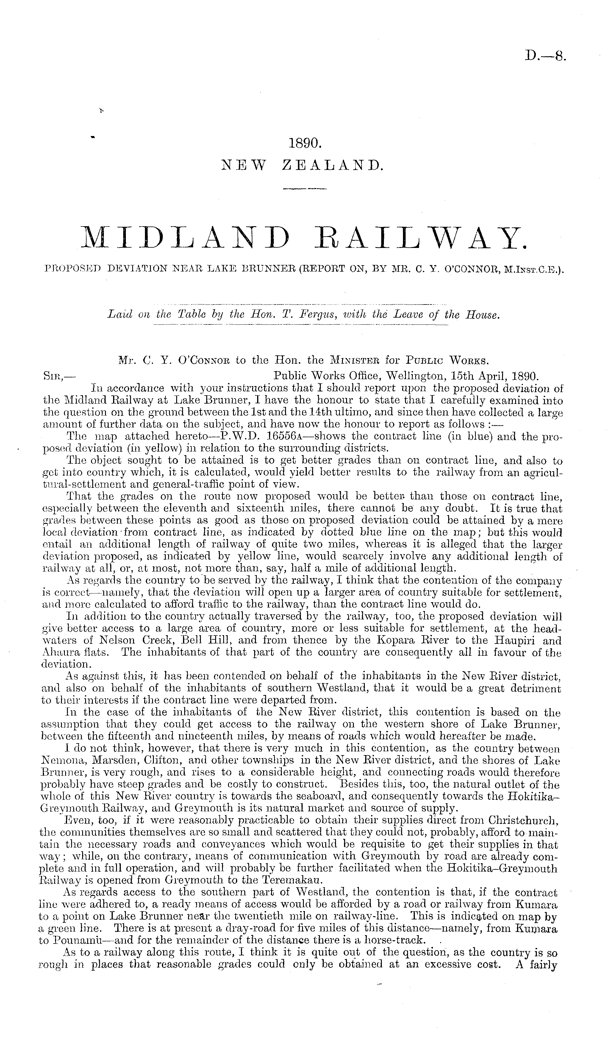 MIDLAND RAILWAY. PROPOSED DEVIATION NEAR LAKE BRUNNER (REPORT ON, BY MR. C. Y. O'CONNOR, M. Inst. C.E.).