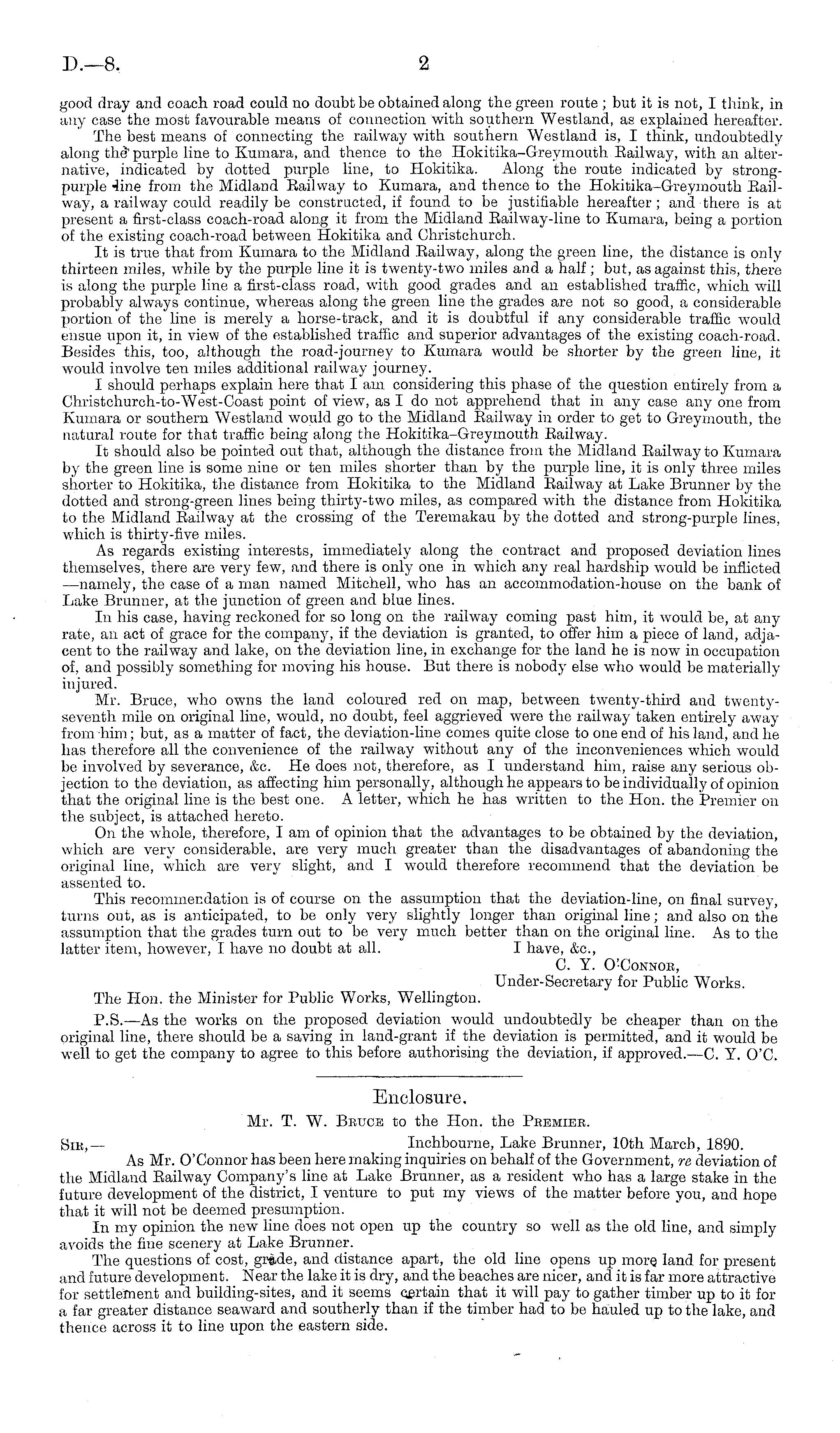 Enclosure. Mr. T. W. Bkuce to the Hon. the Pkemieb. Sir, — Inchbourne, Lake Brunner, 10th March, 1890. As Mr. O'Connor has been here making inquiries on behalf of the Government, re deviation of the Midland Eailway Company's line at Lake Brunner, as a resident who has a large stake in the future development of the district, I venture to put my views of the matter before you, and hope that it will not be deemed presumption. In my opinion the new line does not open up the country so well as the old line, and simply avoids the fine scenery at Lake Brunner. The questions of cost, grade, and distance apart, the old line opens up more land for present and future development. Near the lake it is dry, and the beaches are nicer, and it is far more attractive for settlement and building-sites, and it seems certain that it will pay to gather timber up to it for a far greater distance seaward and southerly than if the timber had to be hauled up to the lake, and thence across it to line upon the eastern side.