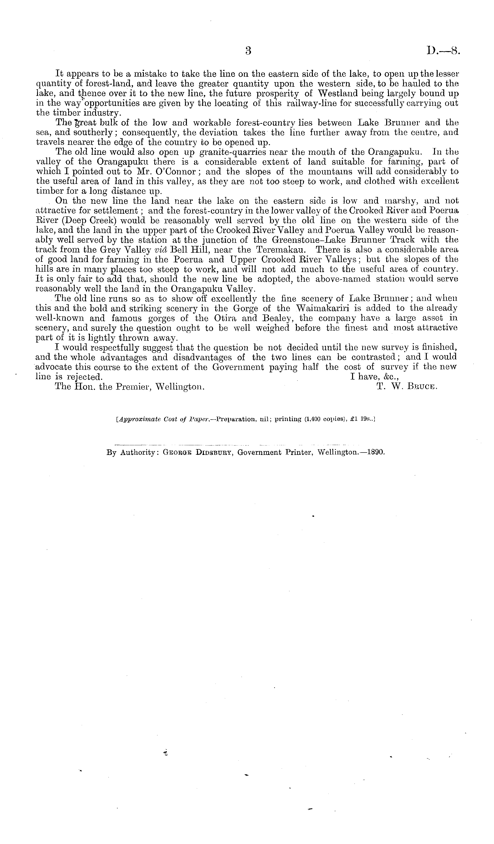 It appears to be a mistake to take the line on the eastern side of the lake, to open up the lesser quantity of forest-land, and leave the greater quantity upon the western side, to be hauled to the lake, and thence over it to the new line, the future prosperity of Westland being largely bound up in the way* opportunities are given by the locating of this railway-line for successfully carrying out the timber industry. The great bulk of the low and workable forest-country lies between Lake Brunner and the sea, and southerly; consequently, the deviation takes the line further away from the centre, and travels nearer the edge of the country bo be opened up. The old line would also open up granite-quarries near the mouth of the Orangapuku. In the valley of the Orangapuku there is a considerable extent of land suitable for farming, part of which I pointed out to Mr. O'Connor ; and the slopes of the mountains will add considerably to the useful area of land in this valley, as they are not too steep to work, and clothed with excellent timber for a long distance up. On the new line the land near the lake on the eastern side is low and marshy, and not attractive for settlement; and the forest-country in the lower valley of the Crooked River and Poerua River (Deep Creek) would be reasonably well served by the old line on the western side of the lake, and the land in the upper part of the Crooked River Valley and Poerua Valley would be reasonably well served by the station at the junction of the Greenstone-Lake Brunner Track with the track from the Grey Valley via Bell Hill, near the Teremakau. There is also a considerable area of good land for farming in the Poerua and Upper Crooked River Valleys; but the slopes of the hills are in many places too steep to work, and will not add much to the useful area of country. It is only fair to add that, should the new line be adopted, the above-named station would serve reasonably well the land in the Orangapuku Valley. The old line runs so as to show off excellently the fine scenery of Lake Brunner; and when this and the bold and striking scenery in the Gorge of the Waimakariri is added to the already well-known and famous gorges of the Otira and Bealey, the company have a large asset in scenery, and surely the question ought to be well weighed before the finest and most attractive part of it is lightly thrown away. I would respectfully suggest that the question be not decided until the new survey is finished, and the whole advantages and disadvantages of the two lines can be contrasted; and I would advocate this course to the extent of the Government paying half the cost of survey if the new line is rejected. I have, &c, The Hon. the Premier, Wellington. T. W. Bkuce.