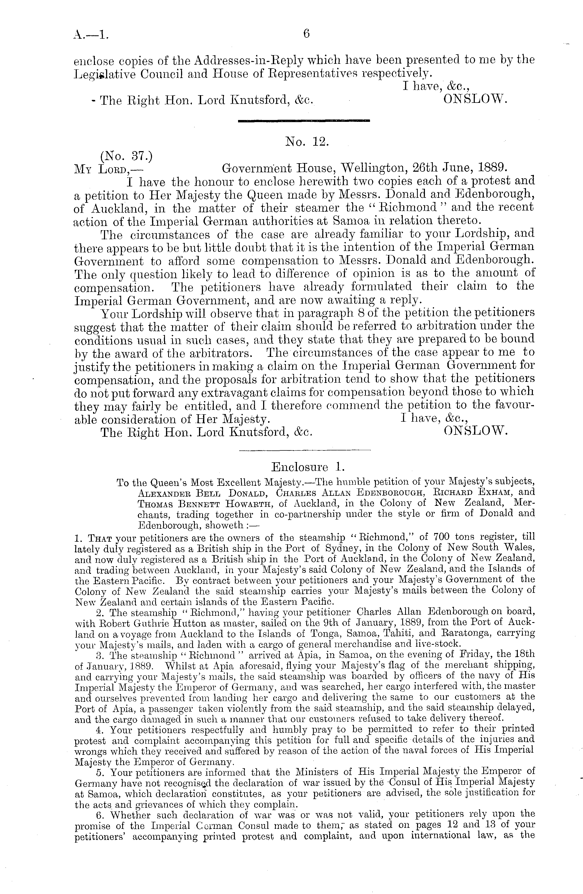 Enclosure 1. To the Queen's Most Excellent Majesty. —The humble petition of your Majesty's subjects, Alexandeb Bell Donald, Charles Allan Edenboeough, Eichaed Exham, and Thomas Bennett Howarth, of Auckland, in the Colony of New Zealand, Merchants, trading together in co-partnership under the style or firm of Donald and Edenborough, showeth : — 1. That your petitioners are the owners of the steamship " Bichmond," of 700 tons register, till lately duly registered as a British ship in the Port of Sydney, in the Colony of New South Wales, and now duly registered as a British ship in the Port of Auckland, in the Colony of New Zealand, and trading between Auckland, in your Majesty's said Colony of New Zealand, and the Islands of the Eastern Pacific. By contract between your petitioners and your Majesty's Government of the Colony of New Zealand the said steamship carries your Majesty's mails between the Colony of New Zealand and certain islands of the Eastern Pacific. 2. The steamship " Bichmond," having your petitioner Charles Allan Edenborough on board, with Bobert Guthrie Hutton as master, sailed on the 9th of January, 1889, from the Port of Auckland on a voyage from Auckland to the Islands of Tonga, Samoa, Tahiti, and Baratonga, carrying your Majesty's mails, and laden with a cargo of general merchandise and live-stock. 3. The steamship " Bichmond " arrived at Apia, in Samoa, on the evening of Friday, the 18th of January, 1889. Whilst at Apia aforesaid, flying your Majesty's flag of the merchant shipping, and carrying your Majesty's mails, the said steamship was boarded by officers of the navy of His Imperial Majesty the Emperor of Germany, and was searched, her cargo interfered with, the master and ourselves prevented from landing her cargo and delivering the same to our customers at the Port of Apia, a passenger taken violently from the said steamship, and the said steamship delayed, and the cargo damaged in such a manner that our customers refused to take delivery thereof. 4. Your petitioners respectfully and humbly pray to be permitted to refer to their printed protest and complaint accompanying this petition for full and specific details of the injuries and wrongs which they received and suffered by reason of the action of the naval forces of His Imperial Majesty the Emperor of Germany. 5. Your petitioners are informed that the Ministers of His Imperial Majesty the Emperor of Germany have not recognised the declaration of war issued by the Consul of His Imperial Majesty at Samoa, which declaration constitutes, as your petitioners are advised, the sole justification for the acts and grievances of which they complain. 6. Whether such declaration of war was or was not valid, your petitioners rely upon the promise of the Imperial Curman Consul made to them,- as stated on pages 12 and 13 of your petitioners' accompanying printed protest and complaint, and upon international law, as the
