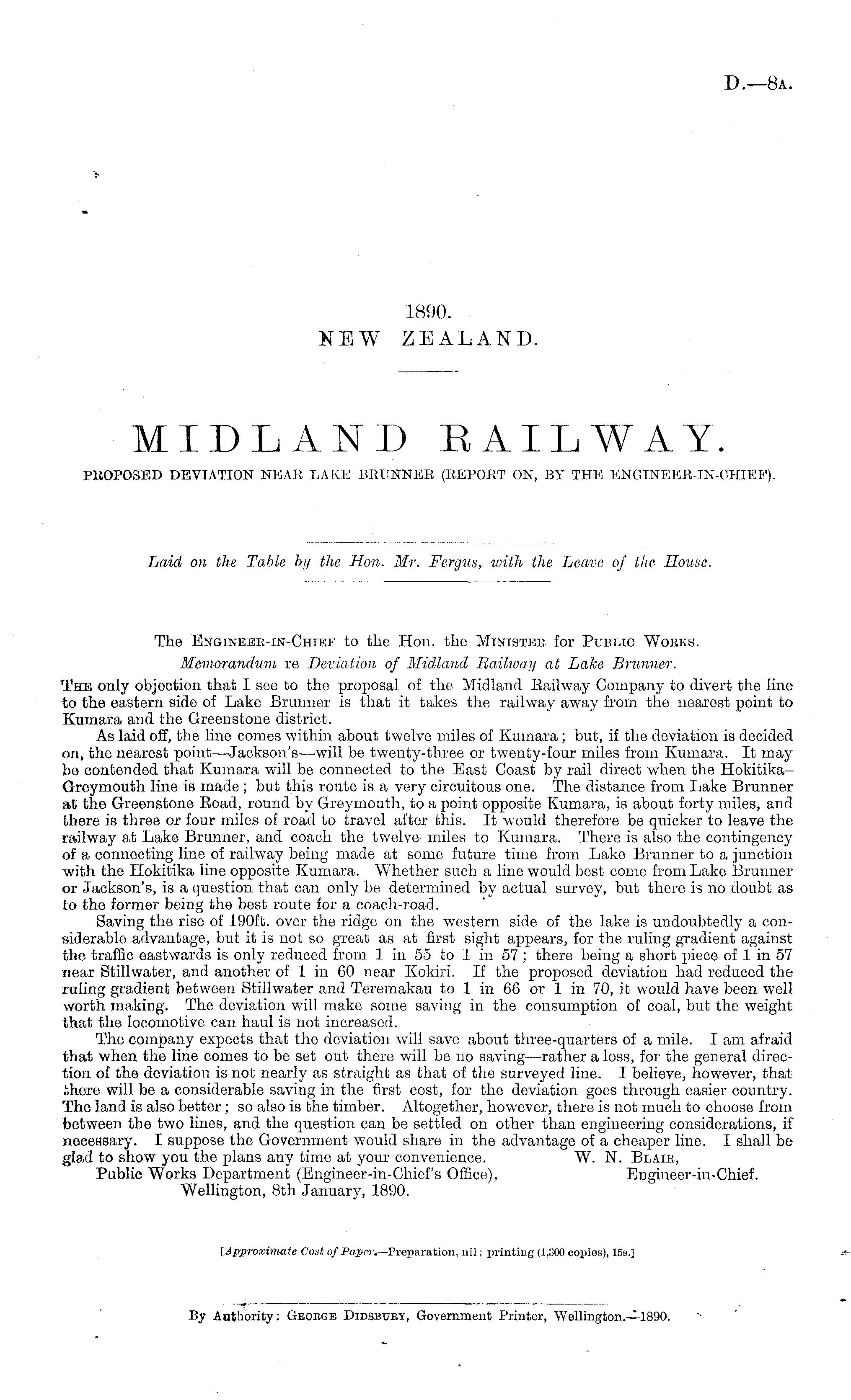 MIDLAND RAILWAY. PROPOSED DEVIATION NEAR LAKE BRUNNER (REPORT ON, BY THE ENGINEER-IN-CHIEF).
