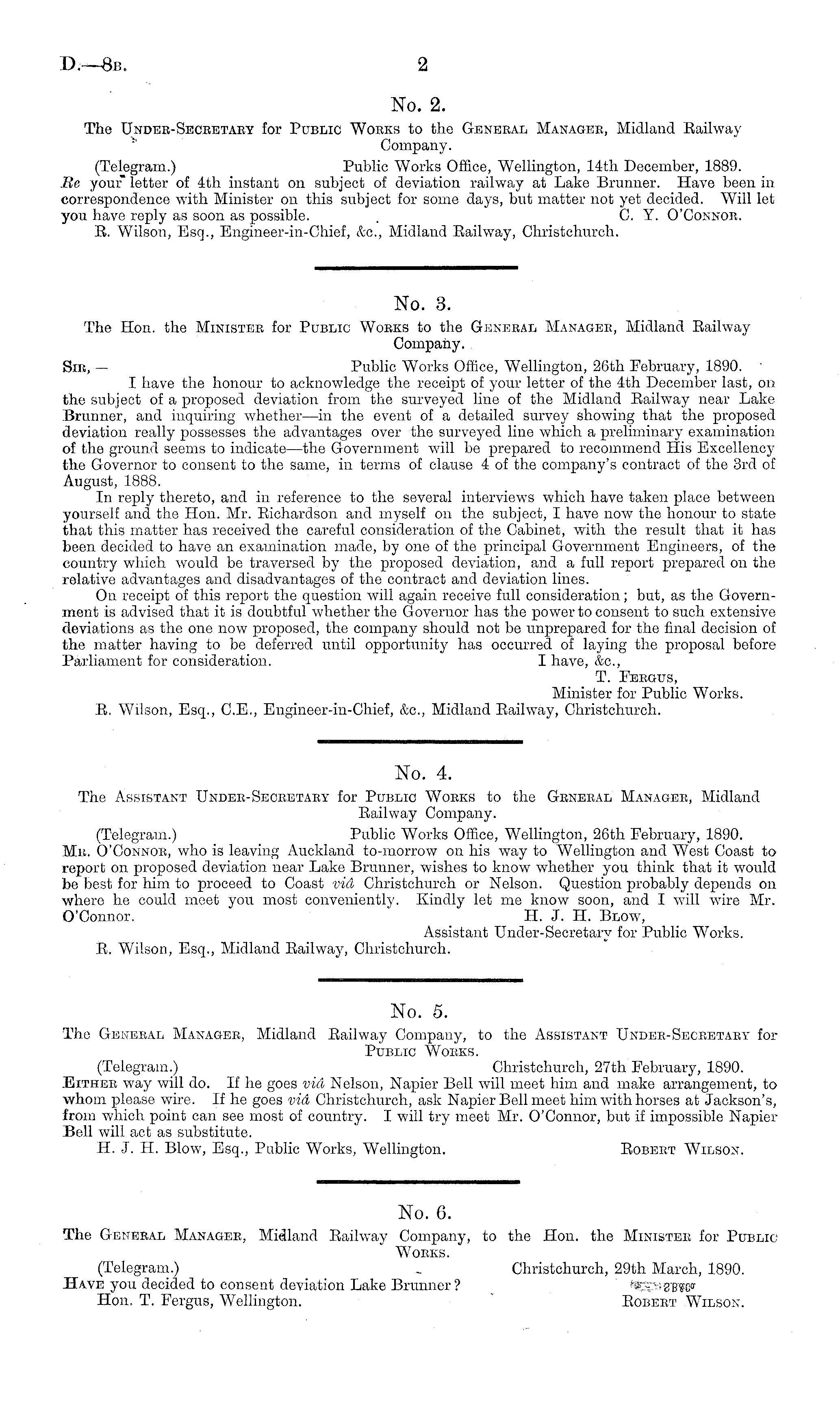 No. 4. The Assistant Under-Secretary for Public Works to the Grneral Manager, Midland Eailway Company. (Telegram.) Public Works Office, Wellington, 26th February, 1890. Mr. O'Connor, who is leaving Auckland to-morrow on his way to Wellington and West Coast to report on proposed deviation near Lake Brunner, wishes to know whether you think that it would be best for him to proceed to Coast via Christchurch or Nelson. Question probably depends on where he could meet you most conveniently. Kindly let me know soon, and I will wire Mr. O'Connor. H. J. H. Blow, Assistant Under-Secretary for Public Works. E. Wilson, Esq., Midland Eailway, Christchurch.