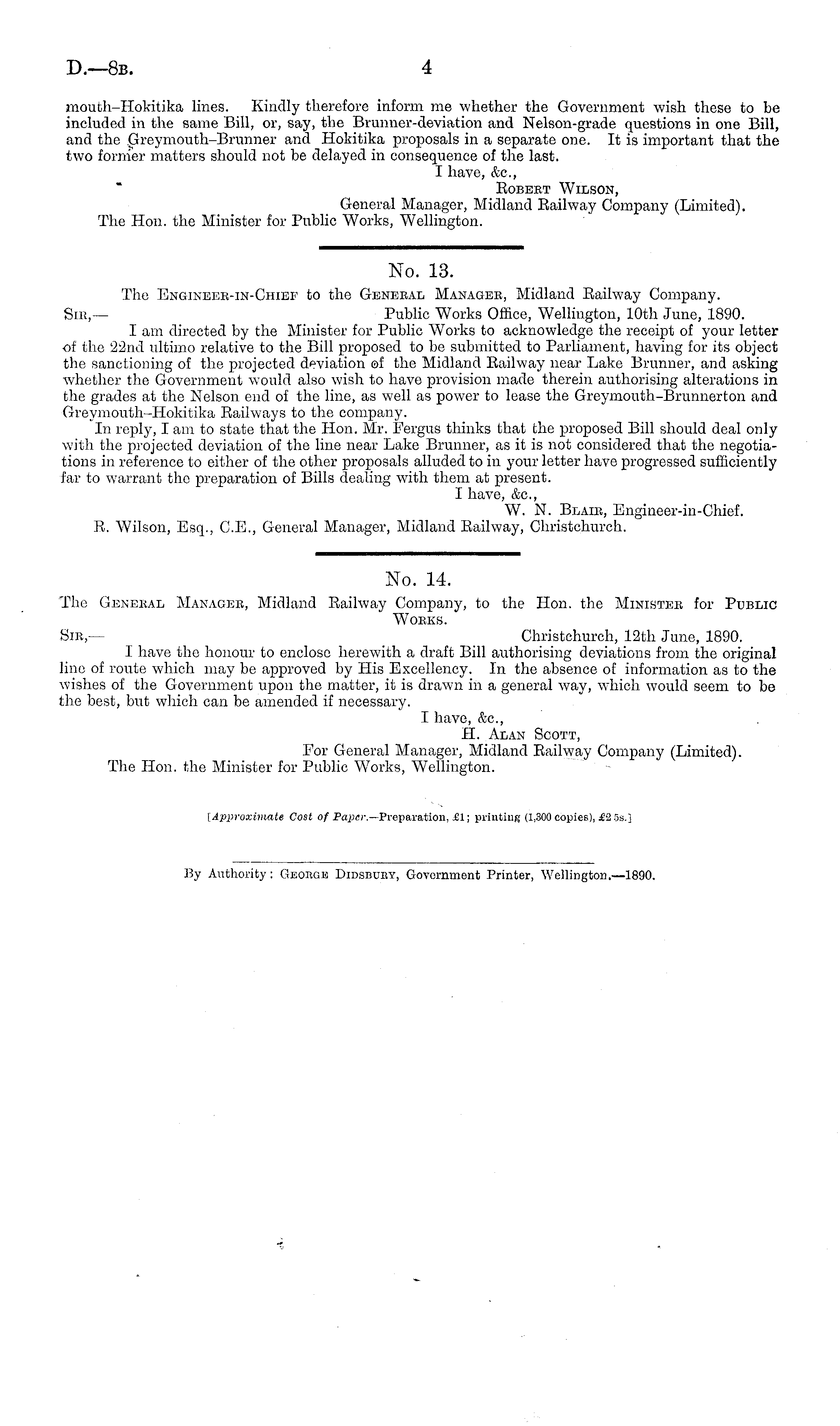 No. 13. The Engineer-in-Chiep to the General Manager, Midland Eailway Company. Sir,— Public Works Office, Wellington, 10th June, 1890. I am directed by the Minister for Public Works to acknowledge the receipt of your letter of the 22nd ultimo relative to the Bill proposed to be submitted to Parliament, having for its object the sanctioning of the projected deviation ©f the Midland Eailway near Lake Brunner, and asking whether the Government would also wish to have provision made therein authorising alterations in the grades at the Nelson end of the line, as well as power to lease the Greymouth-Brunnerton and Greymouth-Hokitika Eailways to the company. In reply, I am to state that the Hon. Mr. Fergus thinks that the proposed Bill should deal only with the projected deviation of the line near Lake Brunner, as it is not considered that the negotiations in reference to either of the other proposals alluded to in your letter have progressed sufficiently far to warrant the preparation of Bills dealing with them at present. I have, &c., W. N. Blair, Engineer-in-Chief. E. Wilson, Esq., C.E., General Manager, Midland Eailway, Christchurch.