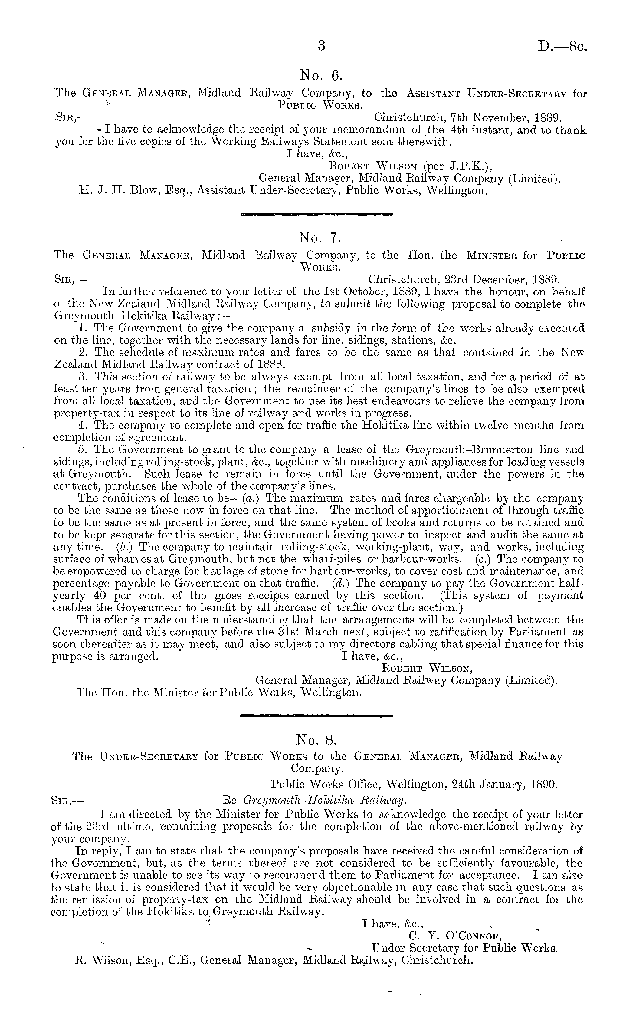 No. 8. The Under-Secretary for Public Works to the General Manager, Midland Eailway Company. Public Works Office, Wellington, 24th January, 1890. Sir, — Be Greymouth—Hokitika Bailivay. I am directed by the Minister for Public Works to acknowledge the receipt of your letter of the 23rd ultimo, containing proposals for the completion of the above-mentioned railway by your company. In reply, I am to state that the company's proposals have received the careful consideration of the Government, but, as the terms thereof are not considered to be sufficiently favourable, the Government is unable to see its way to recommend them to Parliament for acceptance. lam also to state that it is considered that it would be very objectionable in any case that such questions as the remission of property-tax on the Midland Eailway should be involved in a contract for the completion of the Hokitika to. Greymouth Eailway. I have, &c, C. Y. O'Connor, Under-Secretary for Public Works. B. Wilson, Esq., C.E., General Manager, Midland Eailway, Christchurch.