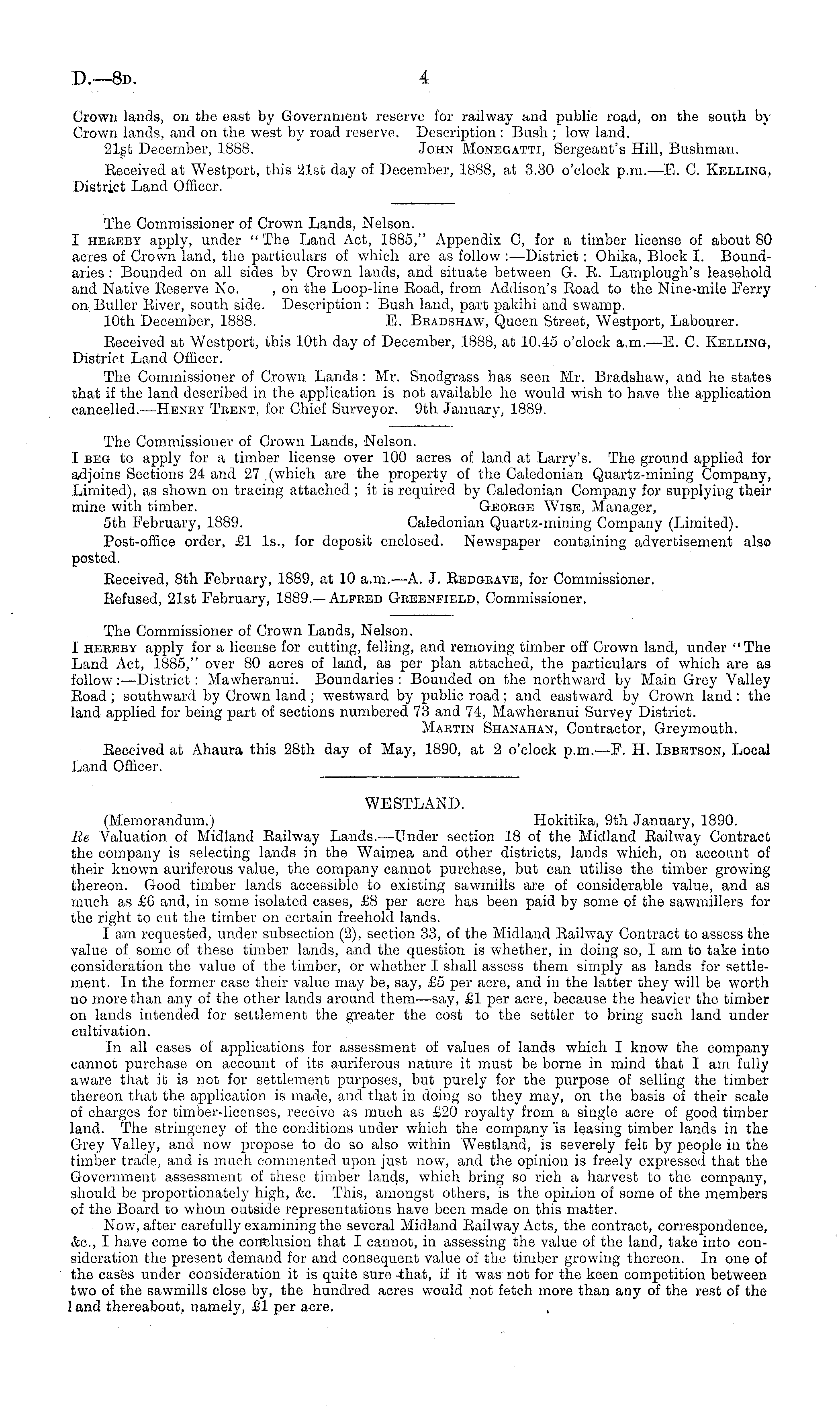 Crown lands, on the east by Government reserve for railway and public road, on the south by Crown lands, and on the west by road reserve. Description : Bush ; low land. 21ft December, 1888. John Monegatti, Sergeant's Hill, Bushman. Received at Westport, this 21st day of December, 1888, at 3.30 o'clock p.m.—E. C. Kelling. District Land Officer.