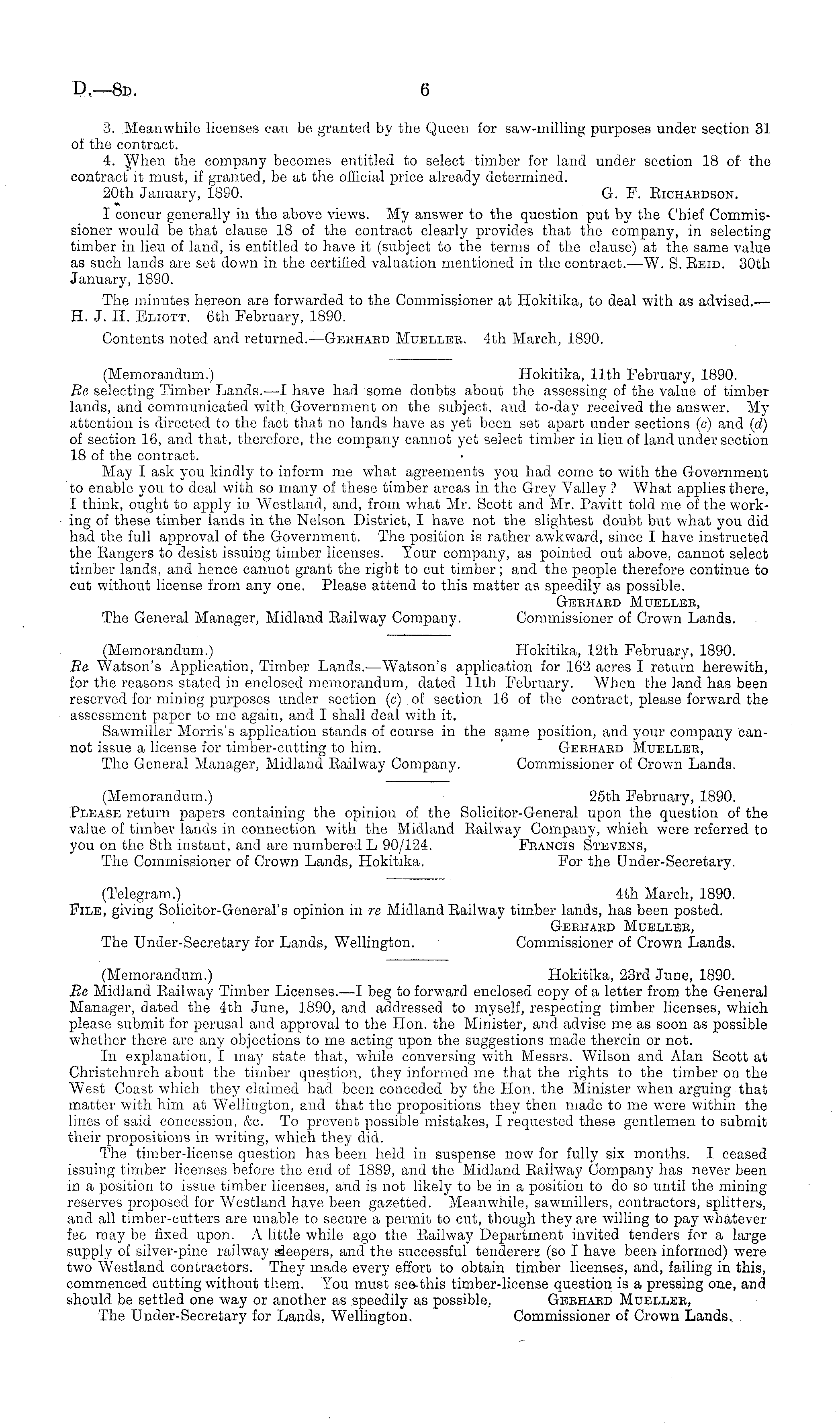 3. Meanwhile licenses can be granted by the Queen for saw-milling purposes under section 31 of the contract. 4. When the company becomes entitled to select timber for land under section 18 of the contract it must, if granted, be at the official price already determined. 20th January, 1890. G. F. Eichaedson. I concur generally in the above views. My answer to the question put by the Chief Commissioner would be that clause 18 of the contract clearly provides that the company, in selecting timber in lieu of land, is entitled to have it (subject to the terms of the clause) at the same value as such lands are set down in the certified valuation mentioned in the contract. —W. S. Eeid. 30th January, 1890. The minutes hereon are forwarded to the Commissioner at Hokitika, to deal with as advised.— H. J. H. Eliott. 6th February, 1890. Contents noted and returned.—Geehaed Muellee. 4th March, 1890.