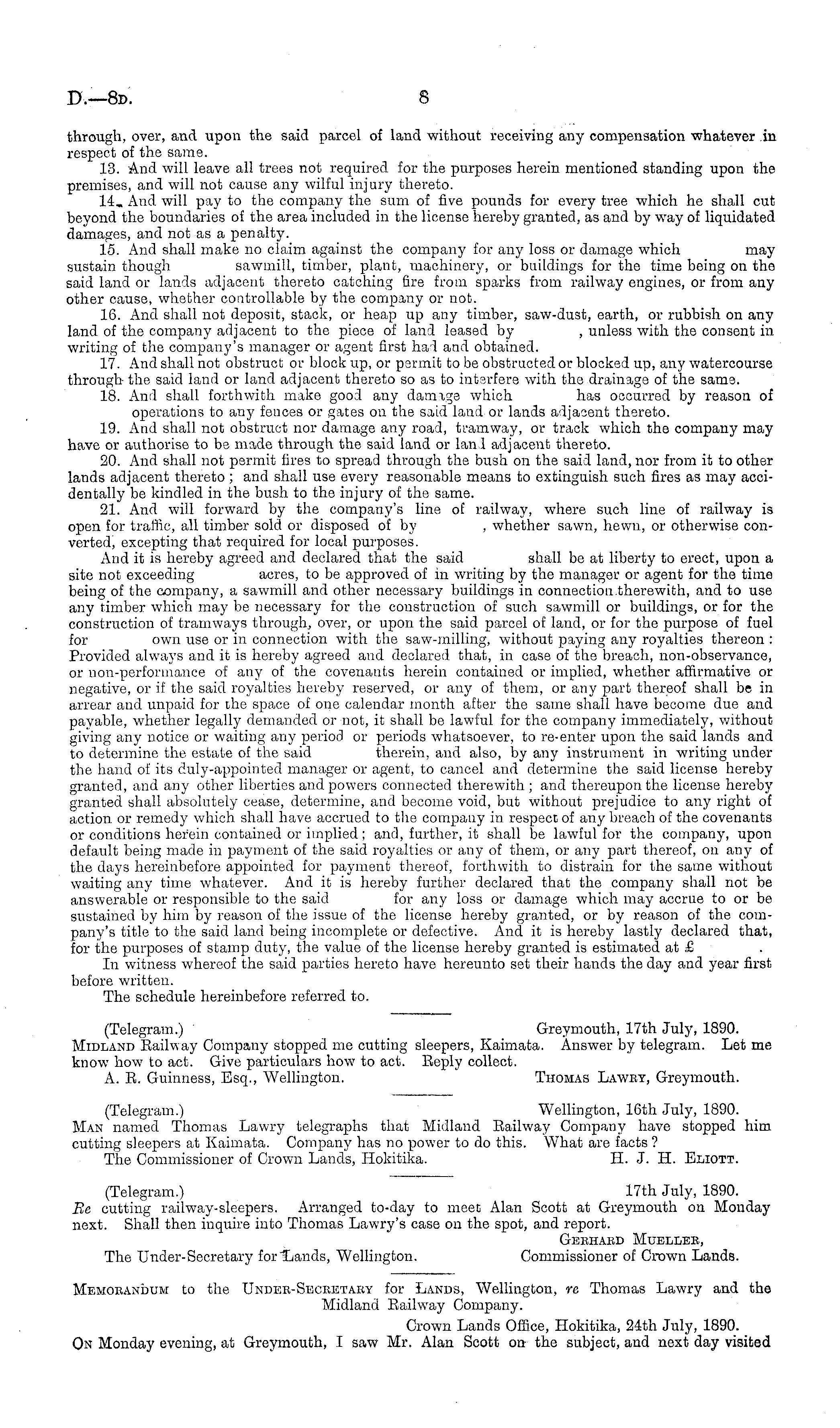 Memorandum to the Undeb-Secretaby for Lands, Wellington, re, Thomas Lawry and the Midland Eailway Company. Crown Lands Office, Hokitika, 24th July, 1890. On Monday evening, at Greymouth, I saw Mr. Alan Scott on the subject, and next day visited