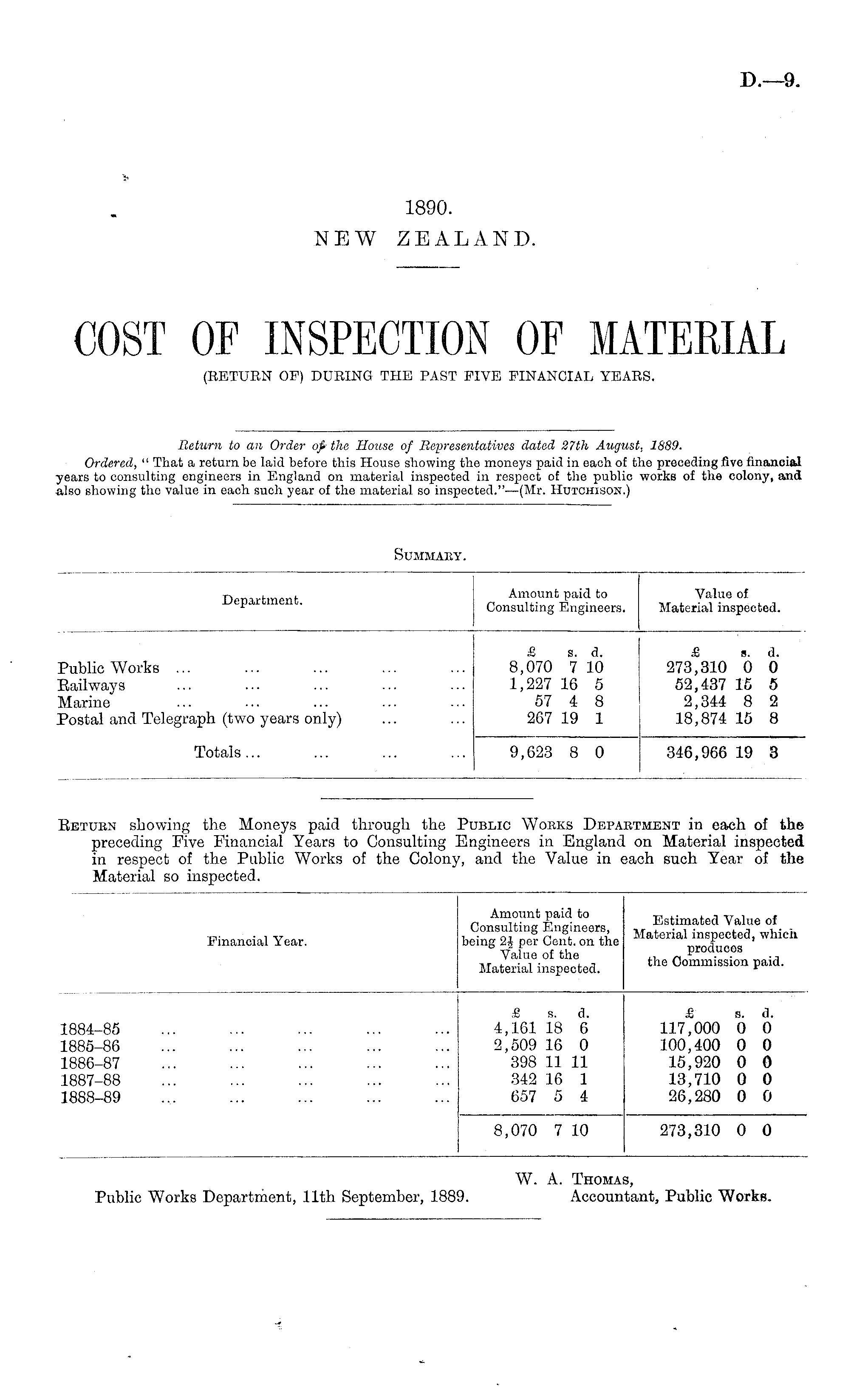Return to an Order op- the House of Representatives dated 27th August, 1889. Ordered, " That a return bo laid before this House showing the moneys paid in each of the preceding five financial years to consulting engineers in England on material inspected in respect of the public works of the colony, and also showing the value in each such year of the material so inspected."—(Mr. Hutchison.)