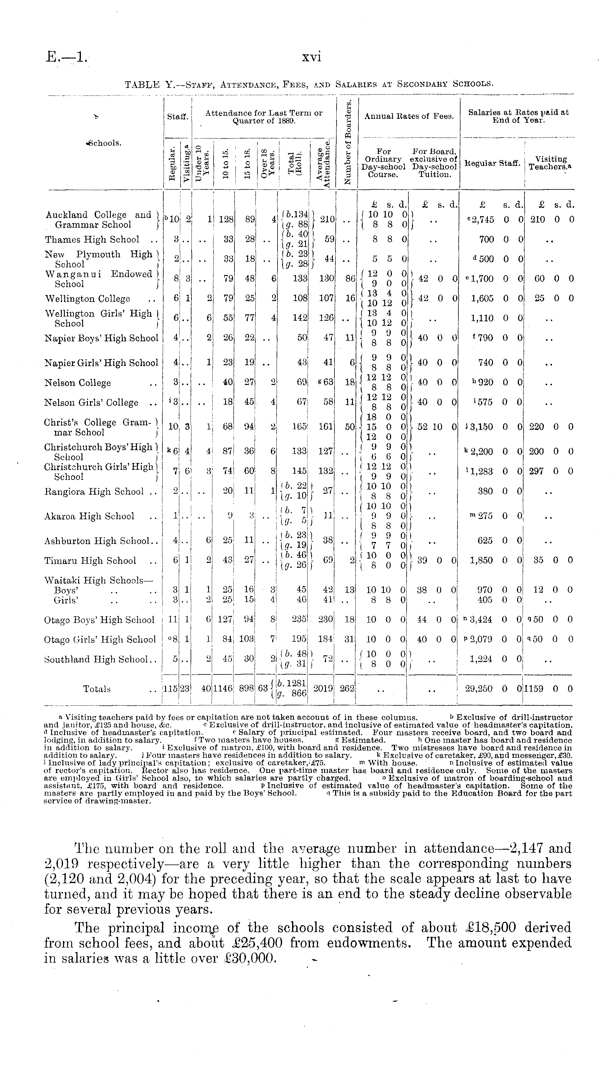 > ■Bcliools. Staff. If Attendi 1 nice for Last Term or Juarter of 1889. 1 ' < CO § M o ft Annual Eates of Fees. Salaries at Bi End of btes paid at Year. ® cS O For For Board, Ordinary exclusive of Day-school Day-school Course. Tuition. Kegular Staff. Visiting Teachers.a k, s. d. ! io io o ]880 £ s. d. £ s. a. £ s. d. Auckland College and ) Grammar School »10i 128 89j f 6.184 to. 88| \b. 40 Iff- 21 I b. 23| \g. 28 }210 | 59 ;. 44 1 "■ «2,745 0 0 I 210 0 0 Thames High School .. 3 33 28 8 8 0 700 0 0 I New Plymouth High ) School )' Wanganui Endowed ) School J 33 79 18J 48 6 86 5 5 0 [ 12 0 0 18 0 0 I 13 4 0 ( 10 12 0 [ 13 4 0 t 10 12 0 (990 1 8 8 0 '■ 42 0 0 I 42 0 0 ) j j 40 0 0 4 500 0 0 * 1,700 0 0 I I 60 0 0 3 183 130 Wellington College 2 79 25 2 108 107 16 1,605 0 Oi i! 25 0 0 Wellington Girls' High I School j I (i 55 77 142 126 1,110 0 0 i Napier Boys' High School 26 sal 50 47 11 1 790 0 0 Napier Girls' High School 23 19 43j 41 6 19 9 0 (880 j 12 12 0 (880 ] 12 12 0 (880 18 O 0 15 0 0 ( 12 0 0 | 9 9 0 '(660 f 12 12 0 t 9 9 0 ( 10 10 0 "(880 ( 10 10 0 • 9 9 0 (880 (990 '(770 ( 10 0 0 "( 8 0 0 I 40 0 0 1 40 0 0 I 40 0 0 [ 52 10 0 J ) j " ) I j I " I )' j 39 0 0 740 0 0 i > t Nelson College 40 27J 2 69J «68 18 b 920 0 0 .. Nelson Girls' College '3 18 45 4 67j 58 11 '575 0 0 Christ's College Gram- 1 mar School 10, 68 94! 2 165 101 50 ' 3,150 0 0 | 220 0 0 dhristchurch Boys'High ] School ) Ohristchurch Girls' High j School j *6 87 36 6 133: 127 k 2,200 0 0 ■ 200 0 0 6 3 u\ 60 1 8 145 132 '1,283 0 0 297 0 0 Bangiora High School .. 2 20 11 1 ib. 22 (jr. 10 t 27 380 0 0 ikaroa High School 9 3 16. 7! \\g- s ;■» m 275 0 0 ishburton High School.. 6 25 11 ; I 6. 23 \(9- 19 16. 46 \g. 26 j- | G9 625 0 0< .. rimaru High School 2 43 27 2 1,850 0 0 j 35 0 0 6 VVaitaki High Schools — Boys' Girls' 3 3 1 1 2 25 2 5 | 16 ! 15 31 4! I 45! 4C! 421 411 13 10 10 0 8 8 0 38 0 0: 970 0 0 405 0 0 12 0 0 j Dtago Boys' High School 11 6 127 | 94 23oi i 230 18 10 0 0 44 0 0 "3,424 0 0 ' 150 0 0 3tago Girls' High School °8 84| I ! 108 I j 195 ; 184 31 10 0 0 1 40 0 0 I P 2,079 0 0. ' t 50 0 0 Southland High School.. 5 2 45! I 30 2! I , i b. 48j \\g- si| 6.1281! \g. 866! 12 i i (10 0 0 I 8 0 0 ) )' " 1,224 0 0, [ 63{ ' r Totals 115 23 11146! ! 898i i i 2019, i 262 i : 29,250 0 0 |1159 0 0 40