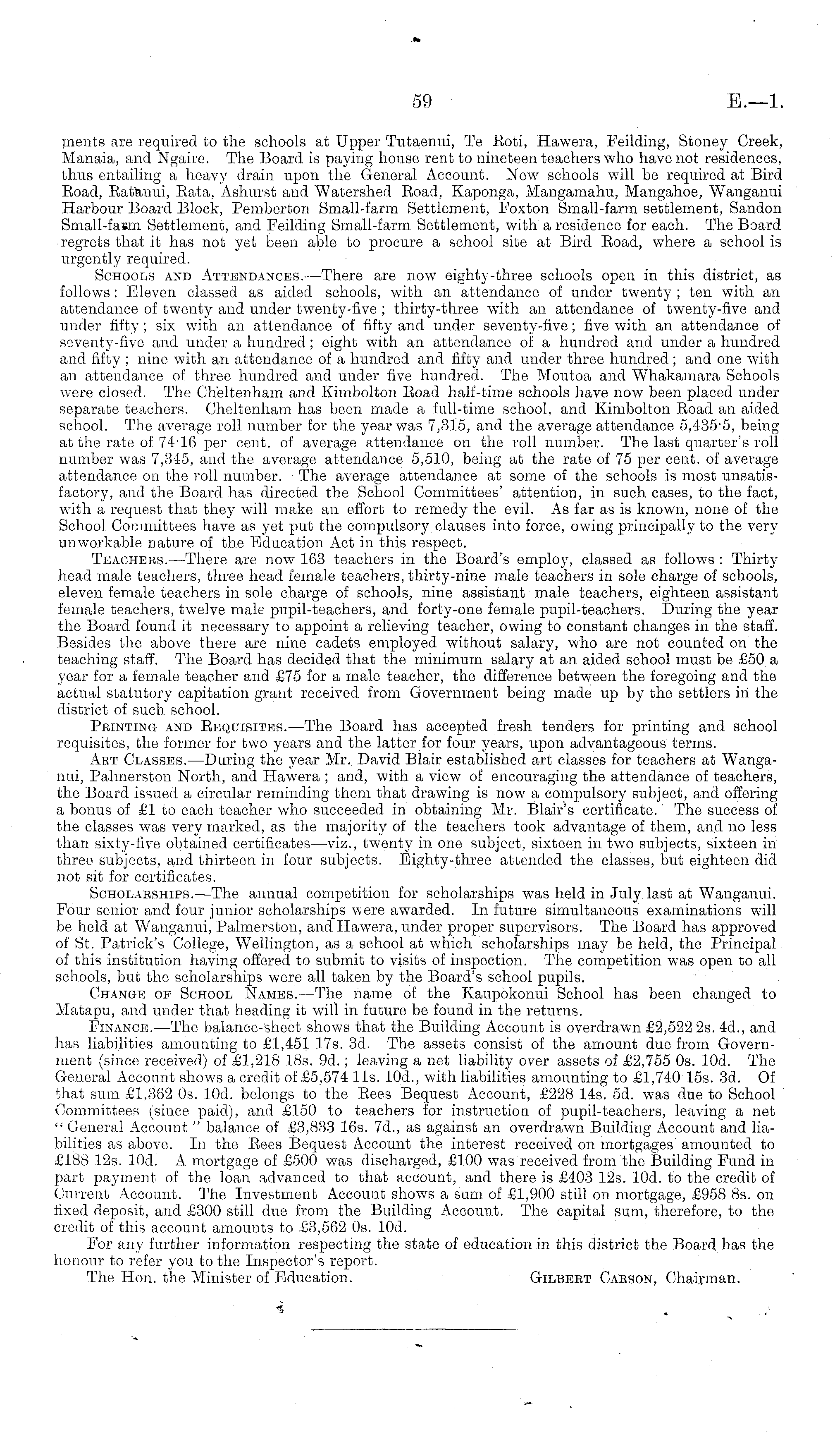 ments are required to the schools at Upper Tutaenui, Te Roti, Havvera, Feilding, Stoney Creek, Manaia, and Ngaire. The Board is paying house rent to nineteen teachers who have not residences, thus entailing a heavy drain upon the General Account. New schools will be required at Bird Eoad, BatUnui, Eata, Ashurst and Watershed Road, Kaponga, Mangamahu, Mangahoe, Wanganui Harbour Board Block, Pemberton Small-farm Settlement, Foxton Small-farm settlement, Sandon Small-fawn Settlement, and Feilding Small-farm Settlement, with a residence for each. The Board ■ regrets that it has not yet been able to procure a school site at Bird Road, where a school is urgently required. Schools and Attendances.—There are now eighty-three schools open in this district, as follows: Eleven classed as aided schools, with an attendance of under twenty ; ten with an attendance of twenty and under twenty-five ; thirty-three with an attendance of twenty-five and under fifty; six with an attendance of fifty and under seventy-five; five with an attendance of seventy-five and under a hundred ; eight with an attendance of a hundred and under a hundred and fifty ; nine with an attendance of a hundred and fifty and under three hundred ; and one with an attendance of three, hundred and under five hundred. The Moutoa and Whakamara Schools were closed. The Cheltenham and Kimbolton Road half-time schools have now been placed under separate teachers. Cheltenham has been made a full-time school, and Kimbolton Road an aided school. The average roll number for the year was 7,315, and the average attendance 5,435-5, being at the rate of 74-16 per cent, of average attendance on the roll number. The last quarter's roll number was 7,345, and the average attendance 5,510, being at the rate of 75 per cent, of average attendance on the roll number. The average attendance at some of the schools is most unsatisfactory, and the Board has directed the School Committees' attention, in such cases, to the fact, with a request that they will make an effort to remedy the evil. As far as is known, none of the School Committees have as yet put the compulsory clauses into force, owing principally to the very unworkable nature of the Education Act in this respect. Teacheks.—There are now 163 teachers in the Board's employ, classed as follows : Thirtj' head male teachers, three head female teachers, thirty-nine male teachers in sole charge of schools, eleven female teachers in sole charge of schools, nine assistant male teachers, eighteen assistant female teachers, twelve male pupil-teachers, and forty-one female pupil-teachers. During the year the Board found it necessary to appoint a relieving teacher, owing to constant changes in the staff. Besides the above there are nine cadets employed without salary, who are not counted on the teaching staff. The Board has decided that the minimum salary at an aided school must be £50 a year for a female teacher and £75 for a male teacher, the difference between the foregoing and the actual statutory capitation grant received from Government being made up by the settlers in the district of such school. Printing and Requisites.—The Board has accepted fresh tenders for printing and school requisites, the former for two years and the latter for four years, upon advantageous terms. Art Classes.—During the year Mr. David Blair established art classes for teachers at Wanganui, Palmerston North, and Hawera ; and, with a view of encouraging the attendance of teachers, the Board issued a circular reminding them that drawing is now a compulsory subject, and offering a bonus of £1 to each teacher who succeeded in obtaining Mr. Blair's certificate. The success of the classes was very marked, as the majority of the teachers took advantage of them, and no less than sixty-five obtained certificates —viz., twenty in one subject, sixteen in two subjects, sixteen in three subjects, and thirteen in four subjects. Eighty-three attended the classes, but eighteen did not sit for certificates. Scholaeships.—The annual competition for scholarships was held in July last at Wanganui. Four senior and four junior scholarships were awarded. In future simultaneous examinations will be held at Wanganui, Palmerston, and Hawera, under proper supervisors. The Board has approved of St. Patrick's College, Wellington, as a school at which scholarships may be held, the Principal of this institution having offered to submit to visits of inspection. The competition was open to all schools, but the scholarships were all taken by the Board's school pupils. Change of School Names. —The name of the Kaupokonui School has been changed to Matapu, and under that heading it will in future be found in the returns. Finance.—The balance-sheet shows that the Building Account is overdrawn £2,522 2s. 4d., and has liabilities amounting to £1,451 17s. 3d. The assets consist of the amount due from Government (since received) of £1,218 18s. 9d.; leaving a net liability over assets of £2,755 os. lOd. The General Account shows a credit of £5,574 11s. 10d., with liabilities amounting to £1,740 15s. 3d. Of that sum £1,362 os. lOd. belongs to the Rees Bequest Account, £228 14s. sd. was due to School Committees (since paid), and £150 to teachers for instruction of pupil-teachers, leaving a net "General Account " balance of £3,833 16s. 7d., as against an overdrawn Building Account and liabilities as above. In the Rees Bequest Account the interest received on mortgages amounted to £188 12s. lOd. A mortgage of £500 was discharged, £100 was received from the Building Fund in part payment of the loan advanced to that account, and there is £403 12s. lOd. to the credit of Current Account. The Investment Account shows a sum of £1,900 still on mortgage, £958 Bs. on fixed deposit, and £300 still due from the Building Account. The capital sum, therefore, to the credit of this account amounts to £3,562 os. lOd. For any further information respecti