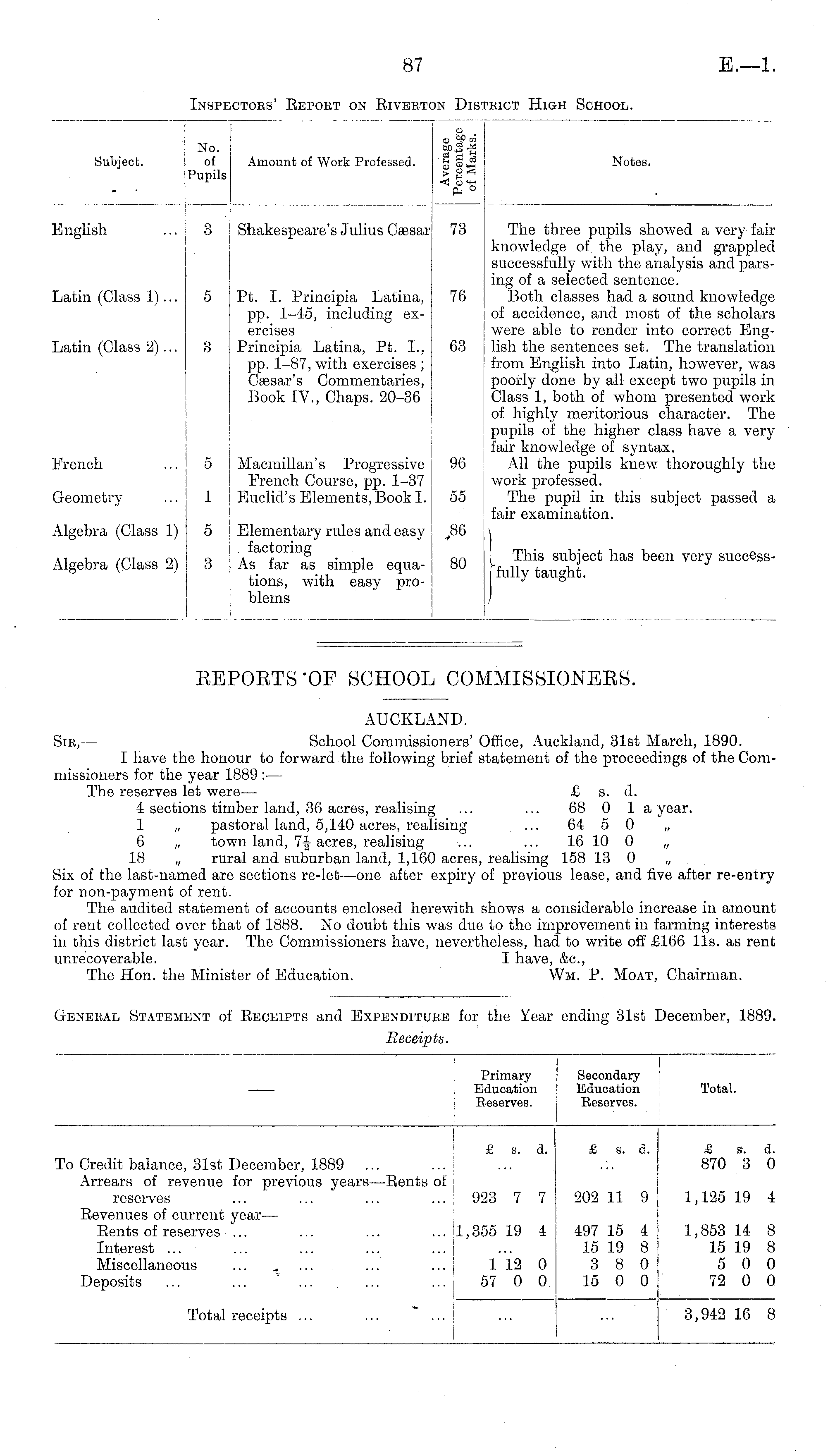 AUCKLAND. Sib, — School Commissioners' Office, Aucklaud, 31st March, 1890. I have the honour to forward the following brief statement of the proceedings of the Commissioners for the year 1889 : — The reserves let were — £ s. d. 4 sections timber land, 36 acres, realising ... ... 68 0 1 a year. 1 „ pastoral land, 5,140 acres, realising ... 64 5 0 „ 6 „ town land, 7-J acres, realising ... ... 16 10 0 „ 18 „ rural and suburban land, 1,160 acres, realising 158 13 0 „ Six of the last-named are sections re-let —one after expiry of previous lease, and five after re-entry for non-payment of rent. The audited statement of accounts enclosed herewith shows a considerable increase in amount of rent collected over that of 1888. No doubt this was due to the improvement in farming interests in this district last year. The Commissioners have, nevertheless, had to write off £166 11s. as rent unrecoverable. I have, &c, The Hon. the Minister of Education. Wm. P. Moat, Chairman.