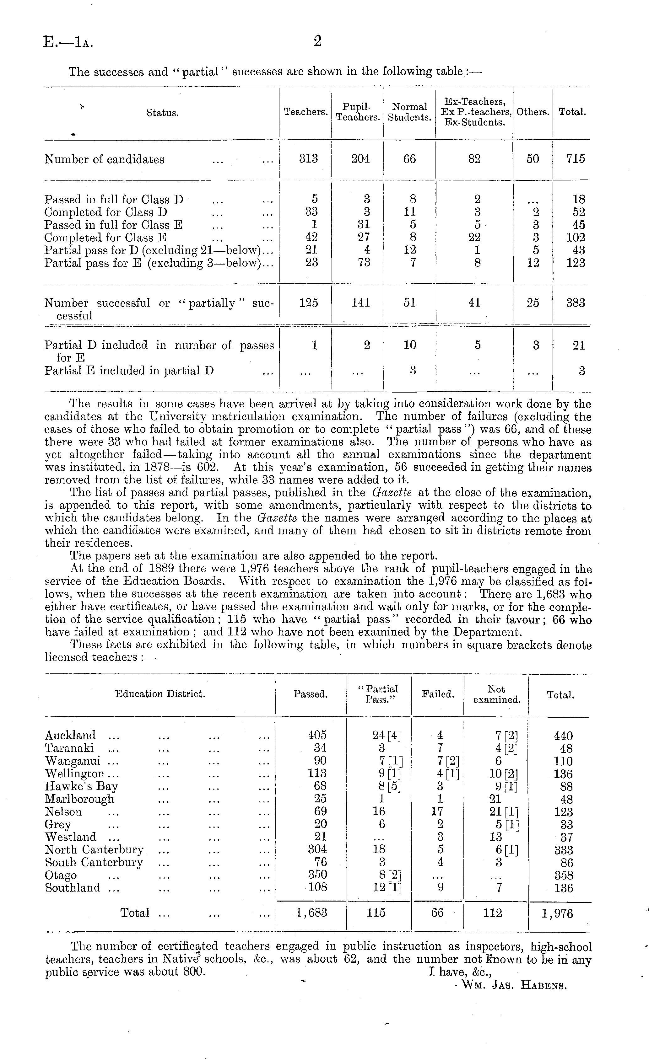 The number of certificated teachers engaged in public instruction as inspectors, high-school teachers, teachers in Native' schools, &c, was about 62, and the number not Known to be in any public service was about 800. I have, &c, Wm. Jas. Habens.