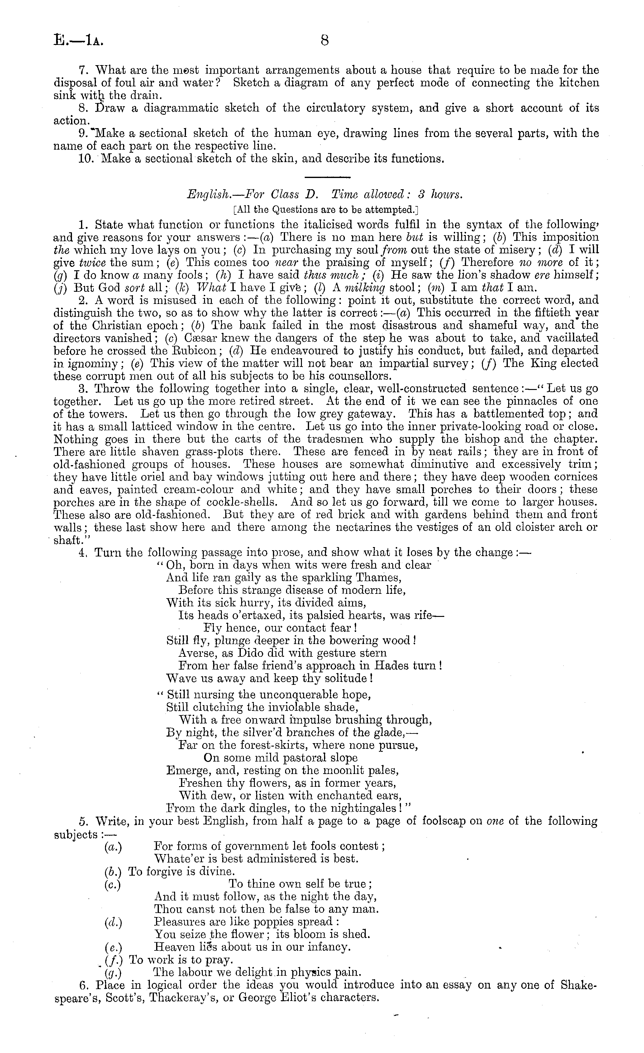 English. — For Glass D. Time, allowed: 3 hours. [All the Questions are to be attempted.] 1. State what function or functions the italicised words fulfil in the syntax of the following' and give reasons for your answers :■ — (a) There is no man here but is willing; (6) This imposition the which my love lays on you; (c) In purchasing my soul from out the state of misery; (d) I will give tivice the sum; (c) This comes too near the praising of myself; (/) Therefore no more of it; (g) Ido know a many fools ; (Ji) I have said thus much; (i) He saw the lion's shadow ere himself; (j) But God sort all; (Jc) What I have I give; (I) A milking stool; (m) lam that I am. 2. A word is misused in each of the following: point it out, substitute the correct word, and distinguish the two, so as to show why the latter is correct: —(a) This occurred in the fiftieth year of the Christian epoch; (b) The bank failed in the most disastrous and shameful way, and the directors vanished; (c) Cassar knew the dangers of the step he was about to take, and vacillated before he crossed the Eubicon; (d) He endeavoured to justify his conduct, but failed, and departed in ignominy; (c) This view of the matter will not bear an impartial survey; (/) The King elected these corrupt men out of all his subjects to be his counsellors. 3. Throw the following together into a single, clear, well-constructed sentence: —" Let us go together. Let us go up the more retired street. At the end of it we can see the pinnacles of one of the towers. Let us then go through the low grey gateway. This has a battlemented top; and it has a small latticed window in the centre. Let us go into the inner private-looking road or close. Nothing goes in there but the carts of the tradesmen who supply the bishop and the chapter. There are little shaven grass-plots there. These are fenced in by neat rails; they are in front of old-fashioned groups of houses. These houses are somewhat diminutive and excessively trim; they have little oriel and bay windows jutting out here and there; they have deep wooden cornices and eaves, painted cream-colour and white; and they have small porches to their doors ; these porches are in the shape of cockle-shells. And so let us go forward, till we come to larger houses. These also are old-fashioned. But they are of red brick and with gardens behind them and front walls; these last show here and there among the nectarines the vestiges of an old cloister arch or shaft." 4. Turn the following passage into prose, and show what it loses by the change : —■ " Oh, born in days when wits were fresh and clear And life ran gaily as the sparkling Thames, Before this strange disease of modern life, With its sick hurry, its divided aims, Its heads o'ertaxed, its palsied hearts, was rife— Fly hence, our contact fear ! Still fly, plunge deeper in the bowering wood ! Averse, as Dido did with gesture stern From her false friend's approach in Hades turn! Wave us away and keep thy solitude ! " Still nursing the unconquerable hope, Still clutching the inviolable shade, With a free onward impulse brushing through, By night, the silver'd branches of the glade,— Far on the forest-skirts, where none pursue, On some mild pastoral slope Emerge, and, resting on the moonlit pales, Freshen thy flowers, as in former years, With dew, or listen with enchanted ears, From the dark dingles, to the nightingales! " 5. Write, in your best English, from half a page to a page of foolscap on one of the following subjects : — (a.) For forms of government let fools contest; Whate'er is best administered is best. (6.) To forgive is divine, (c.) To thine own self be true; And it must follow, as the night the day, Thou canst not then be false to any man. (d.) Pleasures are like poppies spread : You seize the flower; its bloom is shed, (c.) Heaven lies about us in our infancy. (/.) To work is to pray. (g.) The labour we delight in physics pain. 6. Place in logical order the ideas you would introduce into an essay on any one of Shakespeare's, Scott's, Thackeray's, or George Eliot's characters.